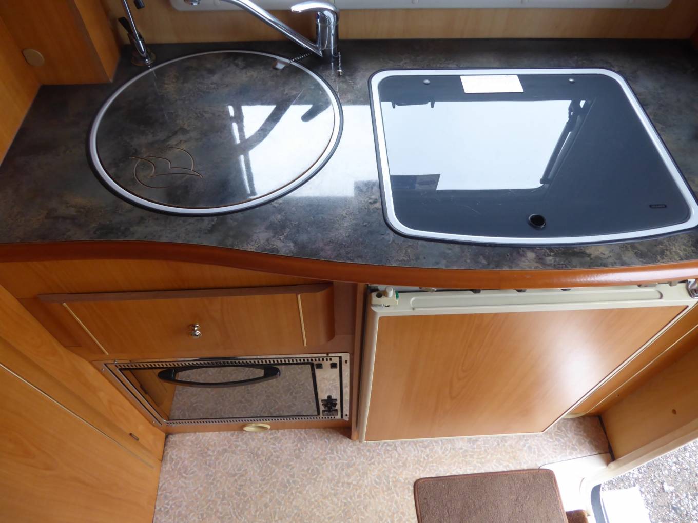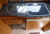 The kitchen is at the rear with 3 burners, there is lots of storage cupboards for all your kitchen needs. Vehicle has rear axle suspension bags retro-fitted