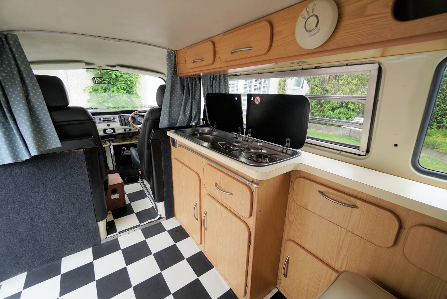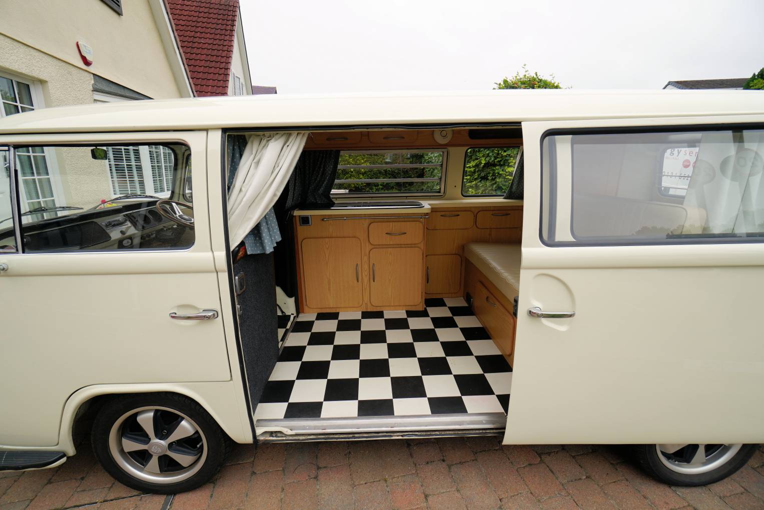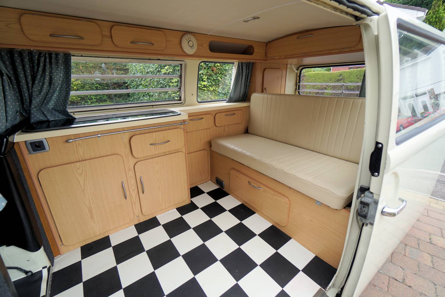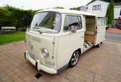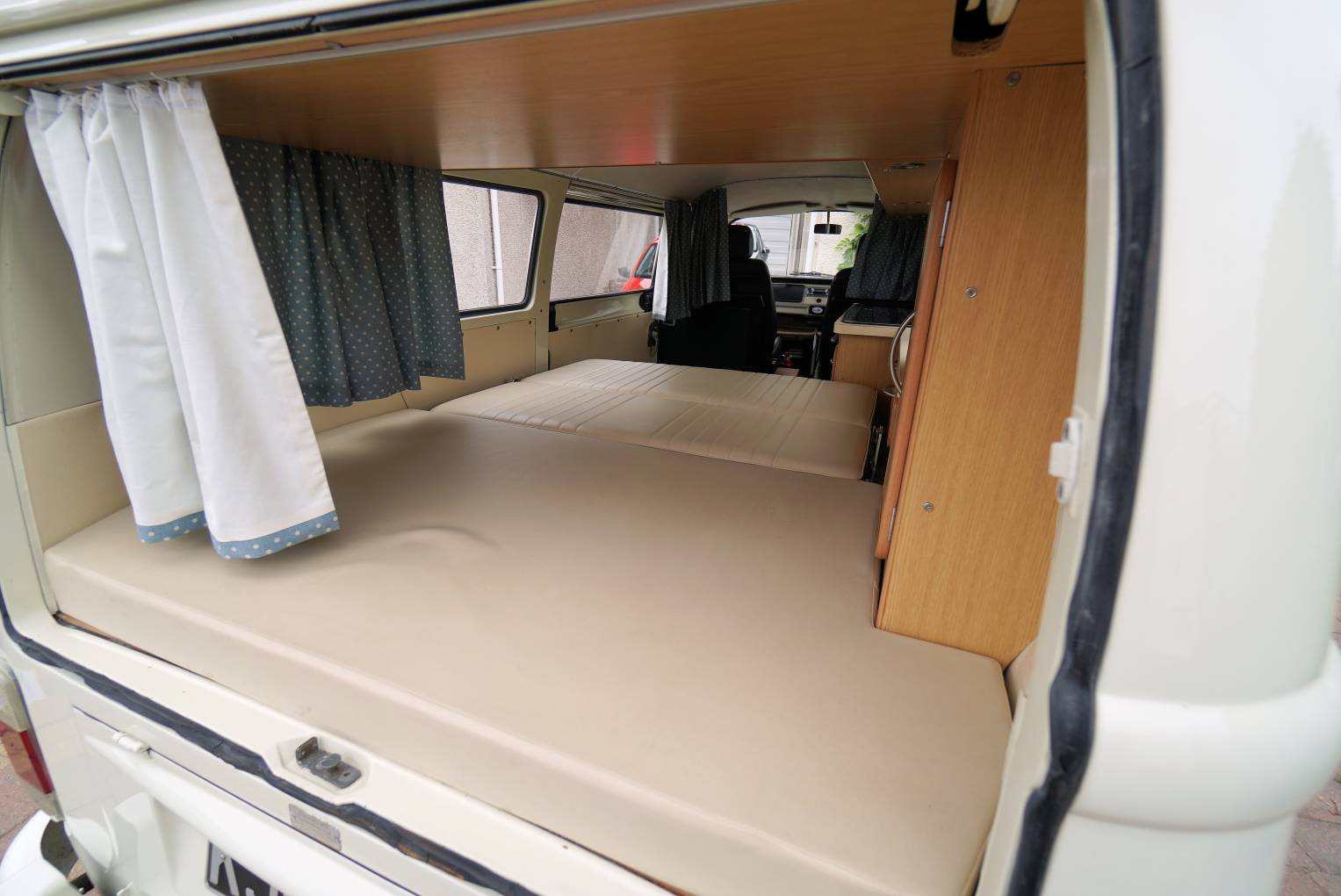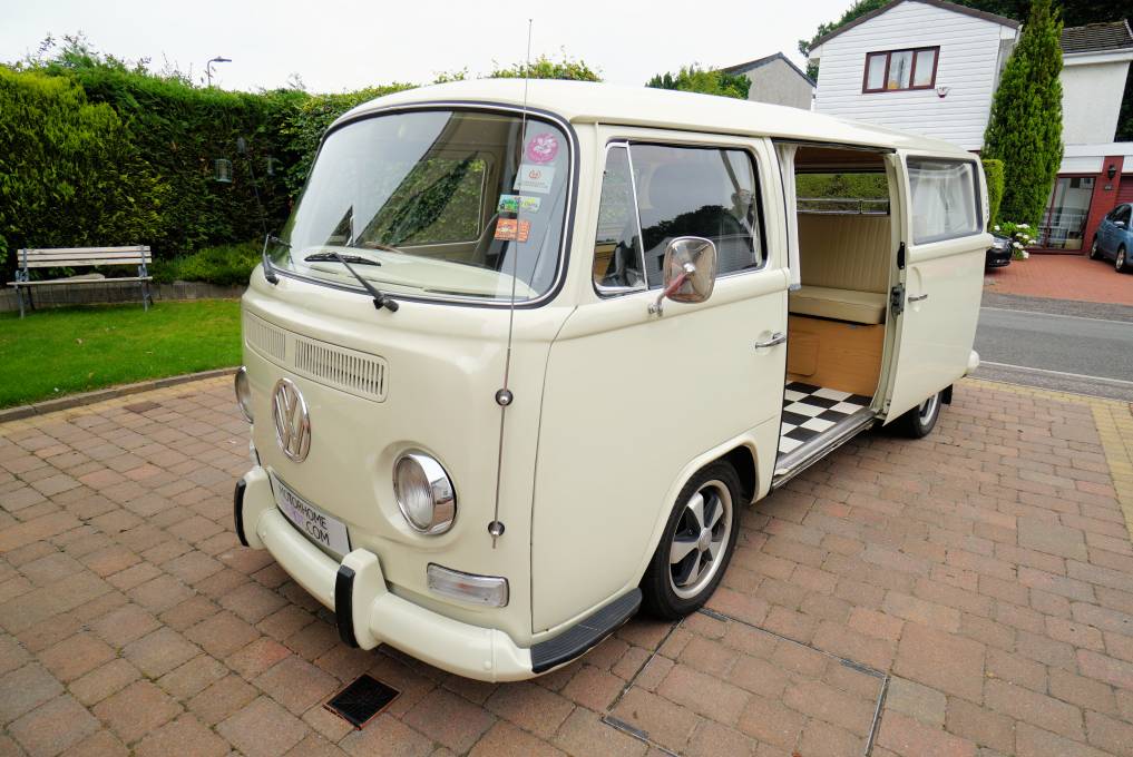 For sale we have this lovely, 1972 VW T2 Campervan with less than 60,000 miles on the clock, finished in gleaming cream paintwork that is in superb condition inside and out. The body work looks in solid condition and the recent re-spray has been completed to a very high standard by a local company. This campervan conversion was completed by the well-known Danbury company with the interior units finished in a light wood effect. It has a 2-burner hob, running cold water, 240v/12v sockets, table and a double rock and roll bed finished in matching cream leather. She has been stored in a dry garage and is only being advertised as the present owner is moving house with no garage available.