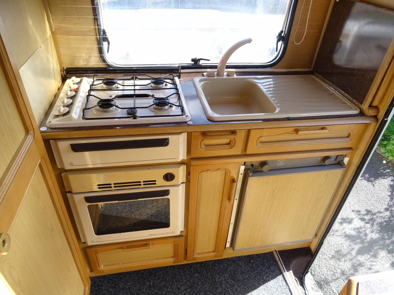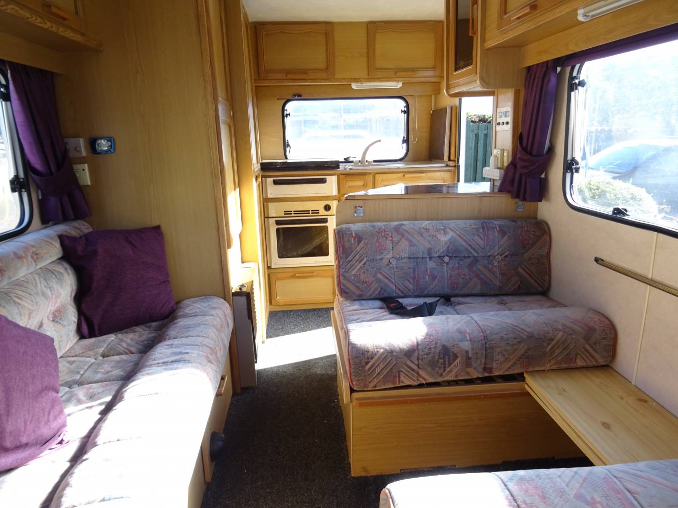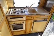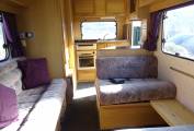 At the far end is the kitchen which has a 3 gas burner hob, a gas oven and grill, a 3 way fridge with ice compartment, a sink with a mixer tap and storage space in the overhead lockers.