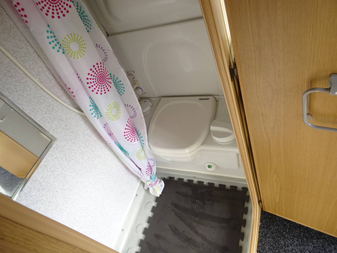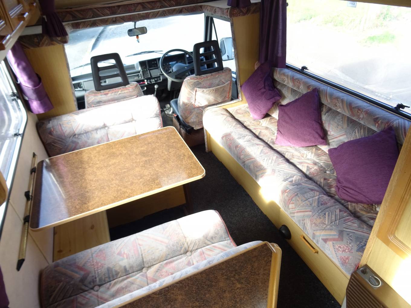 The washroom which is situated towards the rear has a shower head built into the tap, a cassette toilet, a mirror, plenty of storage space for your toiletries and a bathroom window which throws in plenty of light. As you move down the motorhome the lounge and dinette area features a forward facing 2 seater sofa fitted with 2 seat belts, a rear facing 2 seater and a long side facing sofa which between them will easily seat 5 or 6 people in comfort. The dining table attaches to the side rail and this can be easily removed and stored away when not in use to give more of a lounge feel.