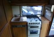 End kitchen is fully equipped with a 4 burner gas hob, oven, grill, sink and a 3 way fridge freezer. Your bathroom is compact and has a shower, cassette toilet. drop down sink and a vanity unit. The cocktail unit has extra work top and cupboard space. There is also a drop down leaf that goes across the habitation door which creates extra work surface or a bar. Excellent storage throughout the motorhome.