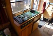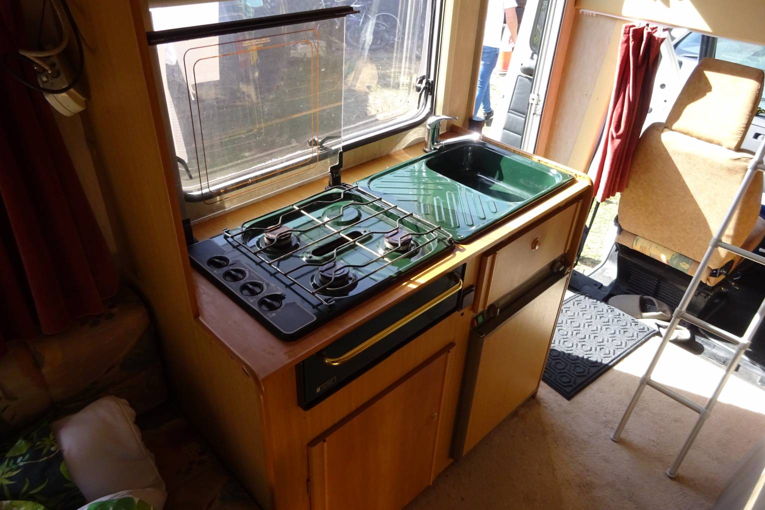 As you enter the motorhome there is the mid kitchen to your right. Which has sink with cold and hot running water, 3 t gas Hob and Grill, 3 way under counter fridge and ample storage space