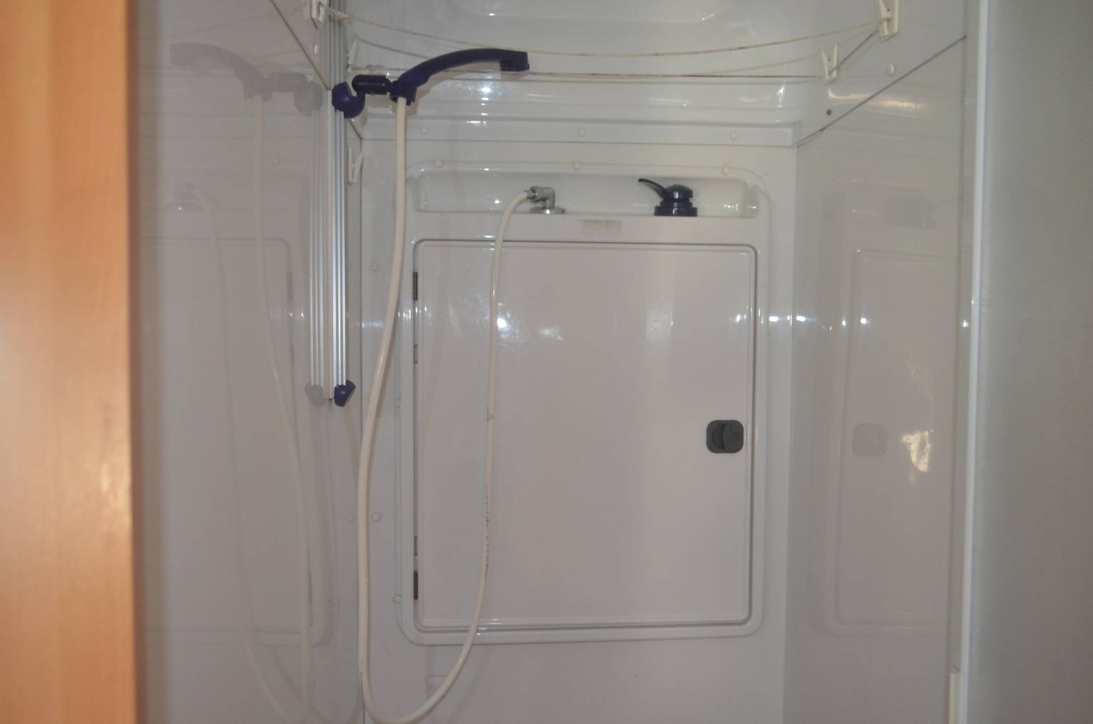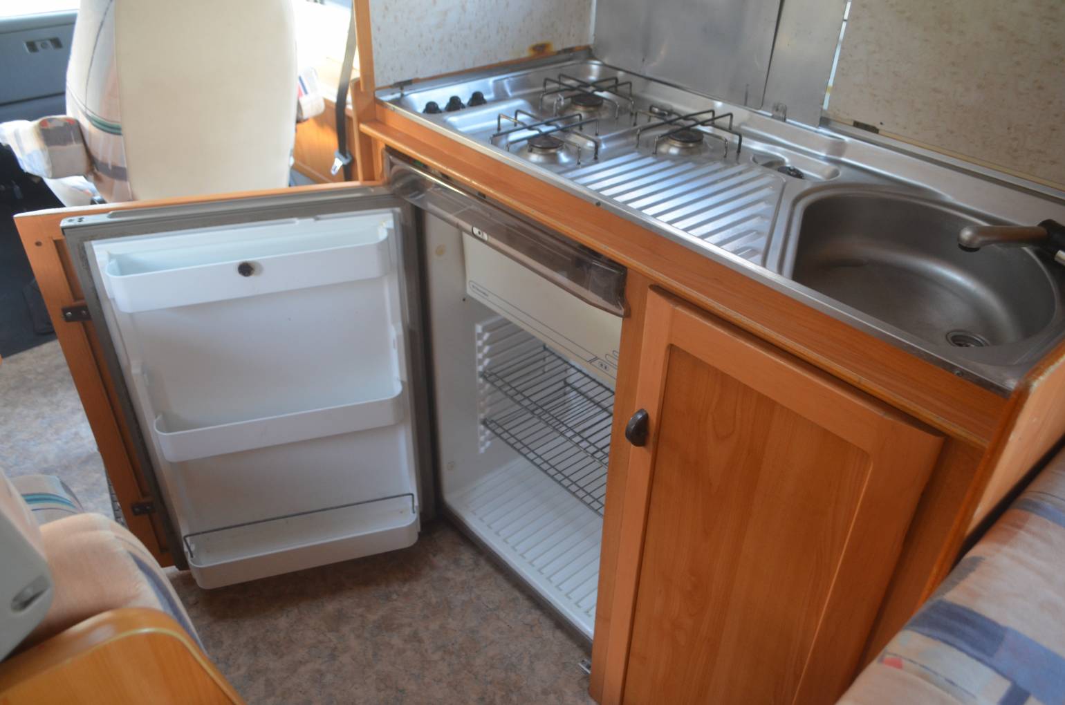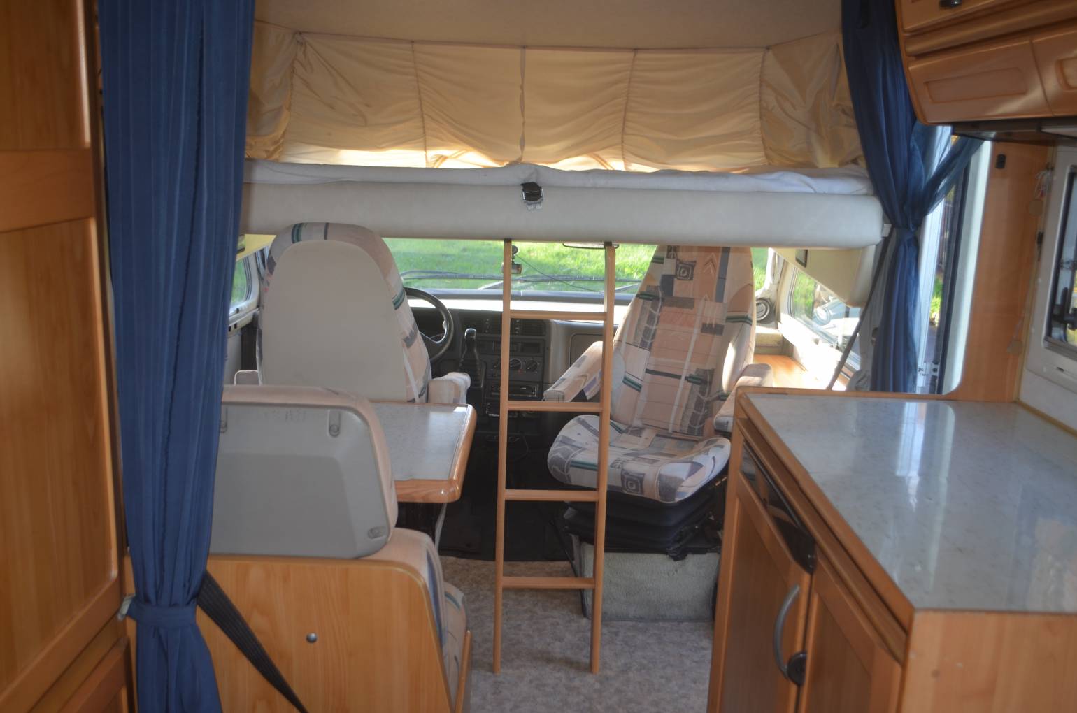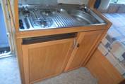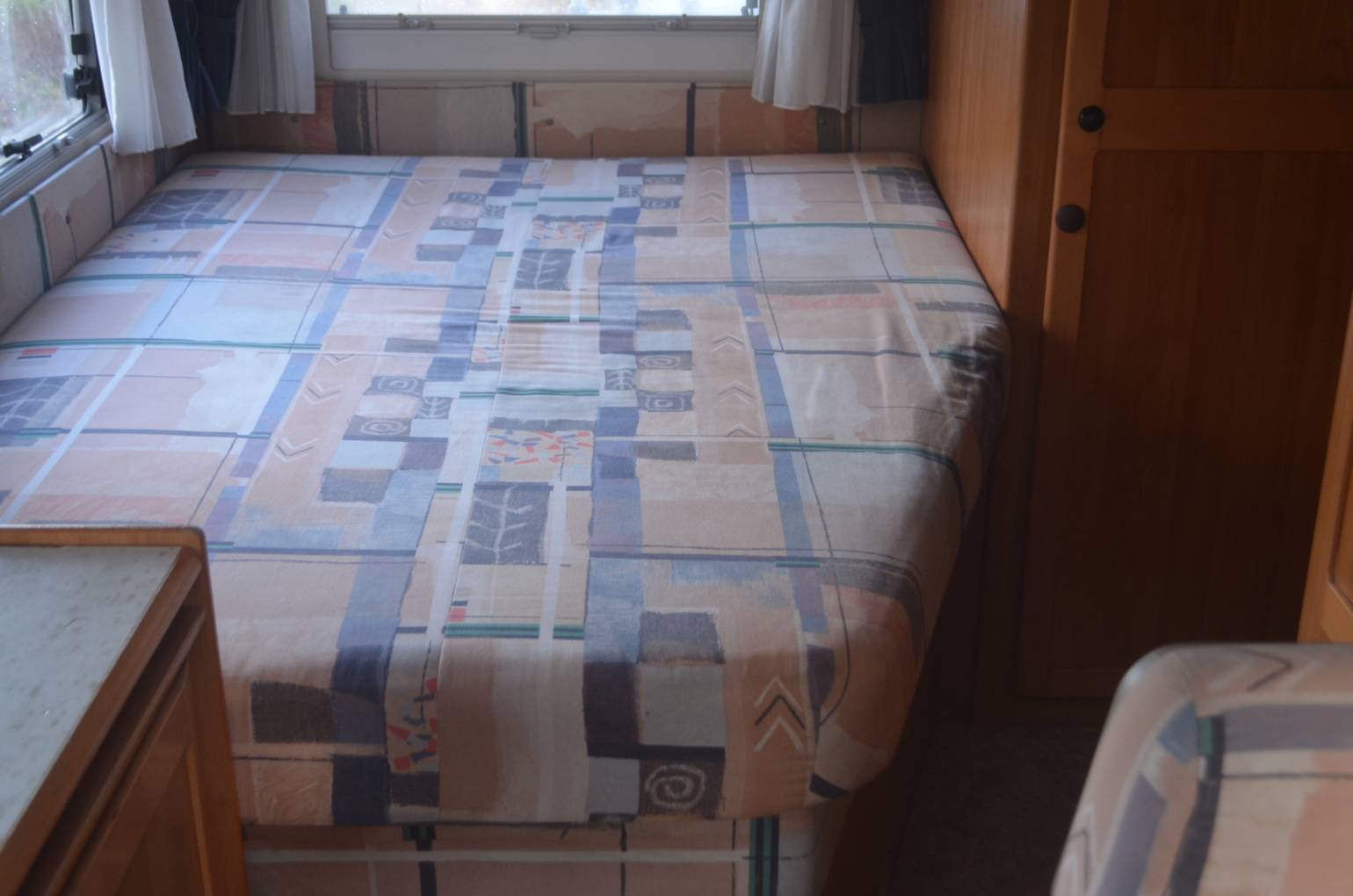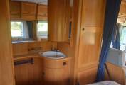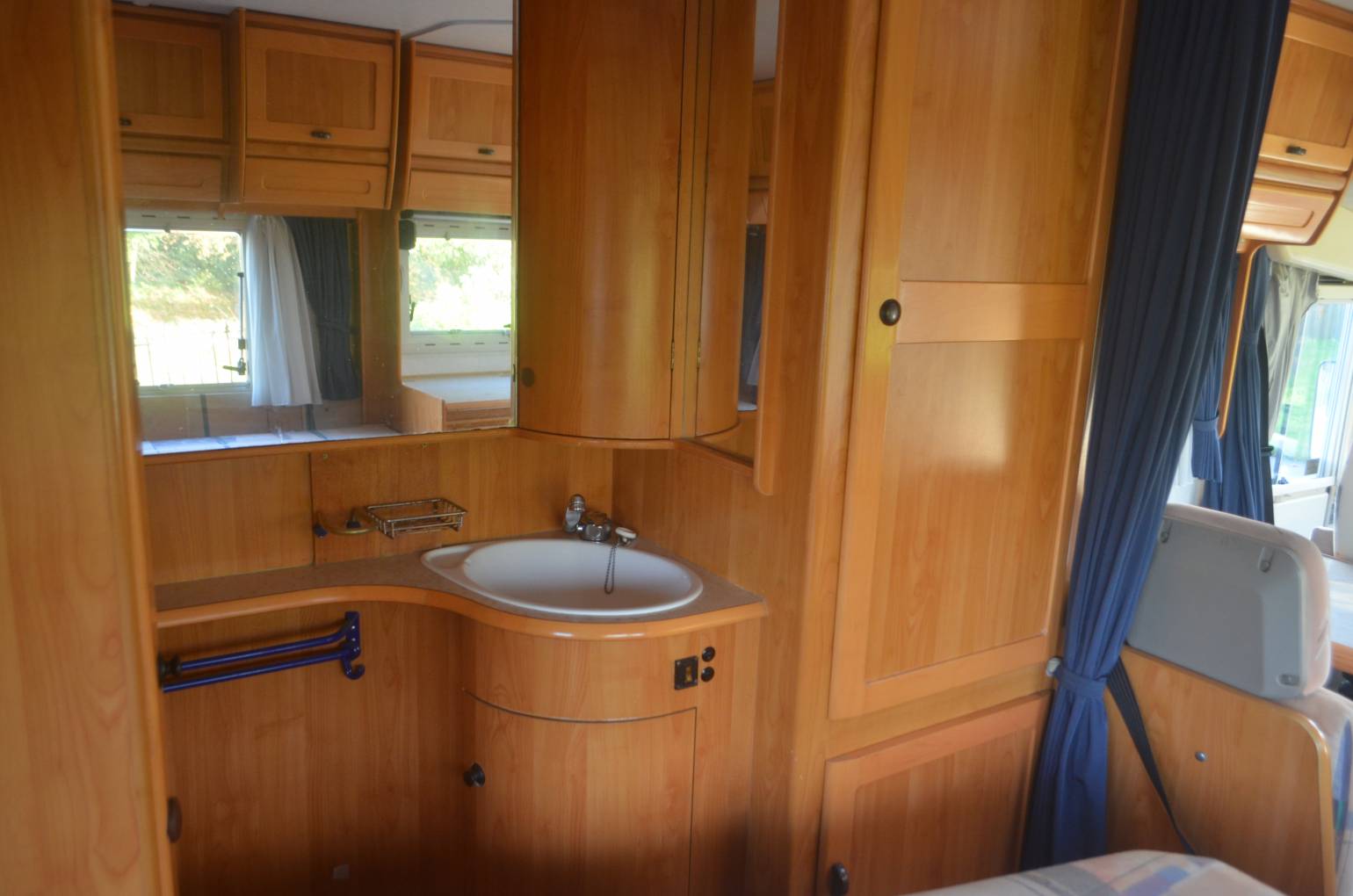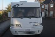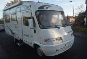1997 Hymer B574 FOR SALE. Presented in good condition throughout. Based on a 3400kg Fiat Ducato chassis with a 2.5 engine and 5 speed manual transmission. This left hand drive motorhome sleeps four people and has four travelling seatbelts. Timing belt and clutch have been replaced along with front brake pads. Standard features include a comfortable fixed bed at the rear with storage underneath. The corner washroom has a toilet and shower along with a built in wash hand basin and vanity mirror. Kitchen area has a three way fridge freezer, two gas burner hob and a sink along with a central dining area which has two swivelling captains chairs. Your drop down bed above the cab will accommodate two people and there is plenty of storage throughout the motorhome. The cab area is spacious and has cruise control, power assisted steering and a radio. Additional extras include a bicycle rack, Omnistor awning, USB ports, outdoor shower point, Tow bar and two solar panels. All the soft furnishings in great condition and are original.