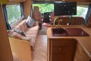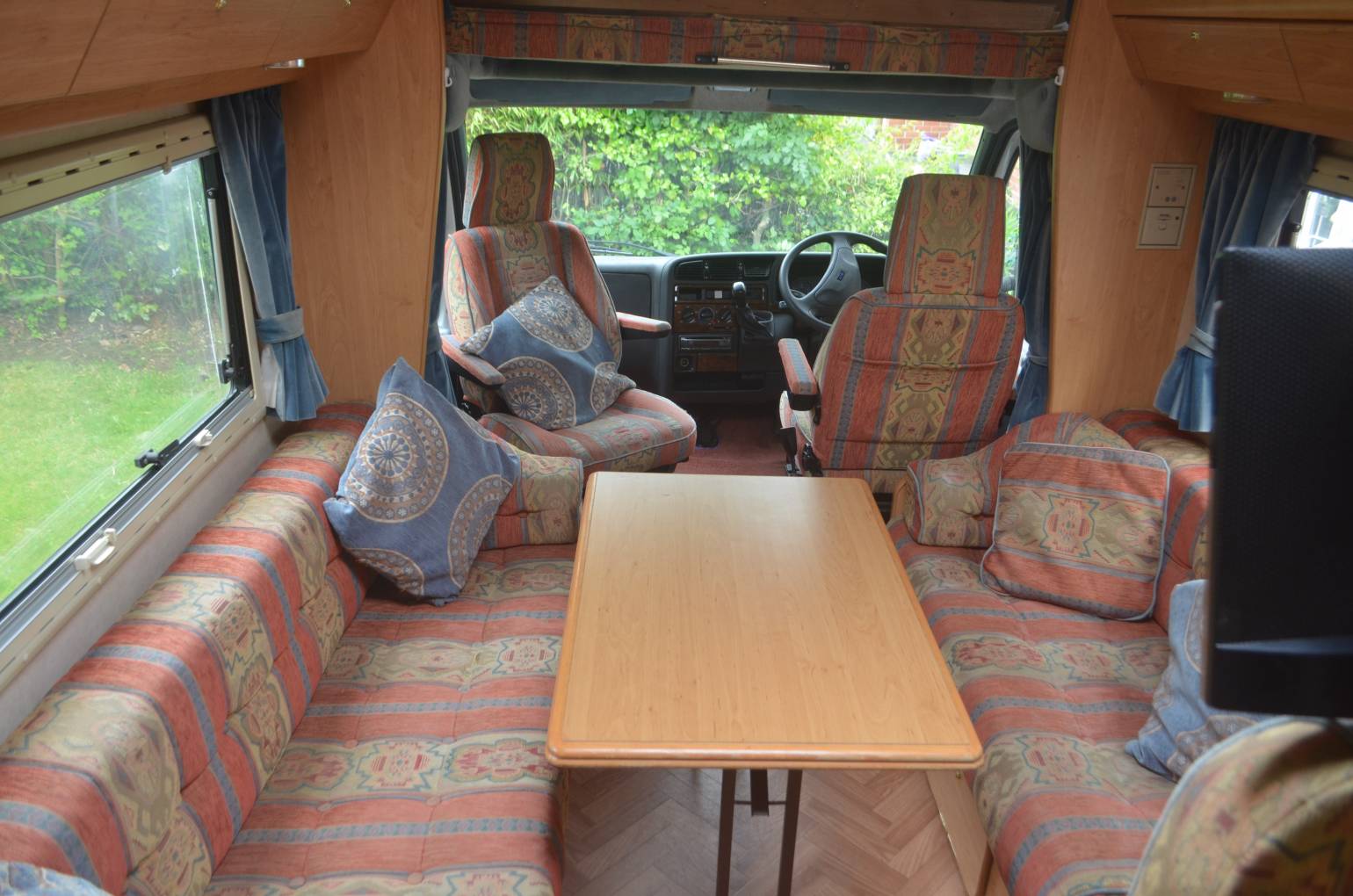Above the cab you have a large double bed and the other beds can be easily converted in the lounge area. The dining area is spacious and has a captains chair that will swivel round onto your dining table.