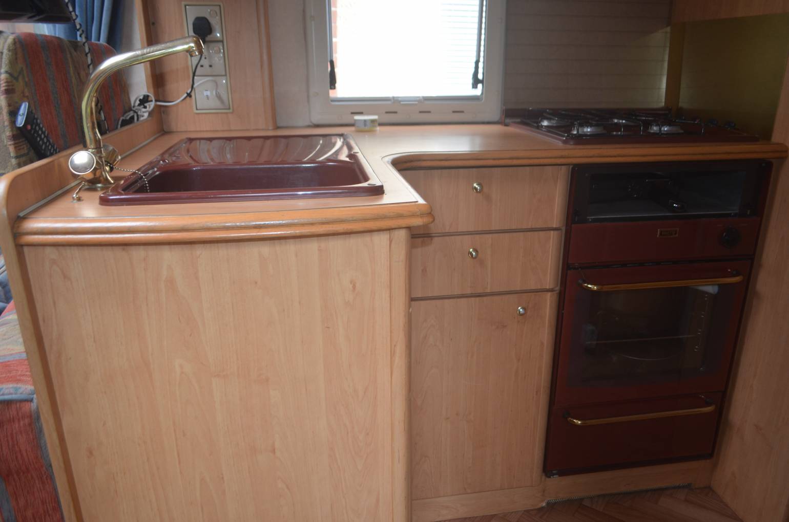 Mid ship kitchen is fully equipped with a full sized cooker, 3 burner gas hob, oven, grill, sink and a 3 way fridge freezer.
