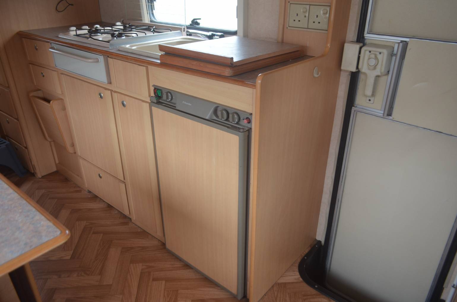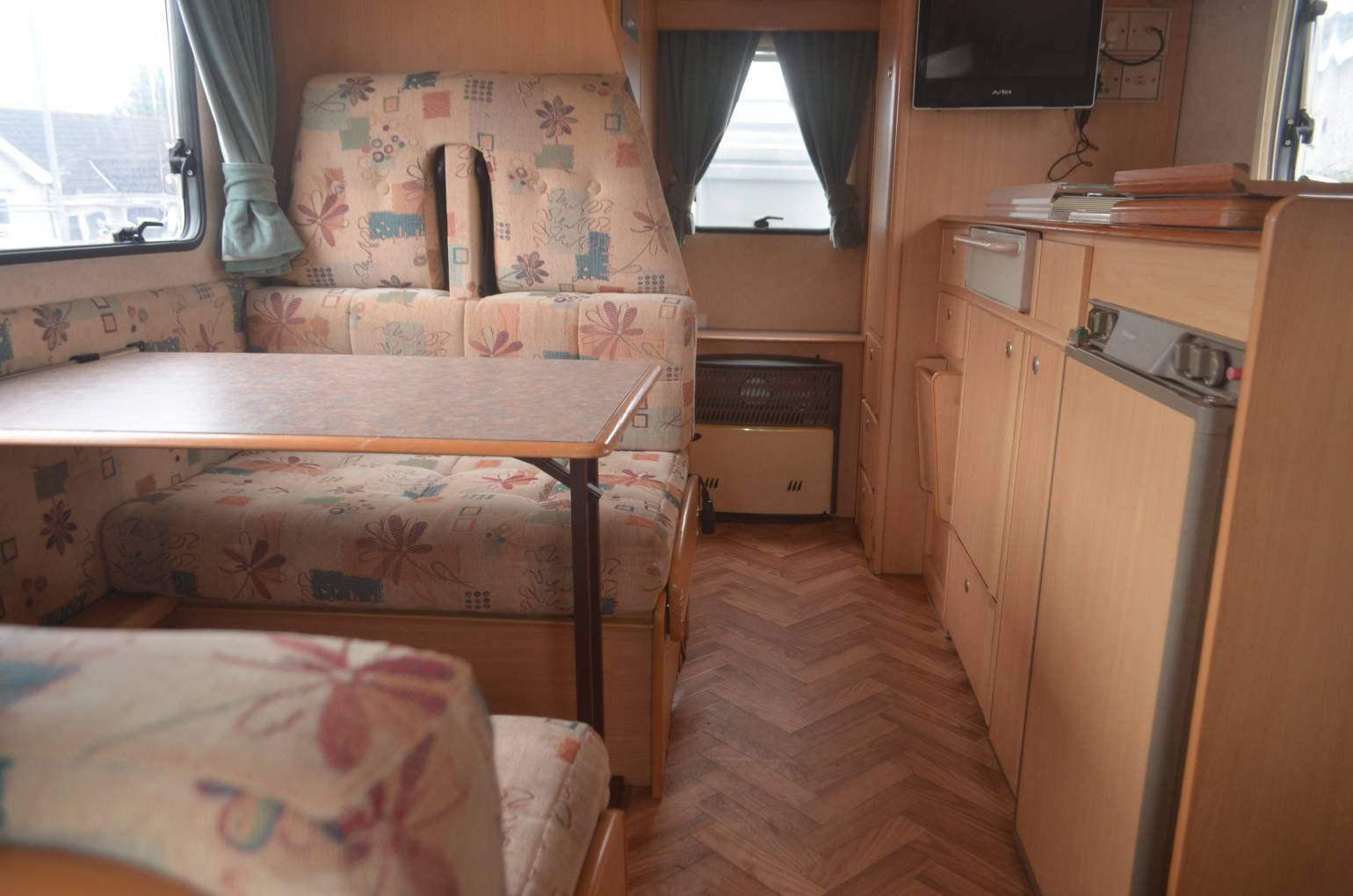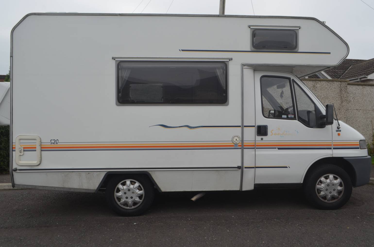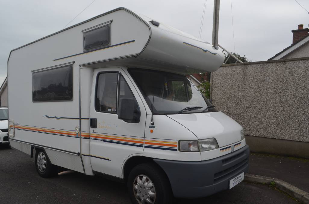 1999 SWIFT SUNDANCE 520 FOR SALE. This 4 berth layout with 4 travelling seat belts has all you need for a small family, or just the two of you. Based on a Fiat chassis with 1.9Td engine and 5 speed manual gear box. 75,487 miles travelled. At the rear is the bathroom with a shower and opposite this, the wardrobe which has the water heater directly underneath and there are three small drawers for storage. Extra storage throughout the habitation area. On the passenger side is the kitchen with a hob, grill, sink and three way fridge. Opposite is the social area that serves as the dinette and makes into a large double bed using the extensions. Up front is the cab with the over cab bed that pushes back to allow ease of access and sleeping places for another 2 people. This motorhome is compact in size and has a captains chair in the cab, power assisted steering and a radio. Extras fitted include a fiamma storage box fitted to the rear and a fiamma awning.