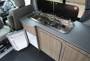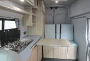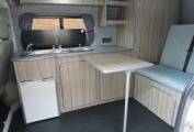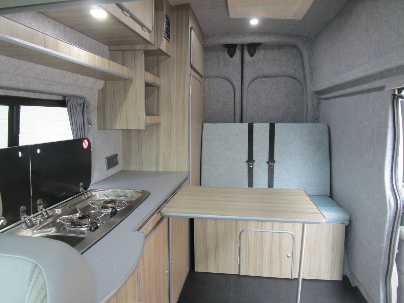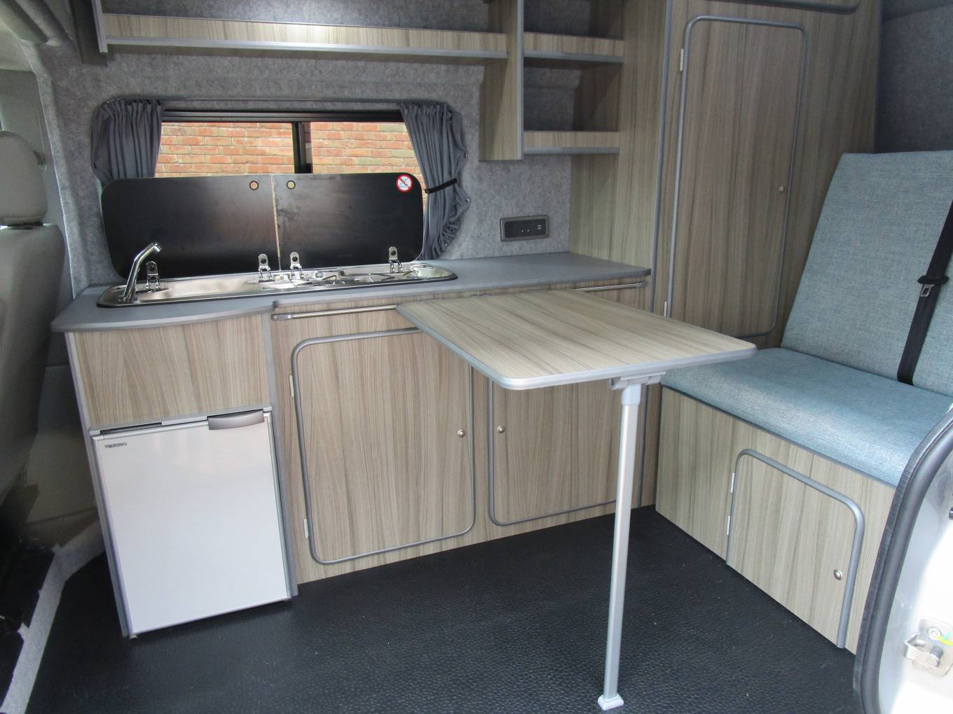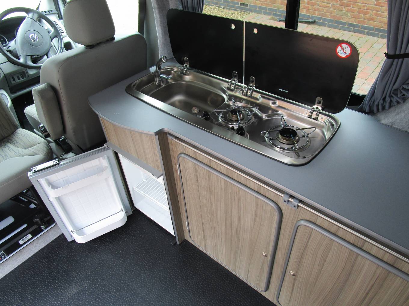 camper comes complete with a two-ring gas hob, sink with cold water, fridge