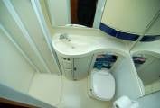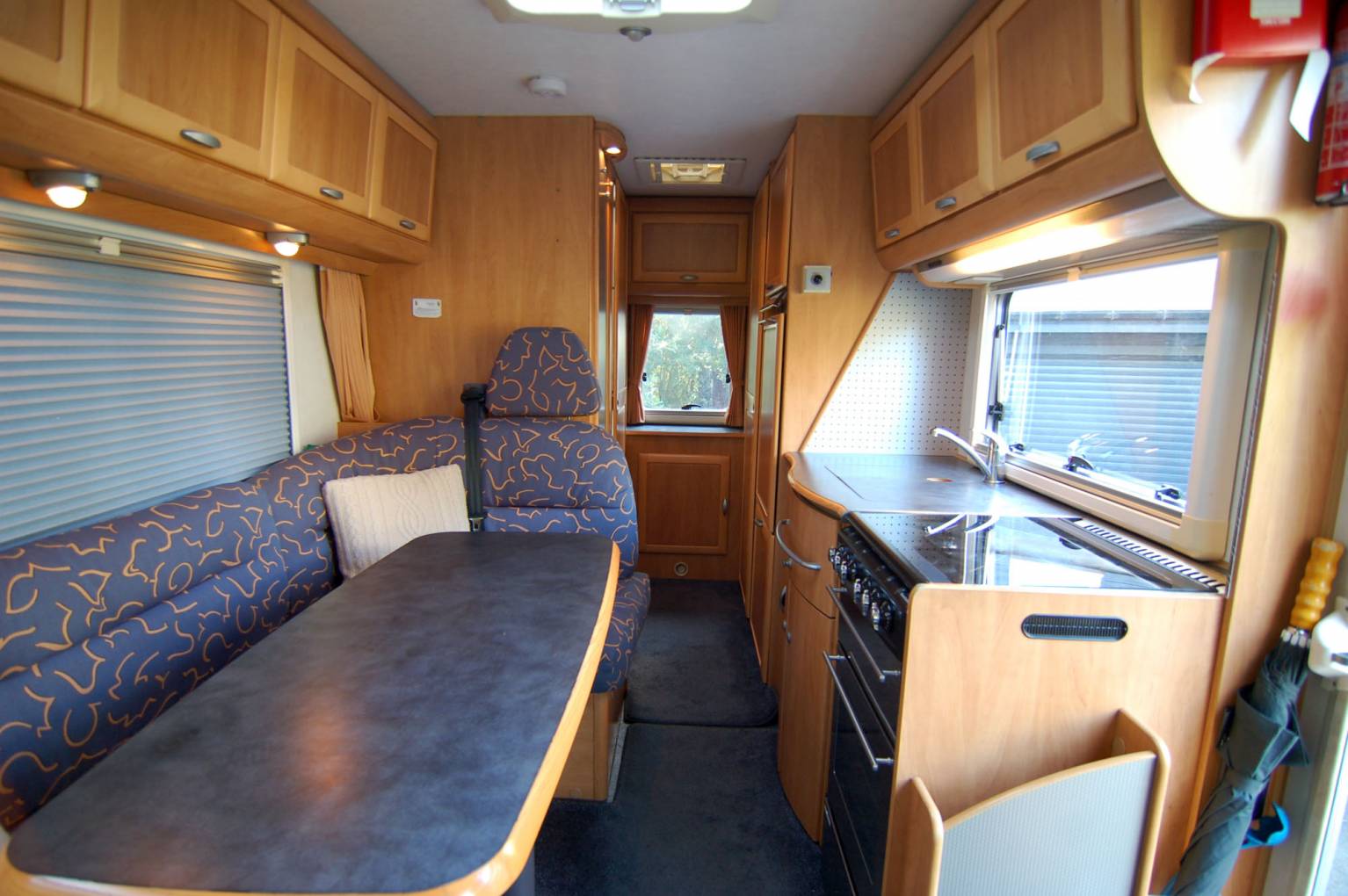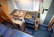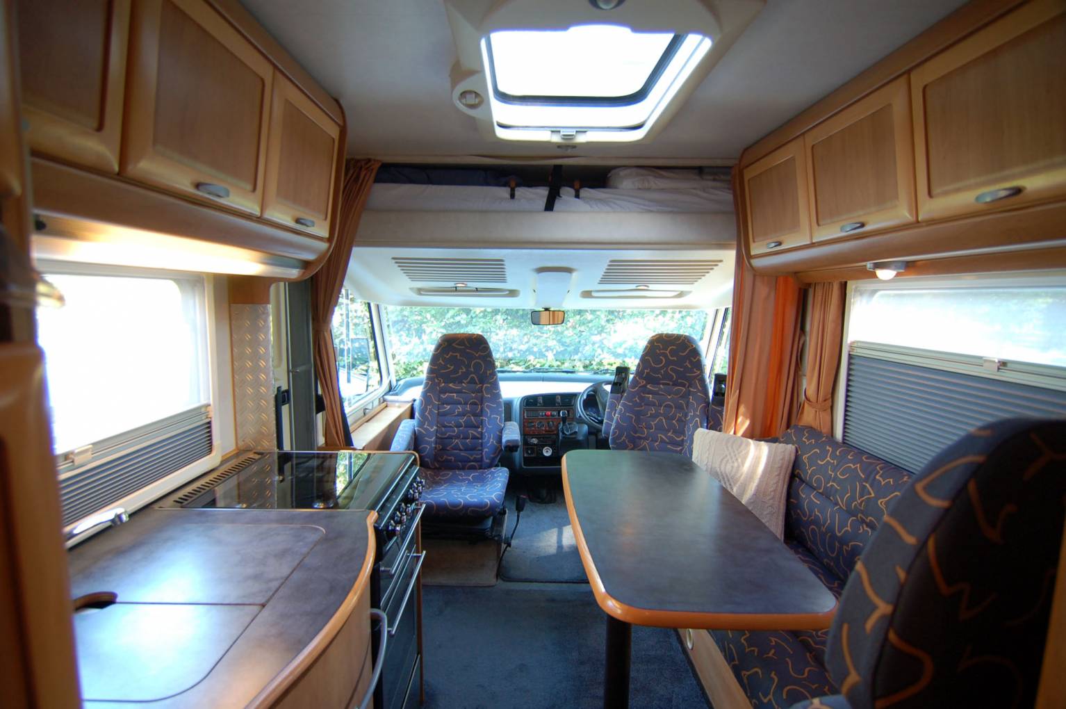 Essentially the layout comprises of swivel cab seats meeting the L dinette with multiposition table, opposite the kitchen with double sink, 3 way fridge, gas oven, grill and hob, then to the rear is a washroom with vanity sink, SOG vented toilet and separate lined shower, opposite a large clothes store and hanging space. The large front overcab bed lowers to give ample headroom and there are integrated cab blinds fitted. There is gas powered blown air heating and hot water system, with water fed from the onboard insulated tank and gas supplied from a fitted underfloor LPG tank, fill up for a fraction of the price of bottled gas.
