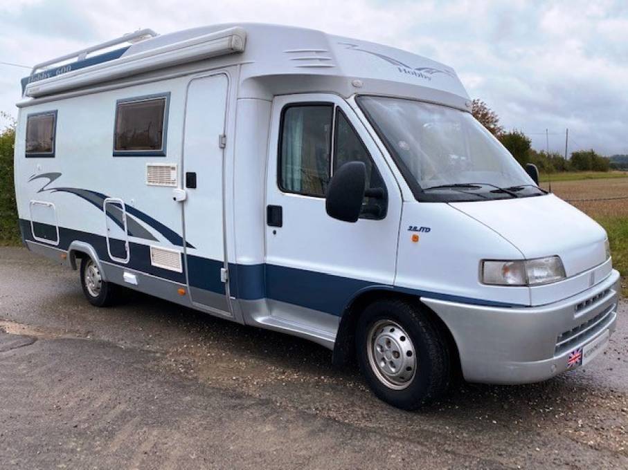 REDUCED This 2002 left hand drive Hobby 600 motorhome has only had two owners and is in lovely condition for the age and mileage. It has a fixed rear transverse bed with plenty of storage space below that is accessible outside from both sides of the vehicle. The dining space also converts into a double bed when required and has two forward facing belted seats meaning that 4 can travel safely. The mid position kitchen is equipped with a gas hob and sink, a fridge with ice box, eye level storage cupboards and also drawers at bas level. In the washroom there is cassette toilet, stainless steel corner sink with pull out shower attachment, shower curtain and several cupboards. Adjacent to the washroom and opposite are cupboards with shelving and a wardrobe. The dining space, bed area and front cab have eye level storage cupboards all round. Windows have fly screens, blinds and curtains. The washroom has a small skylight and the main habitation space also has a large skylight. Both cab seats swivel and cab doors have extra internal security locks. Attached the exterior of the vehicle are a bike rack, Omnistor awning, a gas point, and a reversing camera along with a ladder to access the roof. The current owner has fitted a solar panel as the vehicle has been used a lot for wild camping. The Fiat Ducato chassis has a 2800cc diesel power plant that had a cam belt change in 2017, and there is full service history from new. A habitation check was carried out in July 2020 and the vehicle will have a new MOT for the next owner.