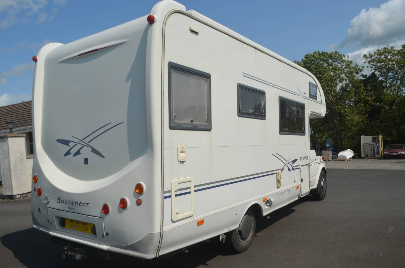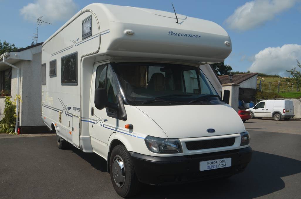 2002 BUCCANEER CLIPPER FOR SALE. THIS LOW MILEAGE MOTORHOME IS SHOWING 46300 MILES AT PRESENT. BASED ON A 2.4LITRE FORD TRANSIT CHASSIS AND IS PRESENTED IN GREAT CONDITION THROUGHOUT. ACCOMMODATING UP TO FOUR PEOPLE WITH TWO TRAVELLING SEAT BELTS. MAXIMUM WEIGHT IS 3500KG, MEASURING 6.83 METRES APPROXIMATELY IN LENGTH AND 2.17 METRES IN WIDTH. THE CAB AREA COMES EQUIPPED WITH A CAPTAINS SWIVELLING SEAT, RADIO, CENTRAL LOCKING AND ELECTRIC WINDOWS. ABOVE THE CAB THERE IS A LARGE DOUBLE WITH EITHER TWO SINGLES OR ANOTHER DOUBLE BED THAT IS EASILY CONVERTED IN YOUR DINING AREA. THE DINNING AREA IS VERY SPACIOUS AND BRIGHT. YOUR KITCHEN AREA COMES EQUIPPED WITH A FULL SIZE COOKER, GRILL, SINK, DRAINER AND DOMETIC FRIDGE. WASHROOM IS AT THE REAR OF THE MOTORHOME AND HAS A THETFORD TOILET, WASH HAND BASIN AND SHOWER CUBICLE. GREAT STORAGE SURROUNDING THE CAB AREA WITH TWO SPACIOUS LOCKERS OUTSIDE. SPECIFICATION INCLUDES AN OMNISTOR AWNING, TOW BAR AND HAS AIR SUSPENSION.