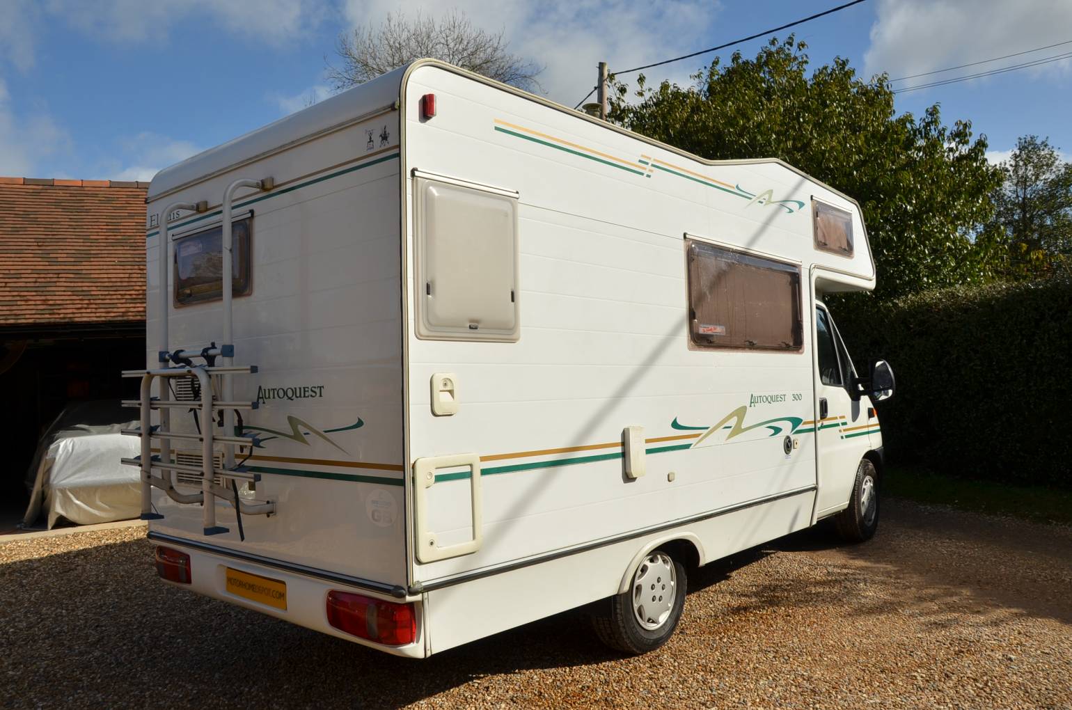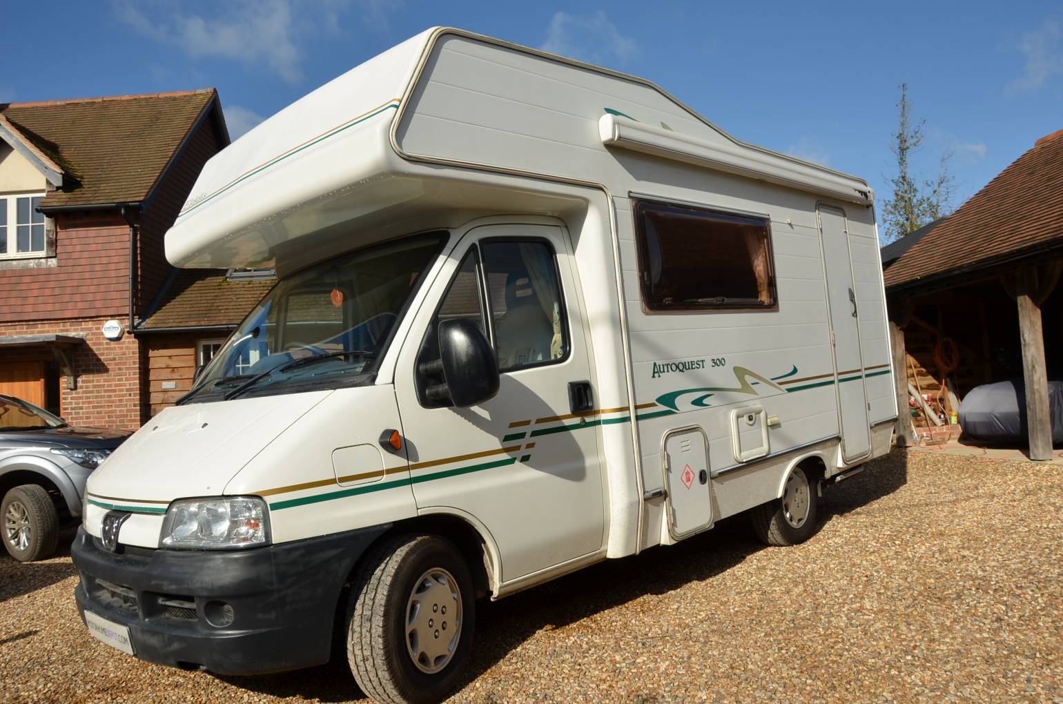 This 2002 Elddis Autoquest 300 is a lovely example that has been in the same family's ownership for over 10 years. It has the end kitchen with corner washroom and central dinette with forward and rear facing seats, all 4 of which have seat belts, and the long loung seat opposite that makes up into a single bed. With the dinette converting into a double bed and an over cab bed there are 5 berths if required. The kitchen has a 4-ring gas hob, oven and grill and there is a 3-way fridge with ice box. Hot and cold water, heating, black out blinds and fly screens, a stow away table, and a hidden safe complete the internal specification. Externally there is a wind-out awning and bicycle rack. All in all this is a very tidy example. We have the operational manuals and V5 registration document in our custody as we are storing the vehicle on behalf of the owner pending sale; it can be viewed by appointment with us near Wallingford, South Oxfordshire but in the first instance please call for access to our extended photo file and to discuss it to be sure it is suitable.