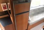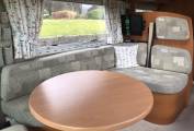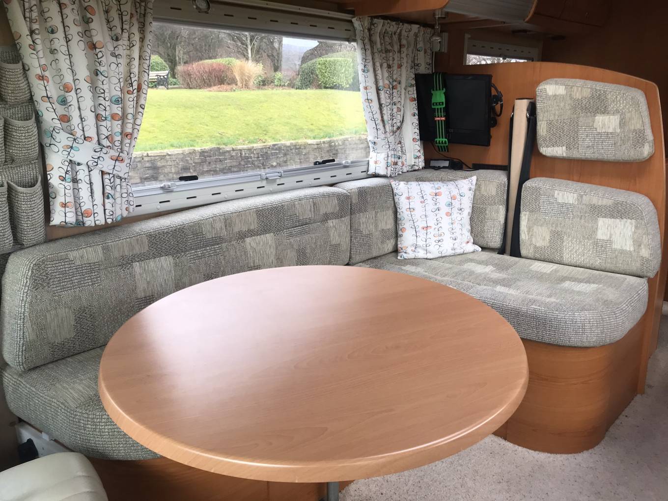 The front seating area has plenty of overhead storage, a TV, and an adjustable round table. There is a rectangular table also included. Spotlights give a cosy feeling.