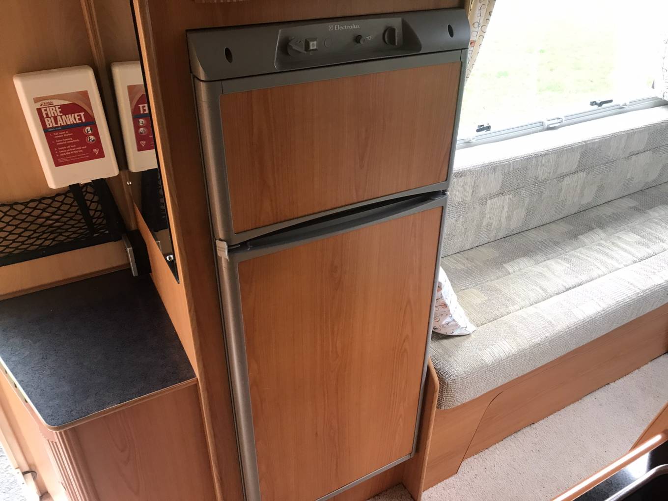 Behind the L-shaped sofa is a kitchen, complete with fridge, freezer, 3 ring hob, sink and oven with a grill.