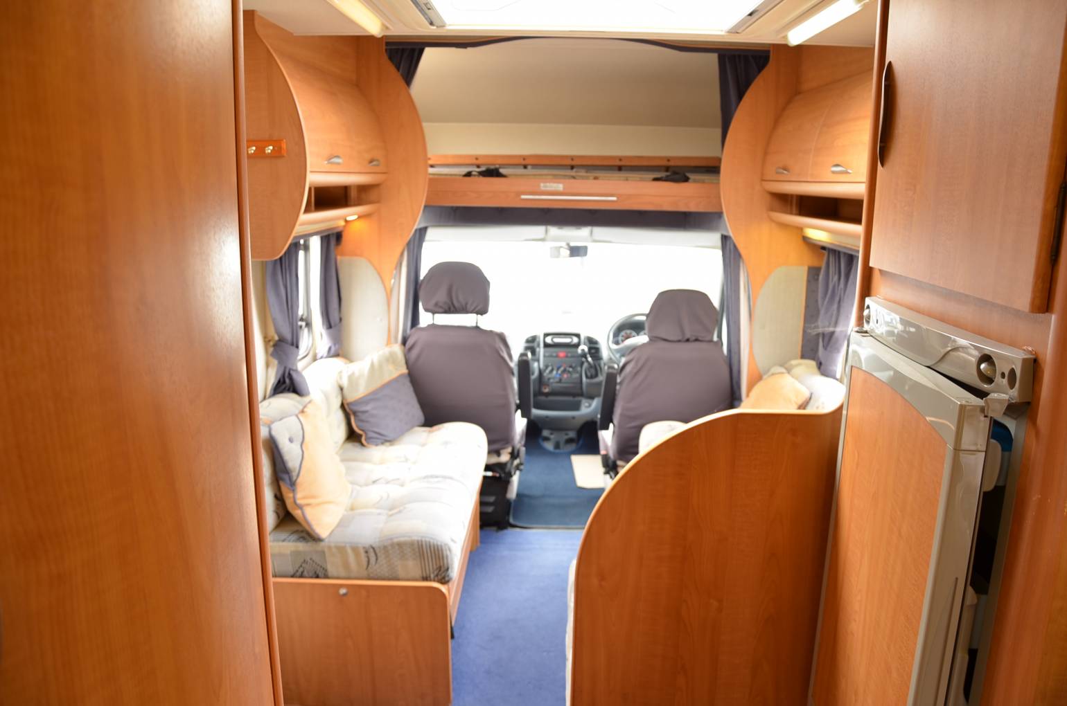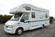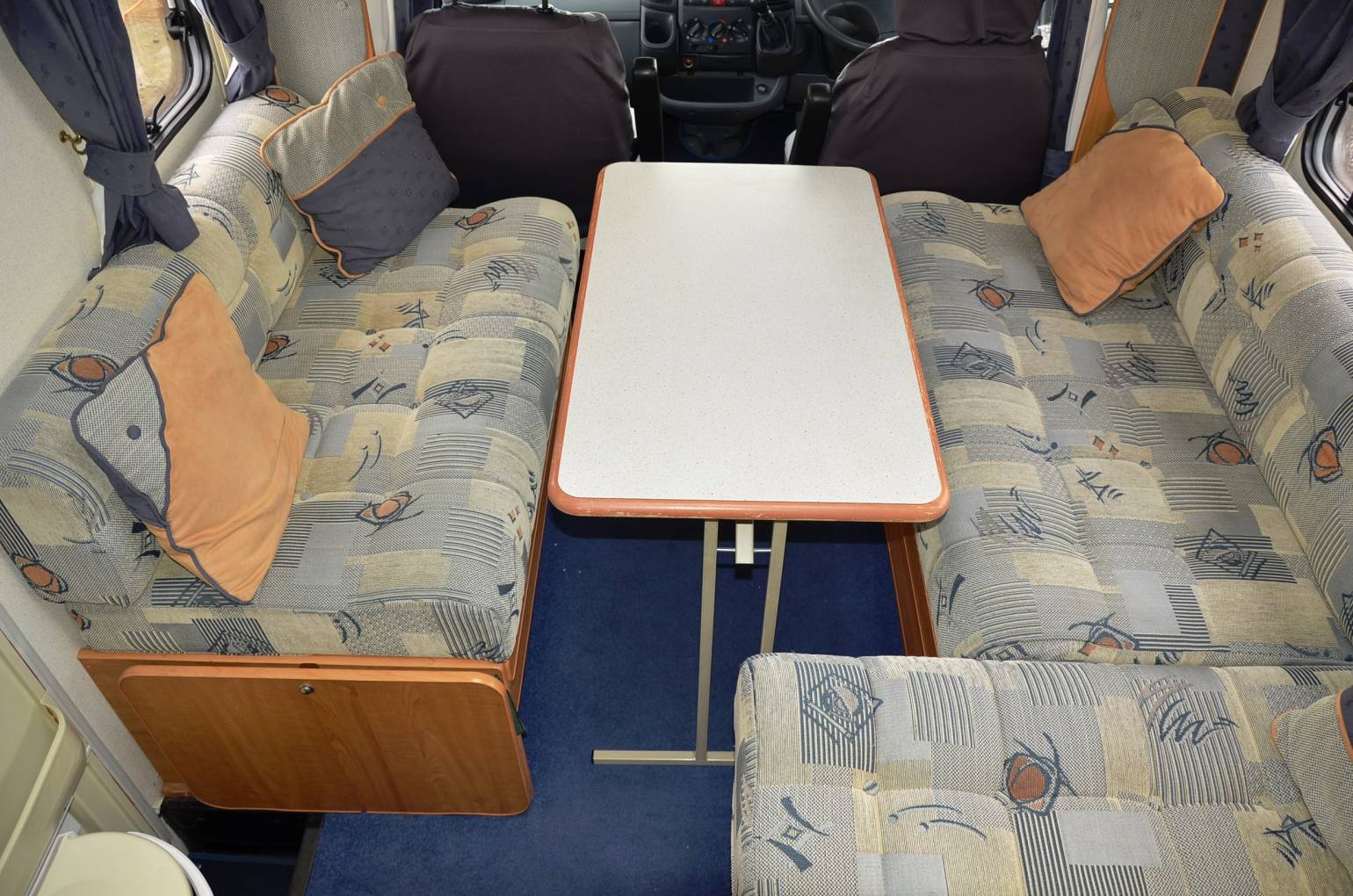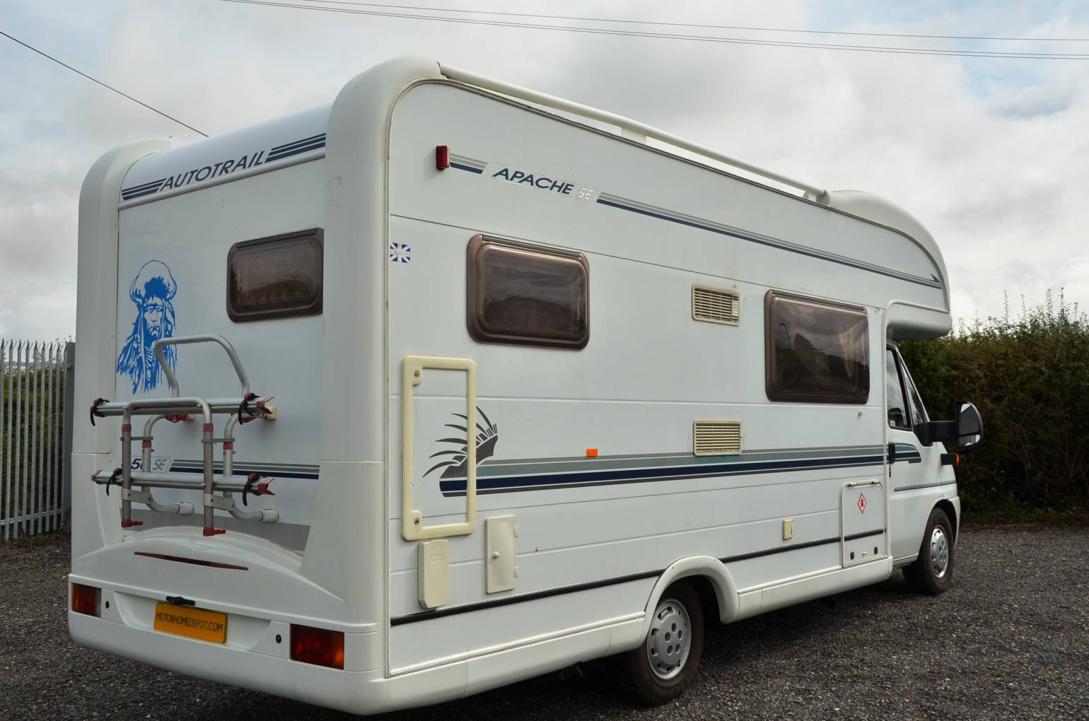 This 2003 Autotrail Apache 650se 4-berth motorhome is in tidy condition and comes with an MOT to September 2020 and had a cambelt change in 2017. The Fiat chassis has the 2.8 litre turbo diesel engine giving a good blend of power and economy and drives very nicely. The cab has electric windows and mirrors and an adjustable steering column making for comfortable driving. A feature of the the well lit front lounge and dining space is the large skylight, and this area converts easily into a double bed adjacent to the over cab bed; two lap belts are fitted for passengers travelling in the rear. The kitchen area behind has plenty of worktop and storage along with an oven, grill and hob, 3-way fridge and also a microwave. The corner washroom has a corner shower cubicle, wash basin and wc. The Truma blown air heating and hot water run off both gas and electricity so wild camping is no problem, and there is also a WiFi system fitted and TV/DVD player. In addition to the built-in fresh and waste water tanks there is an additional waste water container. Windows are fitted with night blinds and fly screens. A recessed wind-out awning is fitted along with a bicycle rack for two, an outside shower point and bbq point. Measures 6.9m including (removable) bike rack.