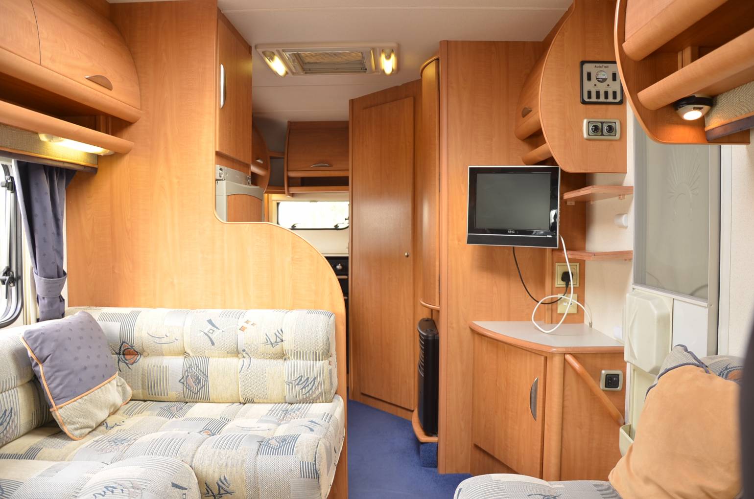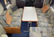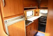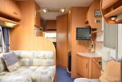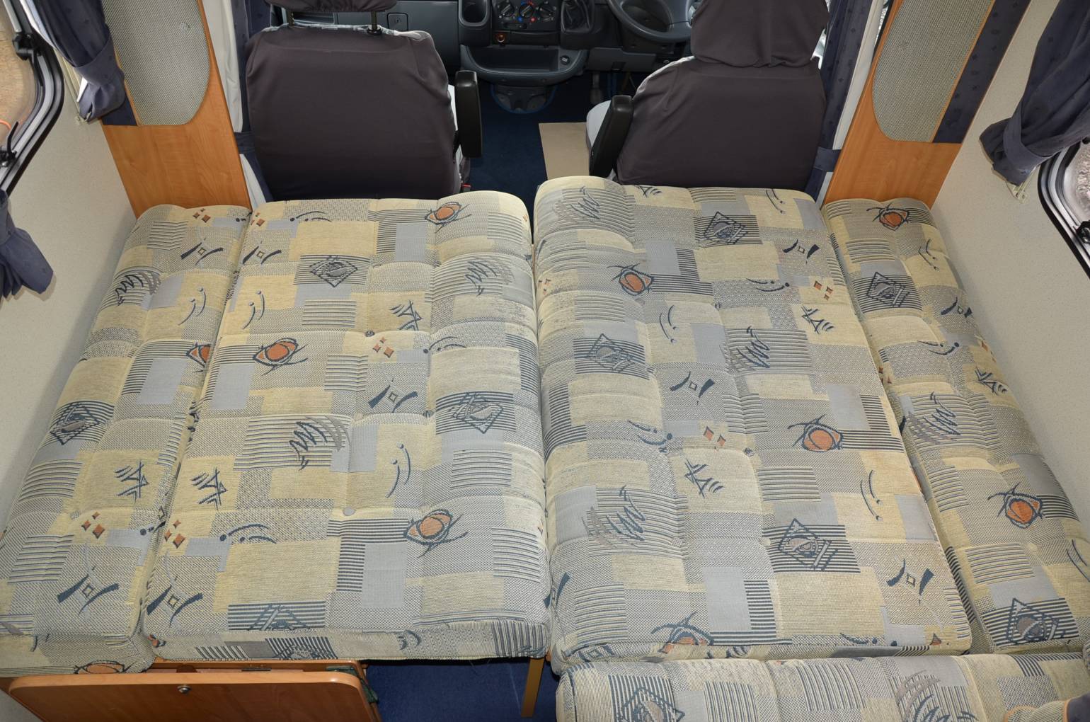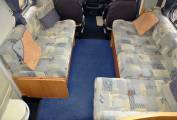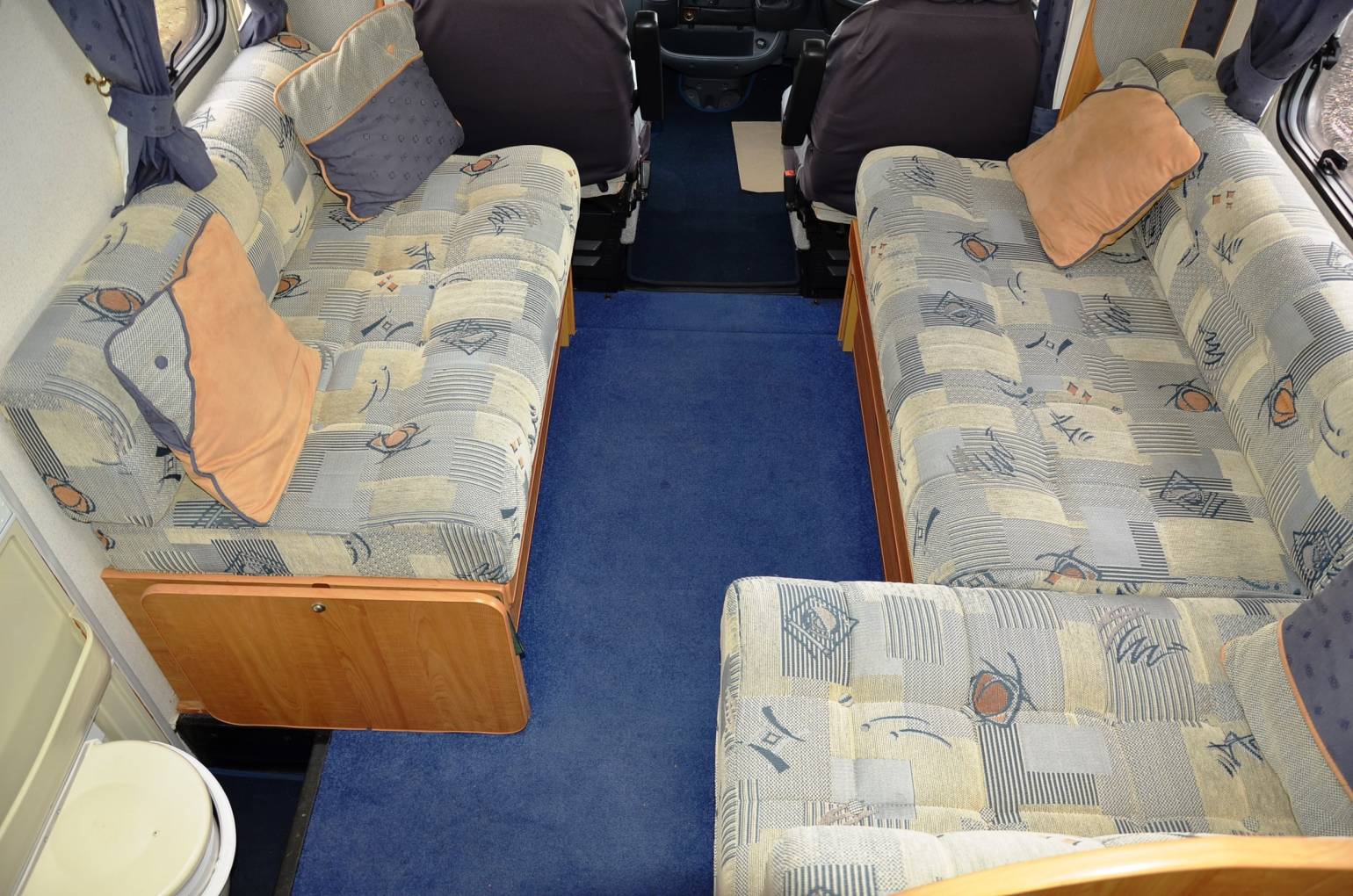 This 2003 Autotrail Apache 650se 4-berth motorhome is in tidy condition and comes with an MOT to September 2020 and had a cambelt change in 2017. The Fiat chassis has the 2.8 litre turbo diesel engine giving a good blend of power and economy and drives very nicely. The cab has electric windows and mirrors and an adjustable steering column making for comfortable driving. A feature of the the well lit front lounge and dining space is the large skylight, and this area converts easily into a double bed adjacent to the over cab bed; two lap belts are fitted for passengers travelling in the rear. The kitchen area behind has plenty of worktop and storage along with an oven, grill and hob, 3-way fridge and also a microwave. The corner washroom has a corner shower cubicle, wash basin and wc. The Truma blown air heating and hot water run off both gas and electricity so wild camping is no problem, and there is also a WiFi system fitted and TV/DVD player. In addition to the built-in fresh and waste water tanks there is an additional waste water container. Windows are fitted with night blinds and fly screens. A recessed wind-out awning is fitted along with a bicycle rack for two, an outside shower point and bbq point. Measures 6.9m including (removable) bike rack.