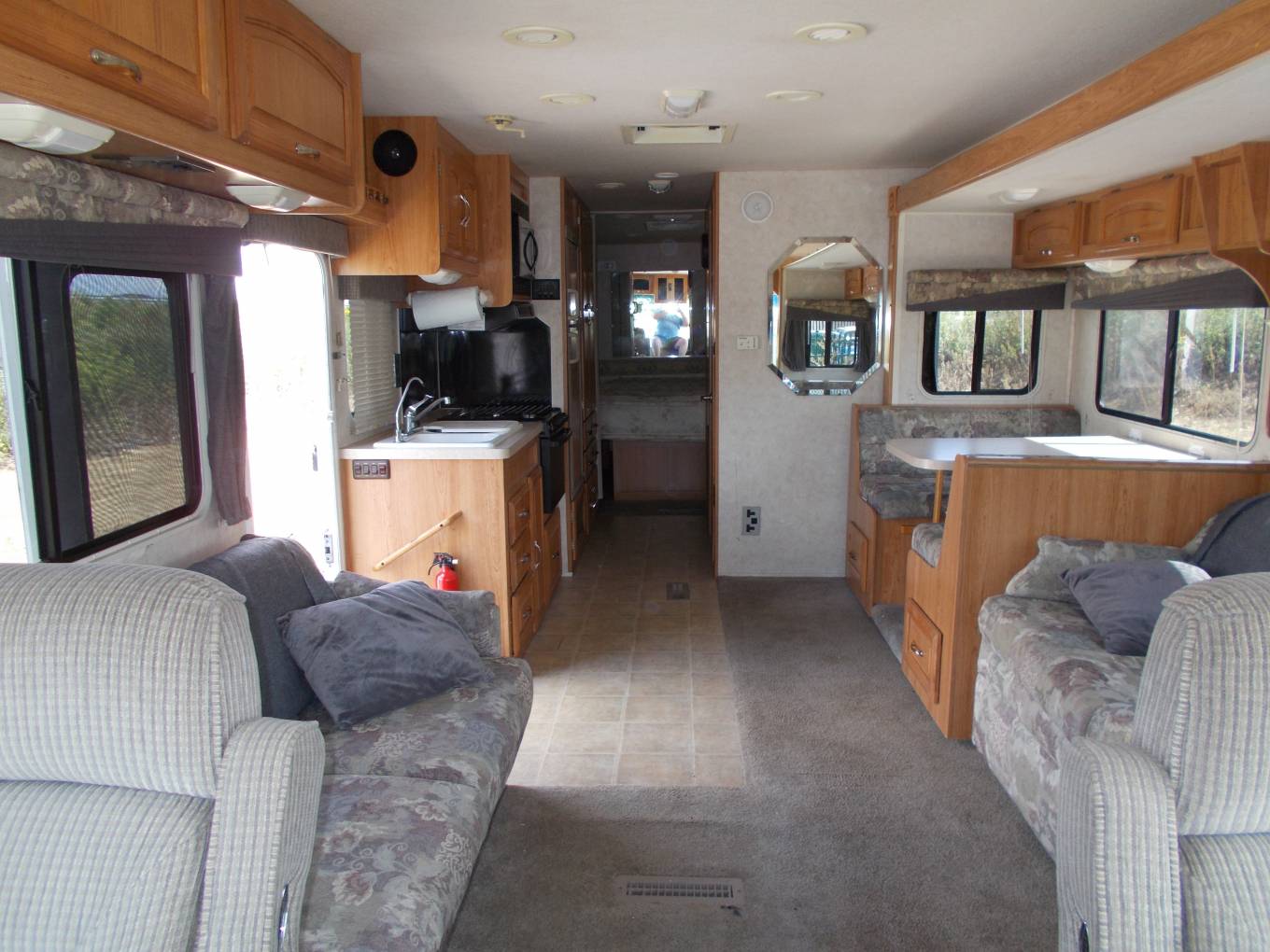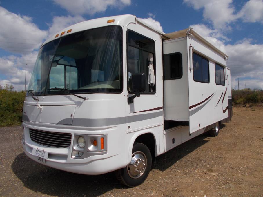 A rare opportunity to acquire this American 6 berth RV in great condition with 7 seat belts. Up front we have a 6.8 litre V10 Ford Triton petrol engine, automatic transmission, auto levelling system, reversing monitor, air conditioning and both captain’s chairs swivel to face the rear of this spacious Motorhome. Double push outs to lounge and rear bedroom, dual air conditioning and heating system. The galley kitchen comprises a full size fridge freezer, gas hob with oven, extractor hood, microwave and sink. To the rear there is a full size double bed and the washroom has a small bath, shower, hand basin and a porcelain toilet. Fully converted to run on 110 or 240 volt ac with a 5.5 kw exterior LPG generator. As this Motorhome is over 3500 kg you will need a driving license pre 1997 or you will need a class C. The roof extractor fan and the piezo ignition on the cooker are not working at present so this has been reflected in the price. Two new leisure batteries have been fitted and the vehicle will come with 12 months MOT and will be fully serviced prior to collection. This Motorhome is located in Luton LU2. For extensive photos and further information please call Alan on 07525 841 632 or 01327 844 790.