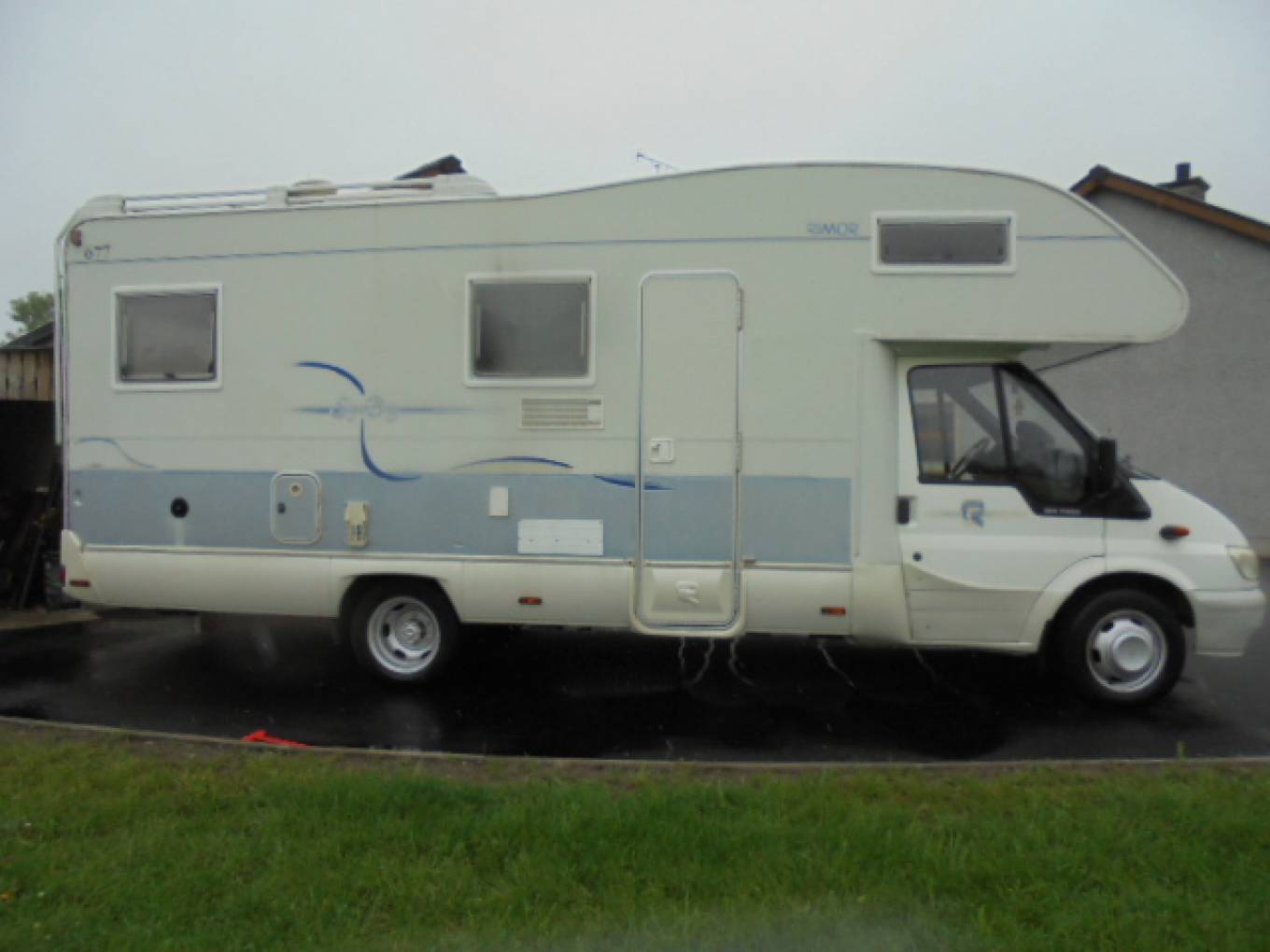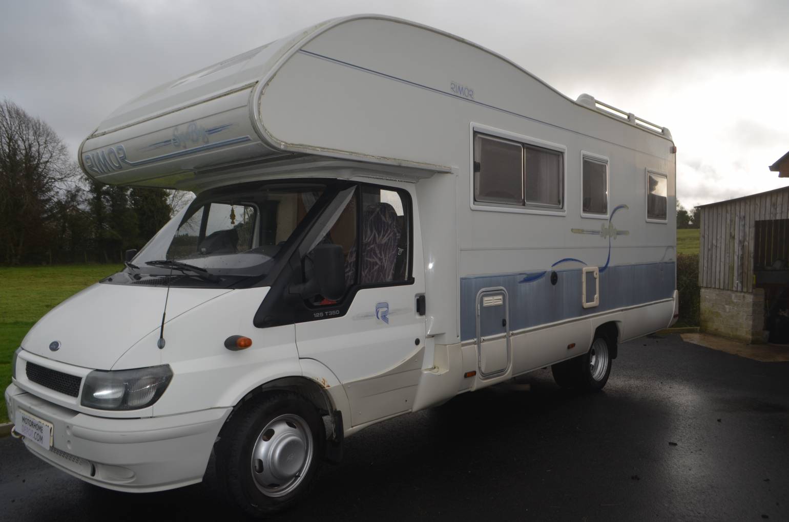 2003 Rimor Superbrig 677 6 Berth Motorhome For Sale. Left Hand Drive. One owner from new. With 6 travelling seat belts mileage at moment is 89772. Based on a Ford Transit chassis with a 2.4L engine and 5 speed manual transmission, approximate length is 7.4 m, width 2.2m and it has a max weight of 3500kg. Above the cab is a large double bed with other sleeping arrangements provided by converting the central dinette to a double and the rear lounge also converts to a large double.The kitchen is fully equipped with sink, 3 burner hob and 3 way fridge freezer. Washroom has WHB, swivel cassette toilet and a separate shower with shower curtain. The centre dinette seats 4 people comfortably while the rear U-shaped lounge allows up to 6 persons. Extras include Habitation Air Con, on board generator, 3 bike rack, luton ladder, roof rails and ramps. Storage good throughout. Needs some TLC on the outside and has water ingress in the corner of the overcab.