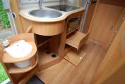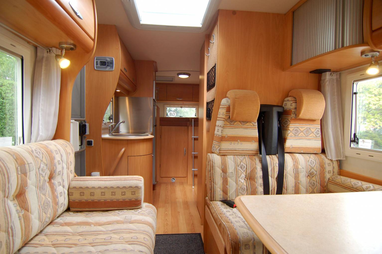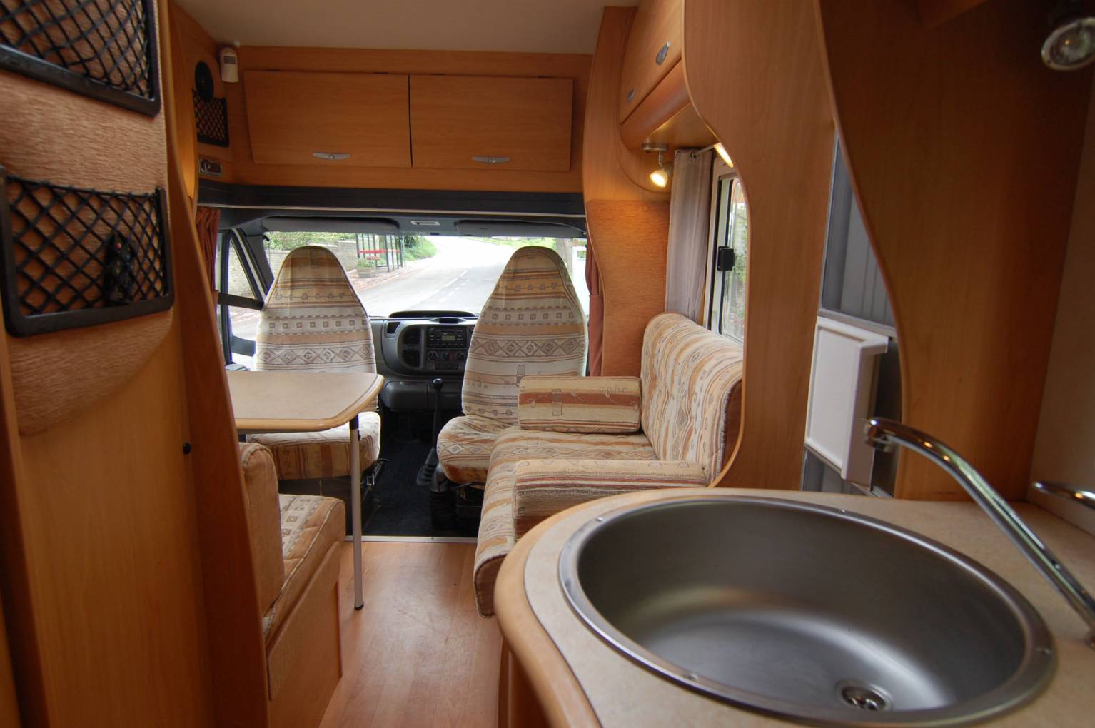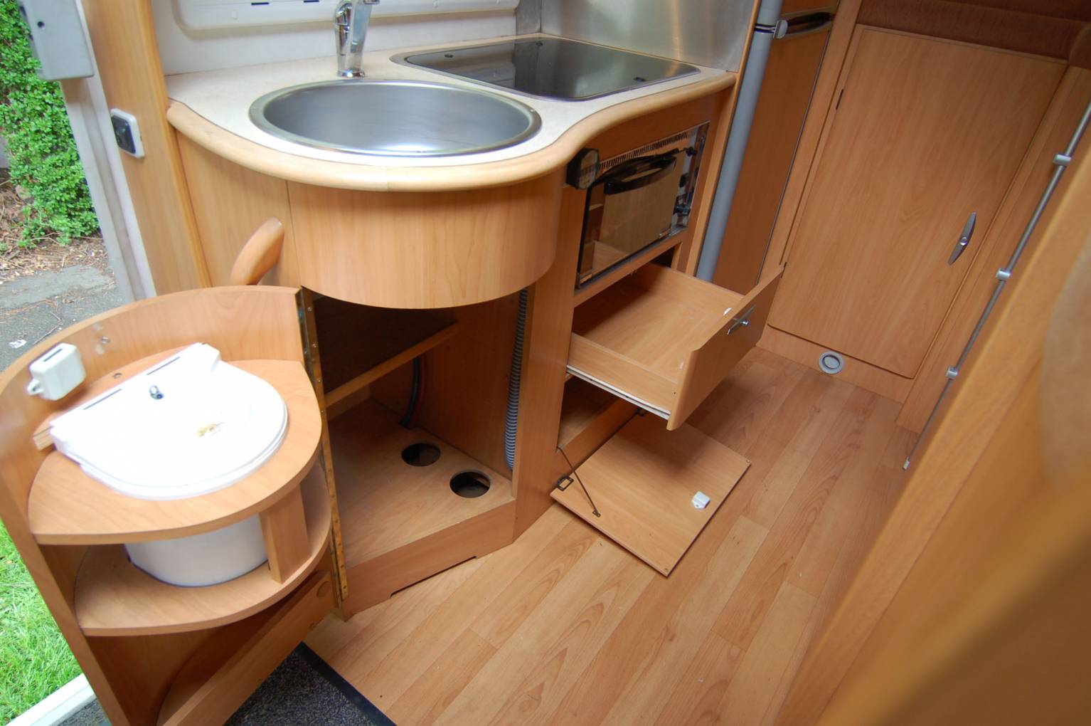 The forward dinette has 2 factory fitted seatbelts, making 4 in total and a heat exchanger to keep passengers warm on the move. An extending table allows for up to 5 to sit for a social and an occasional bed can be made up here too. Removable carpets are present although not shown in photos. Original gas oven available separately, microwave currently fitted in the oven cavity. Oyster self seeking satellite system gives standard free to air channels, TV available separately.