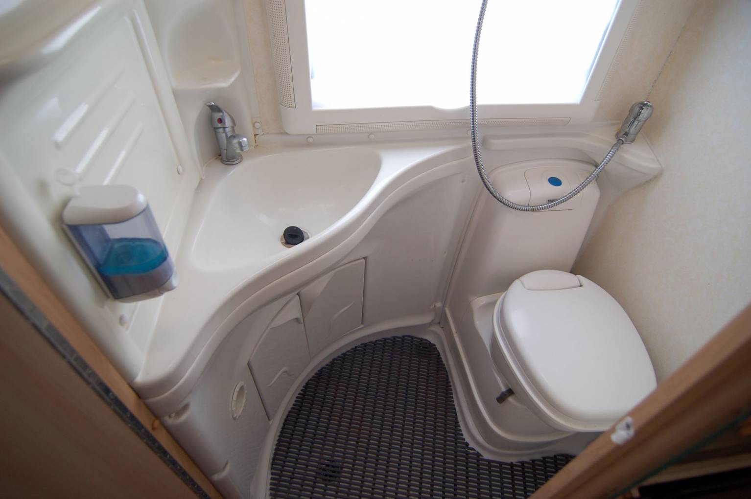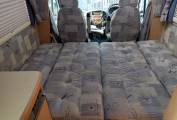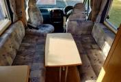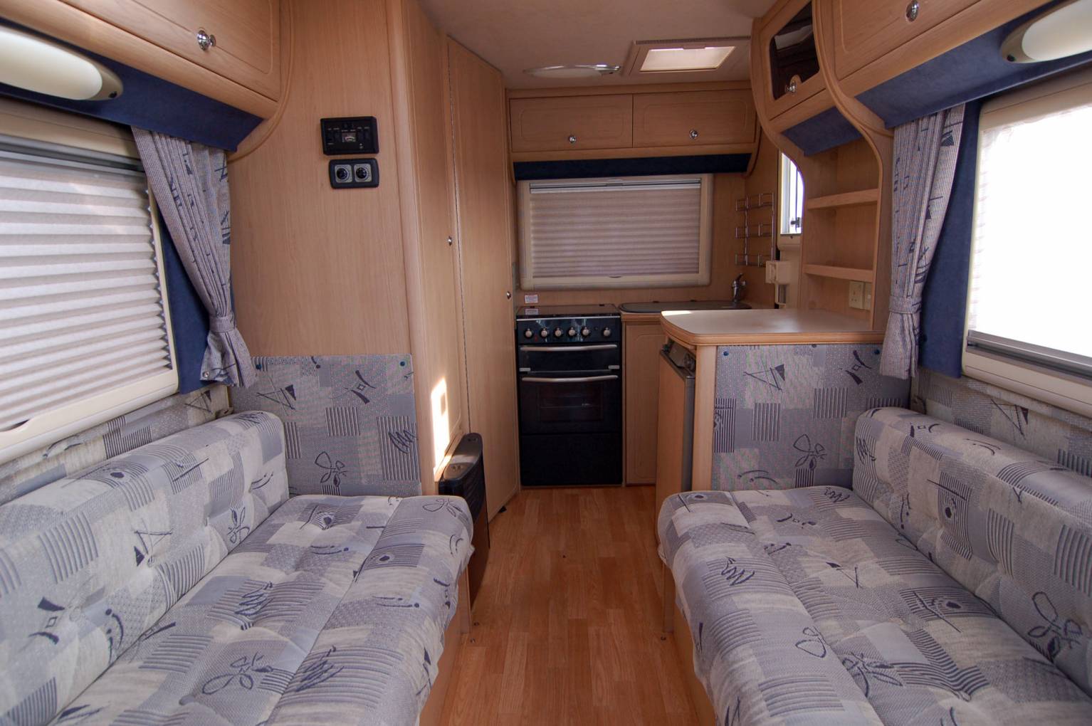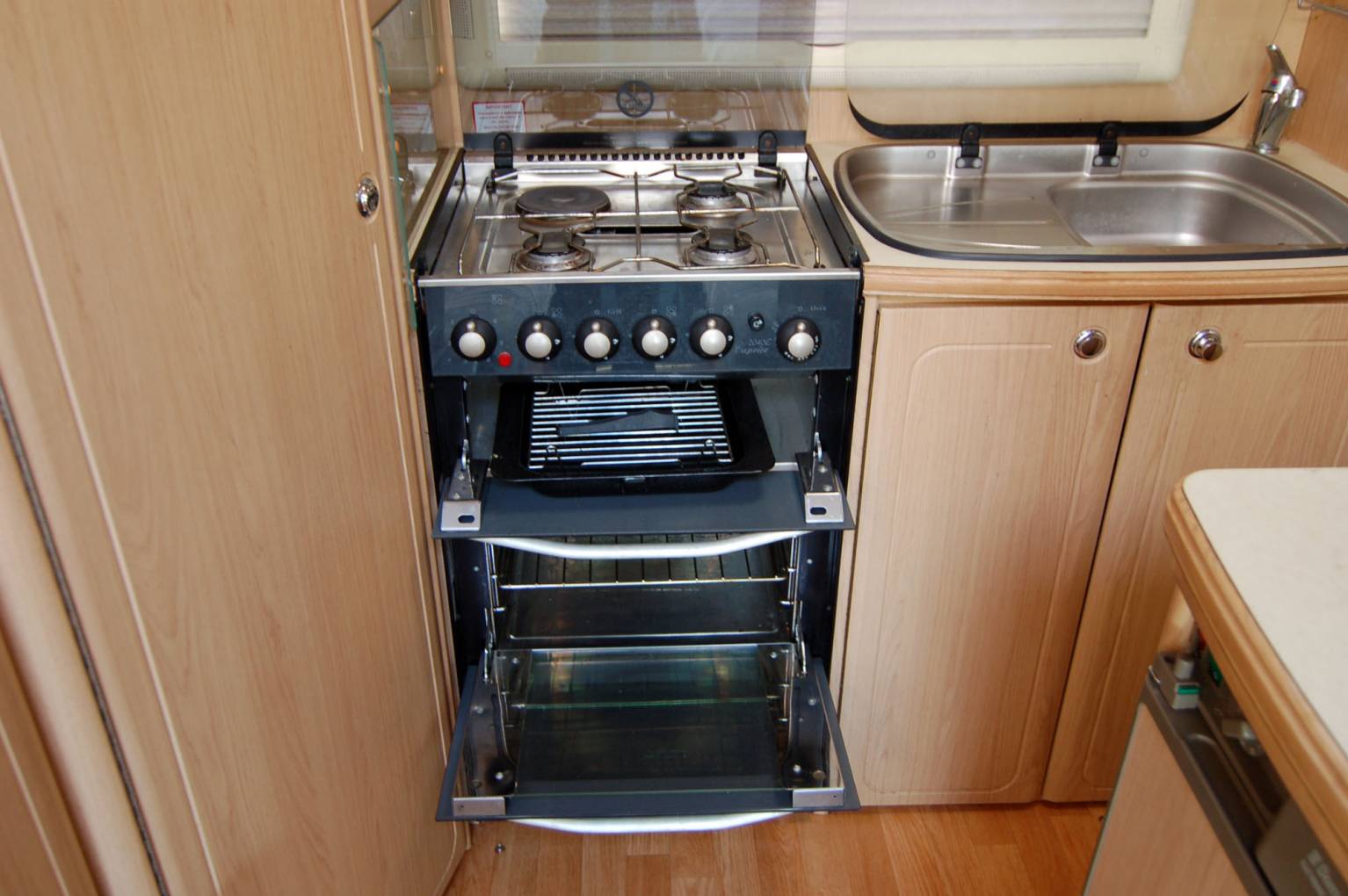 The forward lounge is deceptively spacious, capable of seating 6 for a social with the cab seats swivelled. The backrests also have hinged stays so there is the option of making them slightly sloping rather than upright, good for those with back problems. The double bed is level and very quick to make with the bed bases being on slide out runners. To the rear the kitchen is well equipped with gas hob, oven and grill. There is good storage here too including a mini dresser housing the three way fridge.