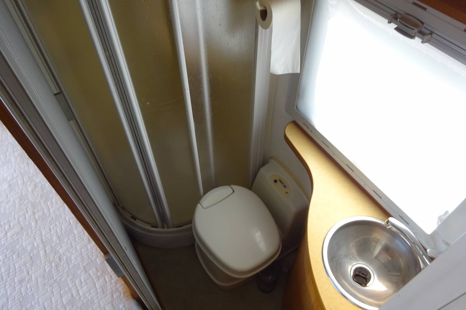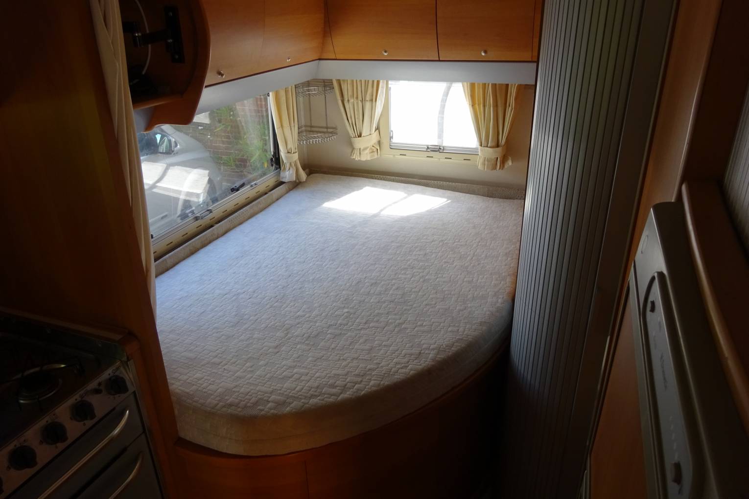 This is a 2 berth 4 seat belt model which has been kept in very good order and fitted with many extras to make life a breeze during those long-awaited tours. *** Starting at the rear we have the ever-popular fixed double French bed with storage under, so no making up your bed each night. Next to that the well finished washroom with separate shower enclosed, loo and wash basin, there is an extractor fan in this space to help with vitalisation.
