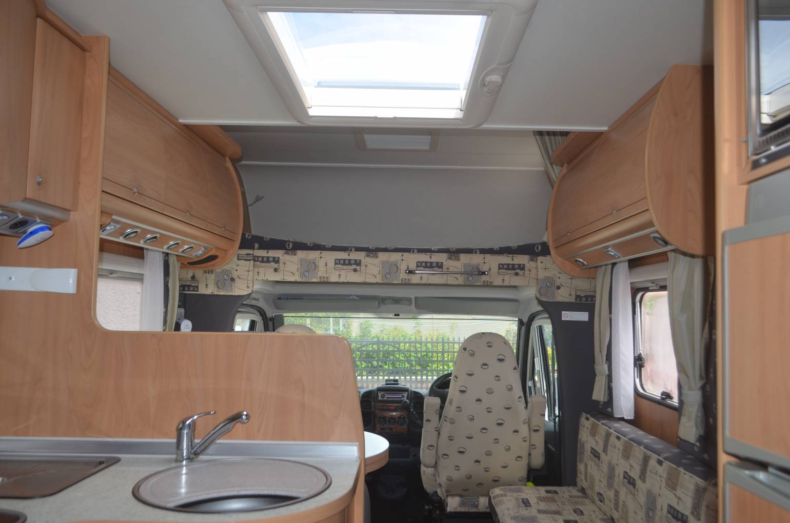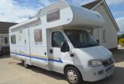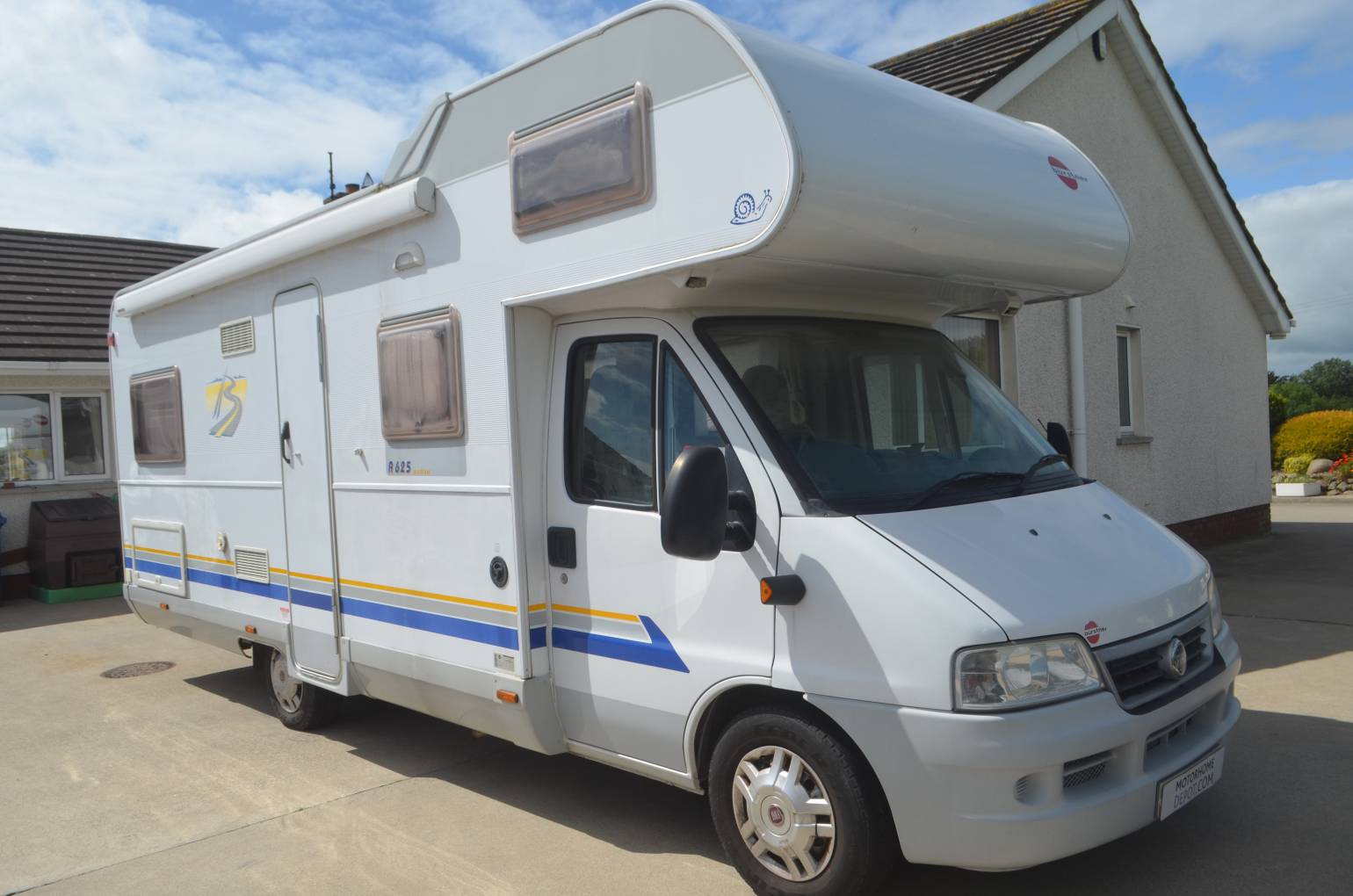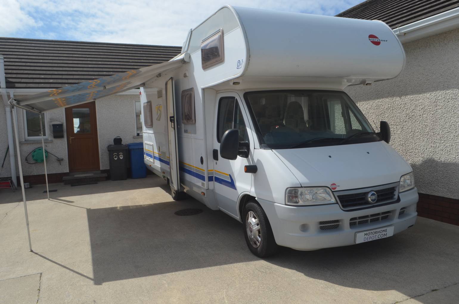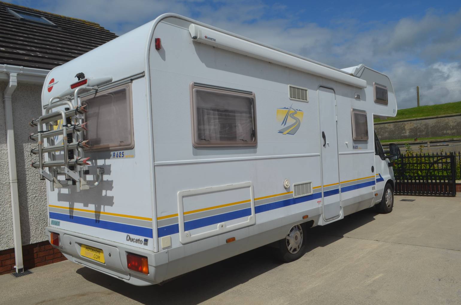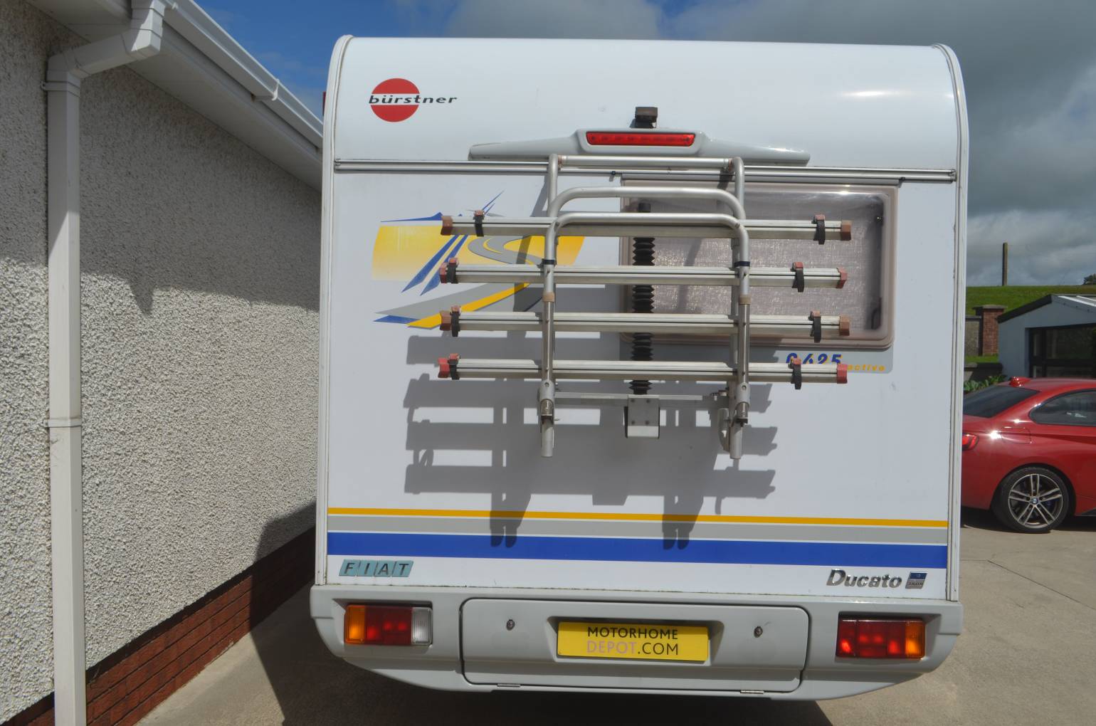 2004 BURSTNER A625 ACTIVE MOTORHOME FOR SALE. This Burstner A625 Active sleeps four, has four seat belts. Length is approx 7m long, has a gross weight of 3500kg. Based on a Fiat Ducato with a 2.8 litre diesel engine and a manual transmission. Presented in great condition throughout. 21625 miles travelled. At the rear you have a fixed french bed with storage lockers above and extra storage underneath the bed. Bathroom has a separate shower cubicle with a cassette toilet and a wash hand basin. Mid ship kitchen is fully equipped with a sink, 3 burner gas hob, oven, grill, sink and a 3 way fridge freezer. Your lounge/dining area is spacious and the captains chairs swivel round to give extra seating. Above the cab there is a large double bed that will fold up for extra head space. Extras fitted to the motorhome include a 4 bike rack, wind out awning, reverse camera, alarm, outside bbq point and a Tv.