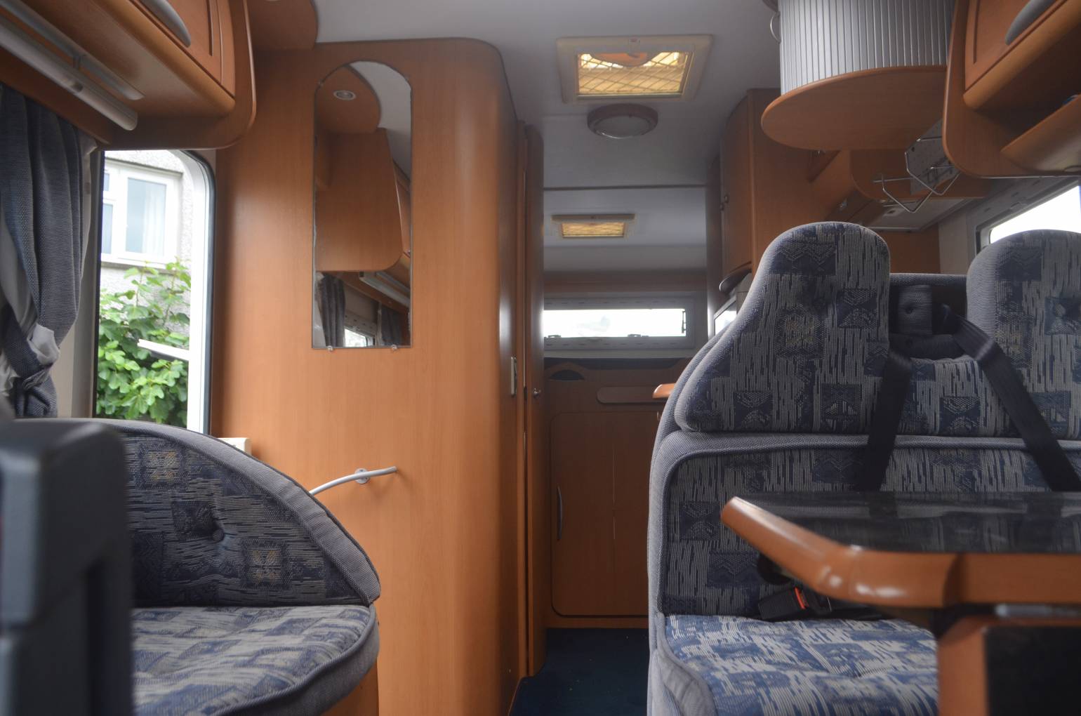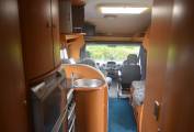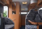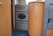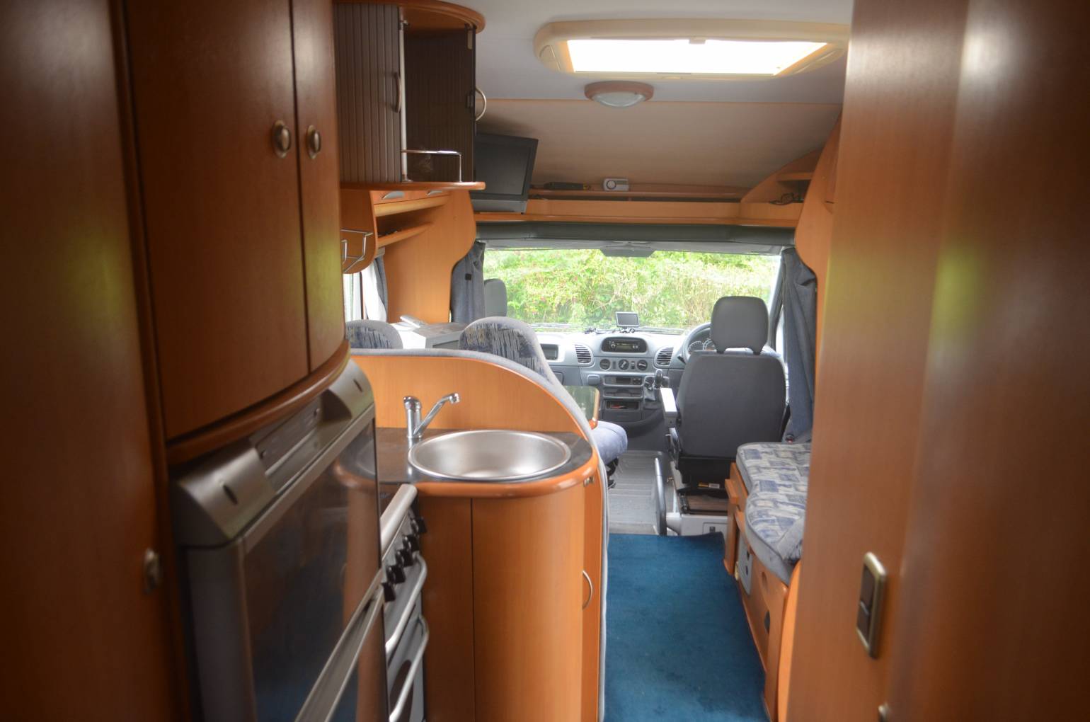 L-shaped kitchen has a 4 burner gas hob, oven, grill, sink and a 3 way fridge freezer. Great storage space throughout the motorhome.