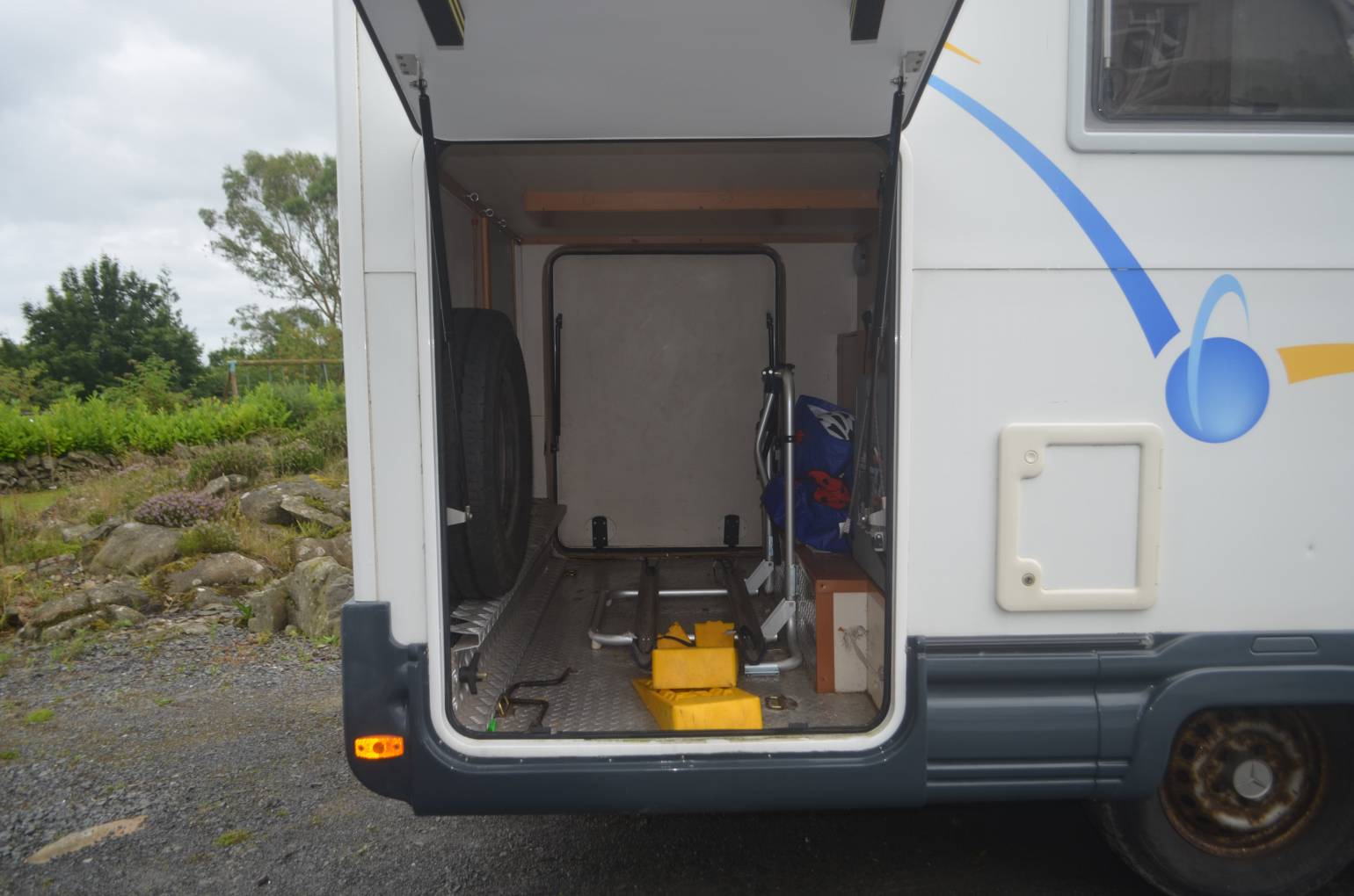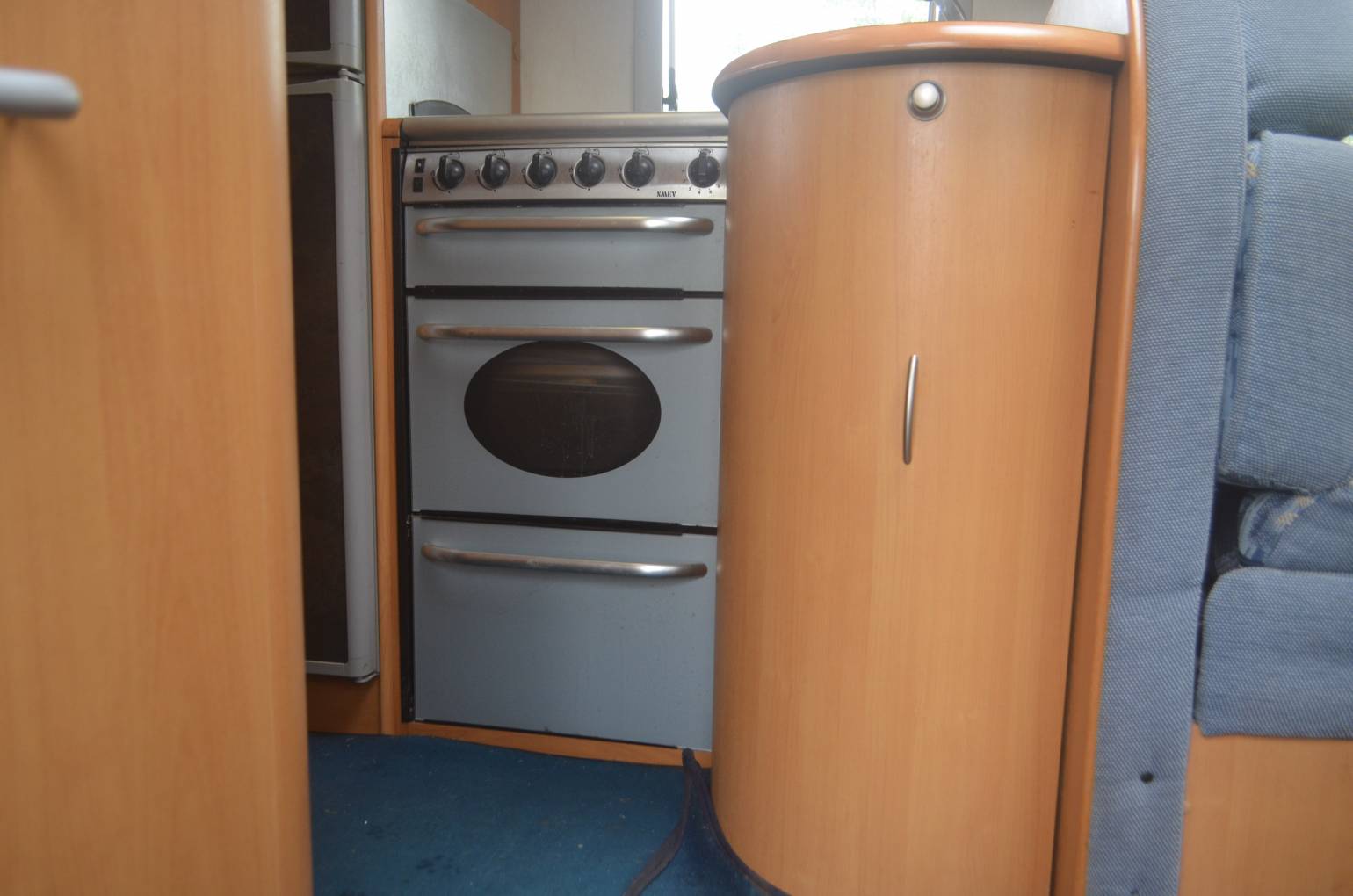 At the rear the double transverse bed is situated above a large garage. Wash room has a vainty unit with a separate shower cubicle, wash hand basin and cassette toilet.