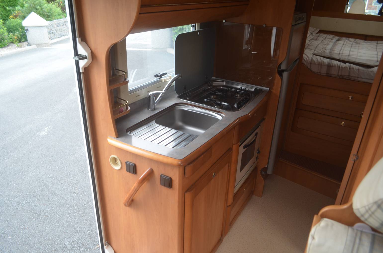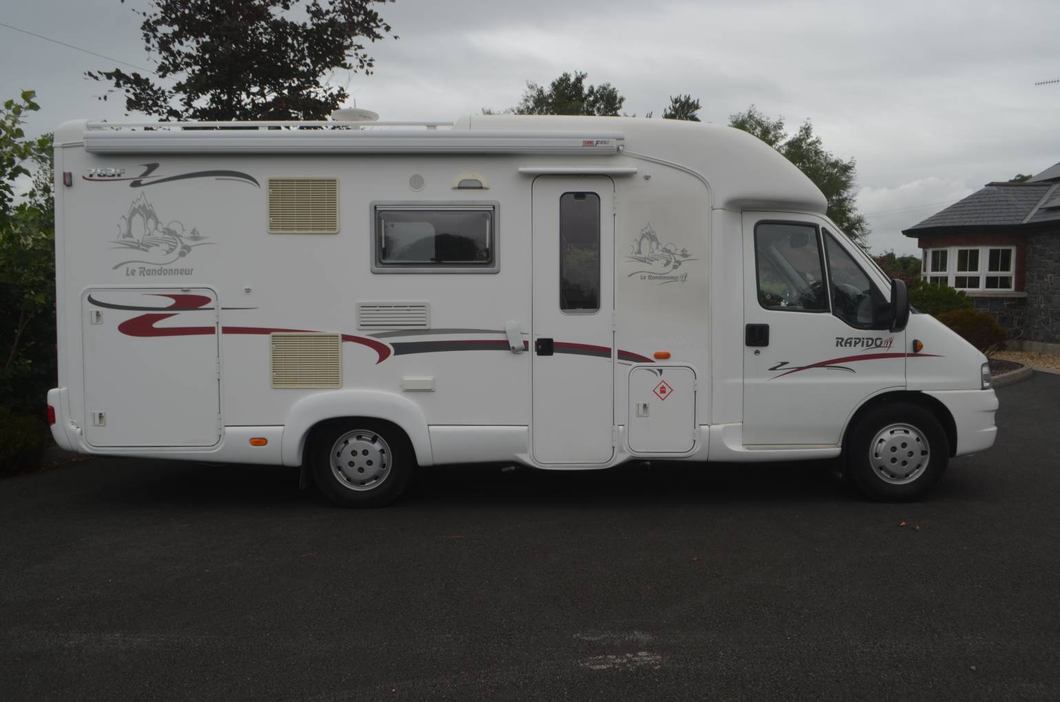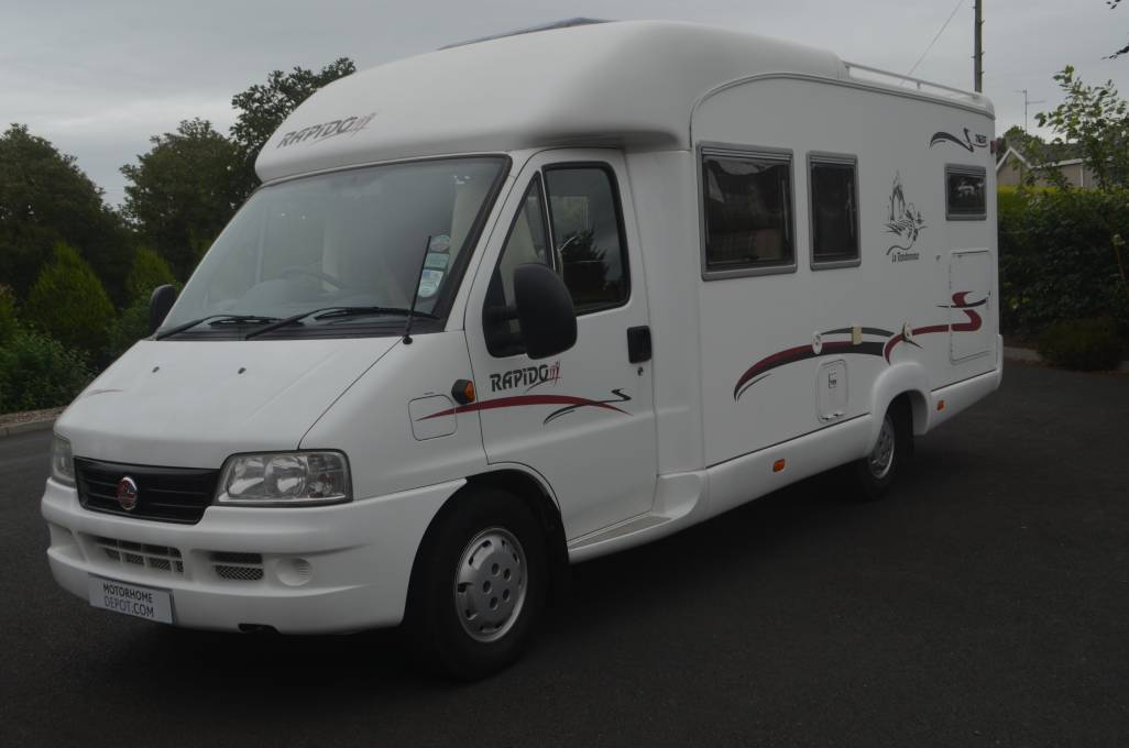 2004 LOW PROFILE RAPIDO 763F MODEL FOR SALE. BASED ON A FIAT DUCATO CHASSIS WITH 2.8 ENGINE AND 5 SPEED MANUAL GEAR BOX. MOT UNTIL MARCH 2019. PRESENTED IN GREAT CONDITION THROUGHOUT. MEASURING 6.74M IN LENGTH AND 2.33M IN WIDTH. THIS FRENCH MODEL WILL ACCOMMODATE UP TO 4 PEOPLE TRAVELLING AND SLEEPS 3 PEOPLE COMFORTABLY. THE CAB AREA COMES WITH TWO SWIVELLING CAPTAIN SEATS WITH HEIGHT ADJUSTMENT, RADIO, CD PLAYER, CENTRAL LOCKING, REVERSE CAMERA AND CAB AIR CON. THE FRONT DINETTE AREA HAS AN EXTENDABLE TABLE THAT COVERTS INTO ANOTHER SLEEPING AREA. THE FULLY EQUIPPED KITCHEN WILL GIVE YOU A 3 BURNER HOB, SINK, DRAINER AND A LARGE FRIDGE FREEZER. OPPOSITE YOU HAVE YOUR BATHROOM WITH SHOWER, TOILET AND WASH HAND BASIN. THERE IS AMPLE STORAGE IN THE WARDROBE AND OVERHEAD LOCKERS SITUATED AROUND THE HABITATION AREA. ACROSS THE REAR IS A LARGE FIXED DOUBLE BED WITH MORE STORAGE LOCKERS. THE LARGE GARAGE CAN BE ACCESSED FROM BOTH SIDES. EXTRAS FITTED TO THIS MODEL INCLUDE A FIAMMA AWNING, OUTSIDE SHOWER POINT, LEISURE BATTERY, BIKE RACK, SATELLITE AND TV/DVD PLAYER.