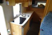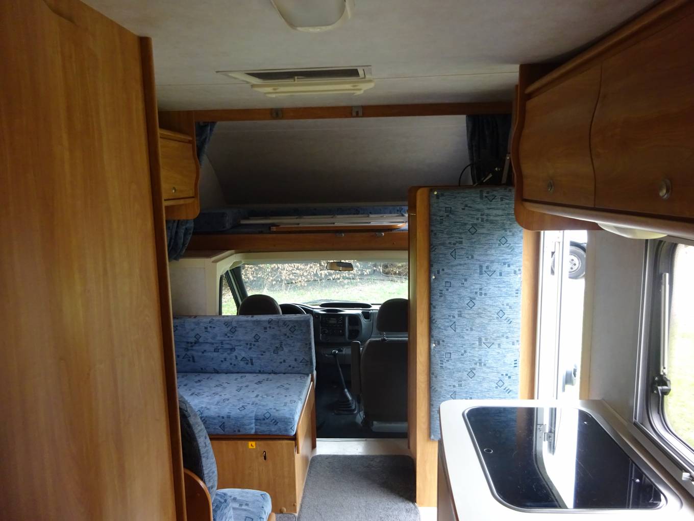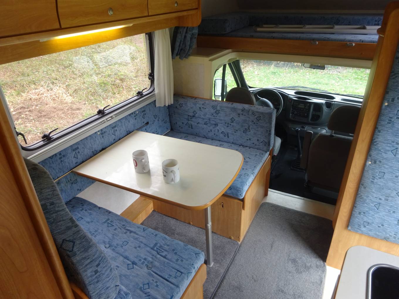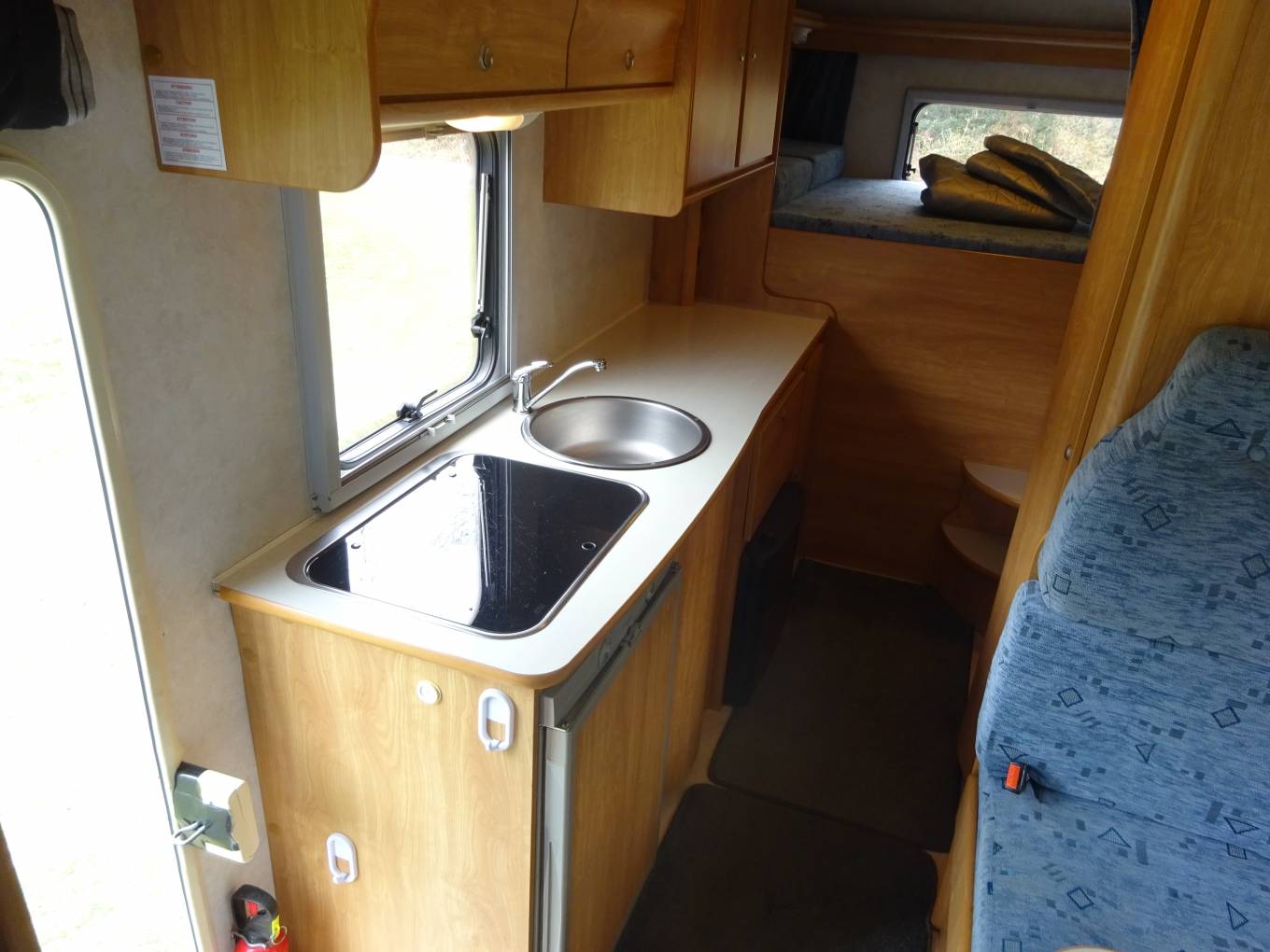 The kitchen is located midship with large sink and drainer area, 3 ring burner gas hob. The fridge is three way allowing for 12v, 240v or gas operation. Opposite the kitchen area is the dinette and also two further forward facing belted seats for travel. This area converts into a good sized double bed and there is lots of cupboards over both at the dinette and kitchen areas.