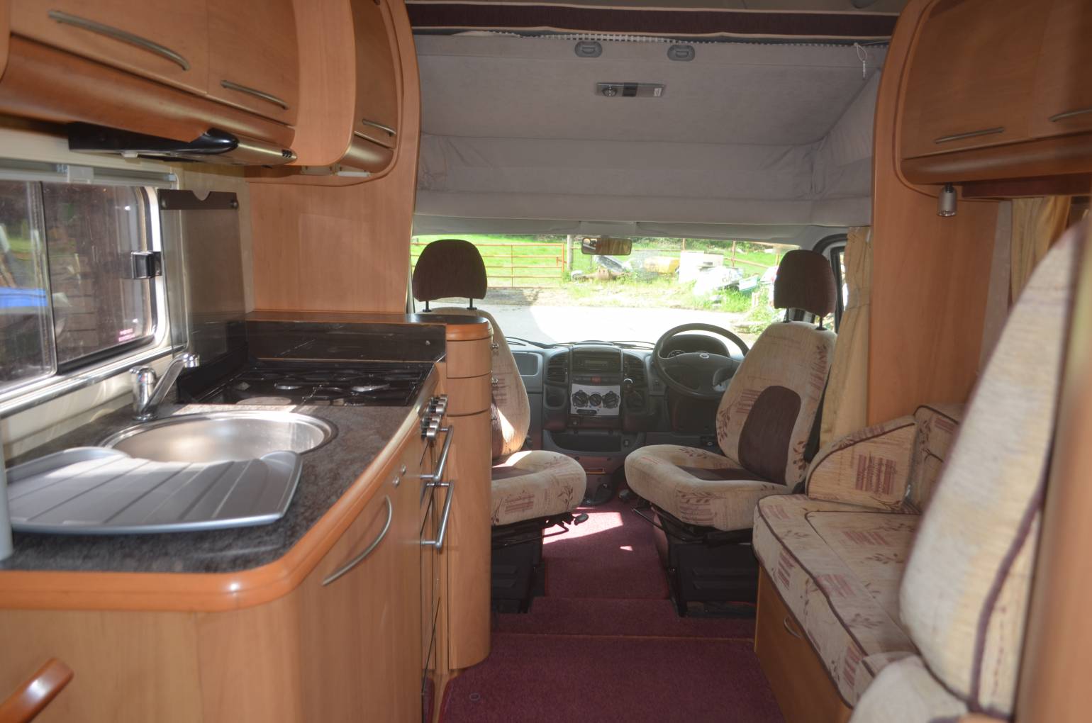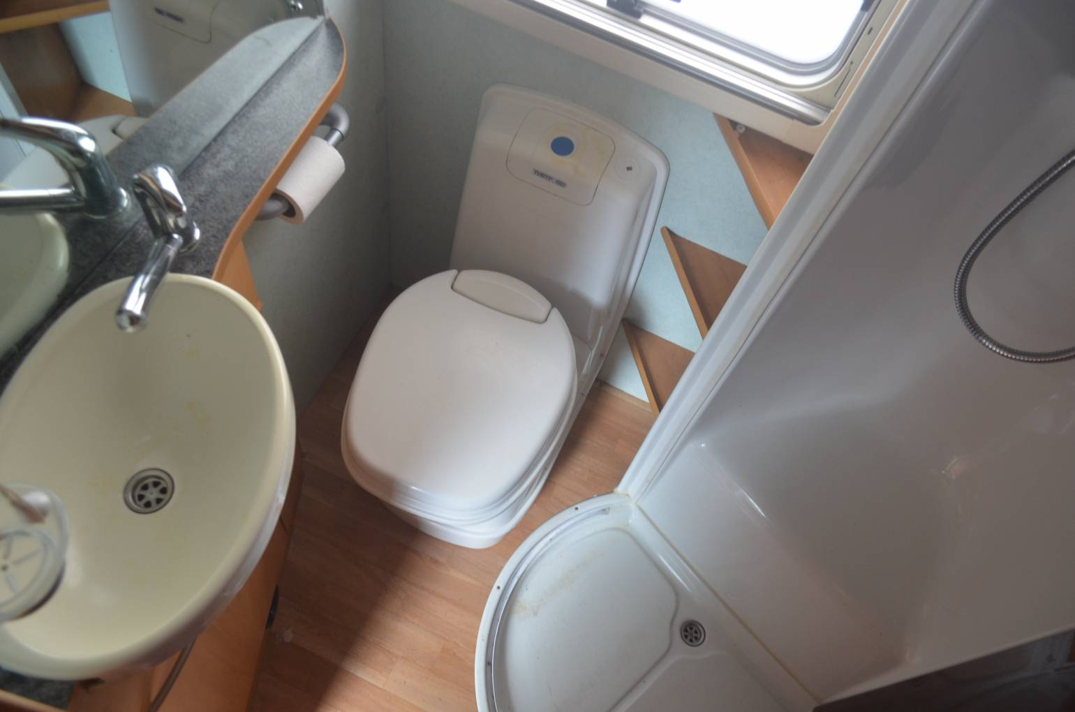Washroom has a separate shower, wash hand basin, toilet and a vanity unit. Excellent storage throughout the motorhome.