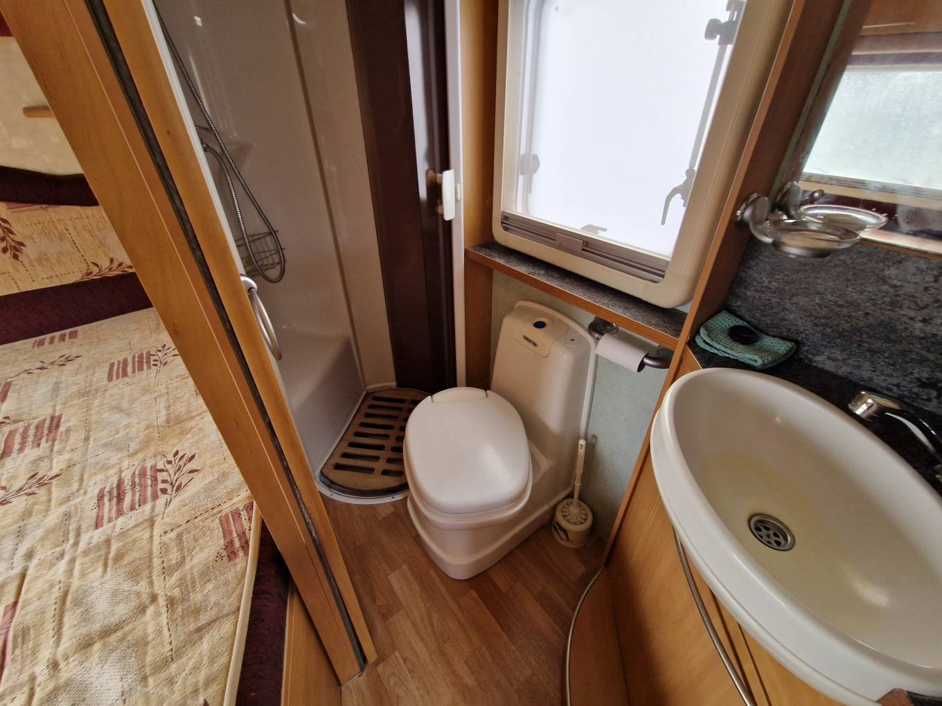 Moving down the vehicle to the rear you have the bathroom that has a separate shower with screen, cassette toilet, sink vanity unit with mirror and storage.