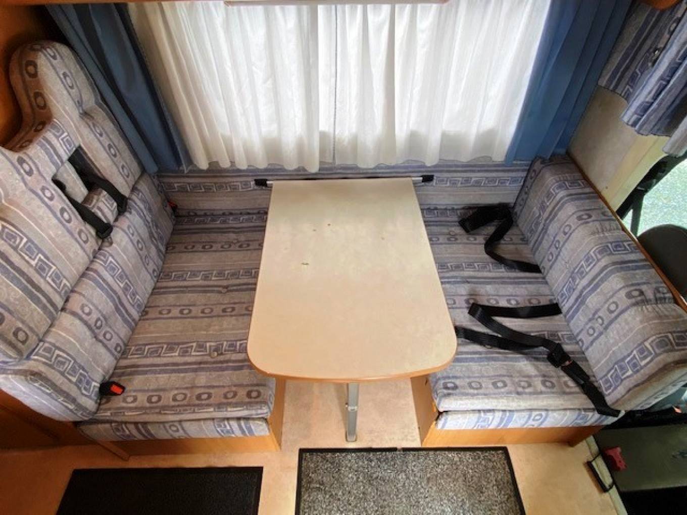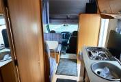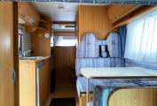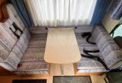 Step inside and the lounge/dining area is in front of you, with a large dining table and two forward facing and two rearward facing seats that all have seat belts, so six travelling seats in total; this area can convert to a double bed in the evening. A wind-up sunroof provides plenty of natural daylight, upper aircraft style storage lockers and under-seat storage available The large over cab bed is accessed via a ladder and has privacy curtains, reading light and a window.