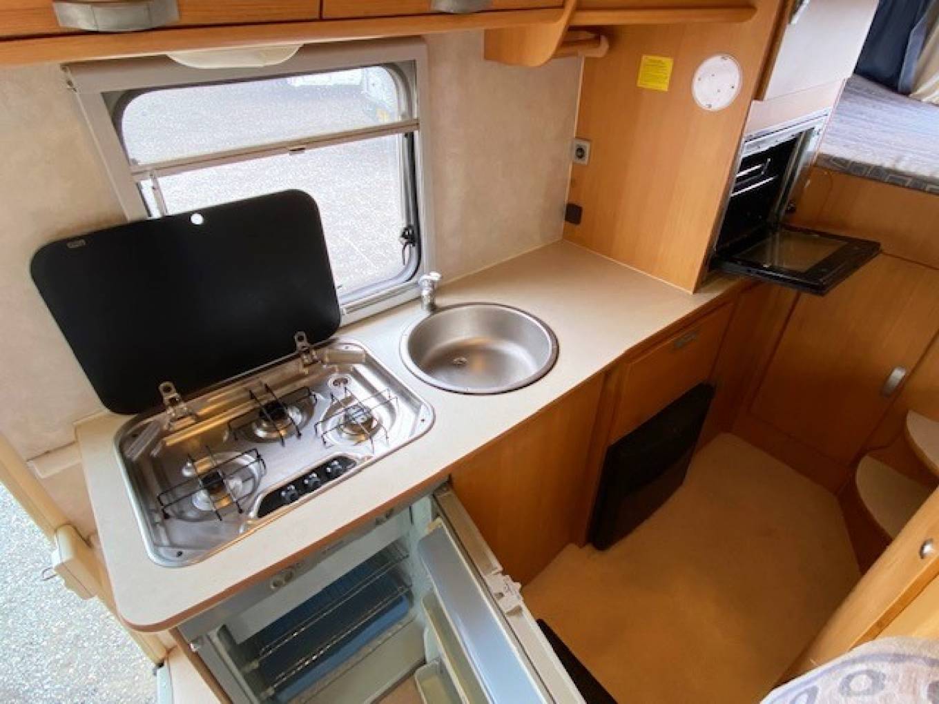 The kitchen is quite spacious with a round stainless steel sink and chrome mixer tap, a four gas burner hob with gas grill and oven beneath, plus a Dometic three-way powered fridge with freezer box. Plenty of cabinets and cupboards to store away your holiday provisions.