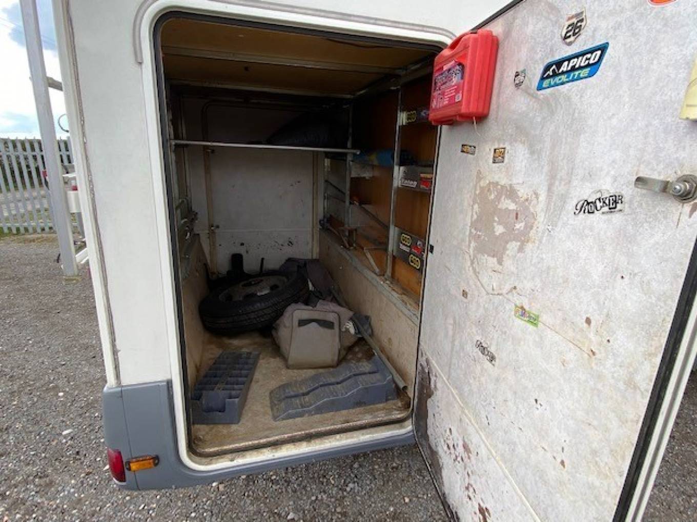 At the rear there is a large transverse double bed with steps provided to access the bed and a door beneath gives access to the garage. The rear garage has two large side doors, the door opening size is: Width 84cm; Height 137cm; Diagonal 157cm. A checker-plate floor with anchor points, so that you can carry a motorbike, scooters or bicycles with ease. The vehicle also has air suspension at the rear, aiding ride comfort and stability. Overall the condition is fair with wear and tear. The garage has been well used for Moto Cross. A bike rack is fitted to the rear.