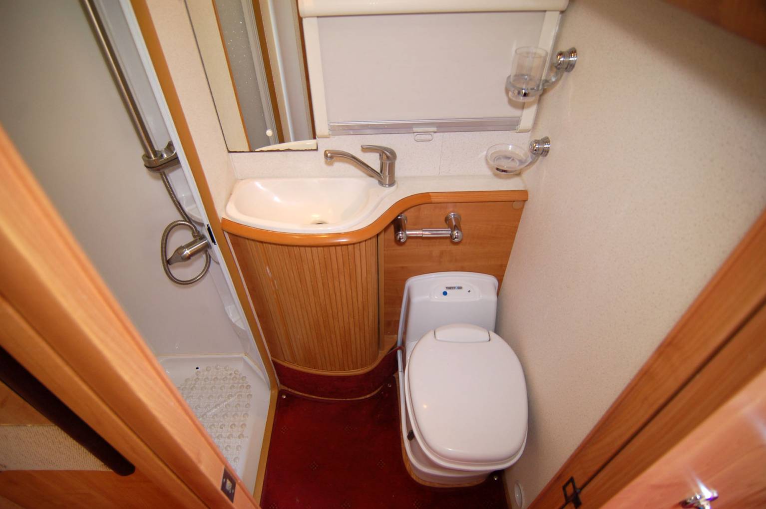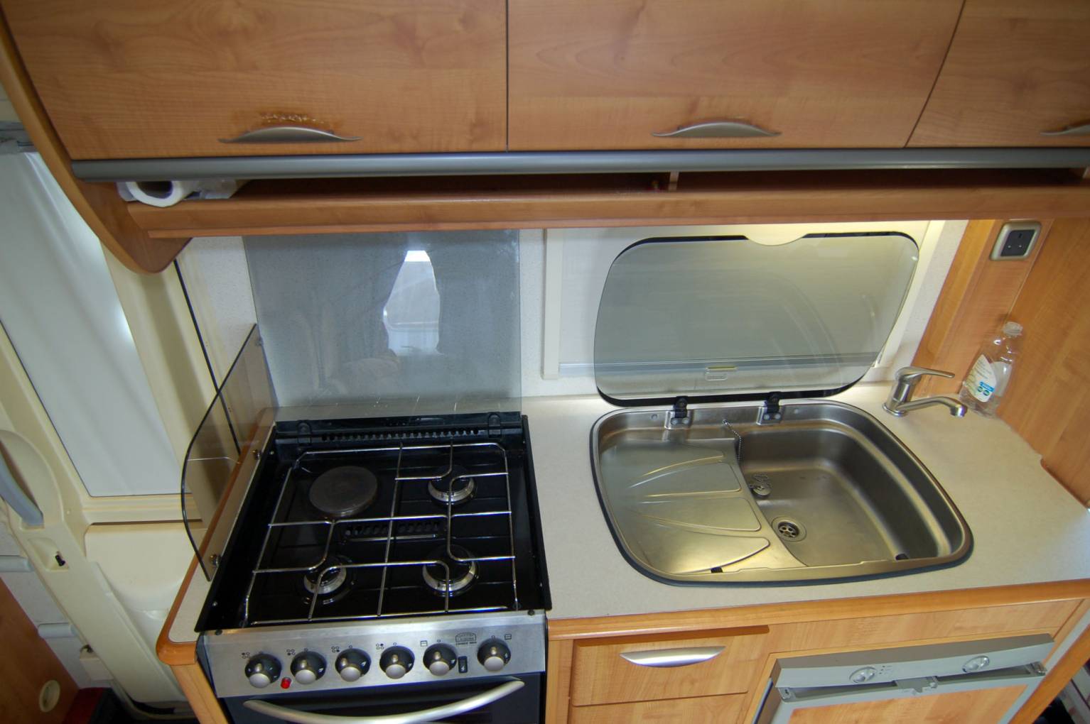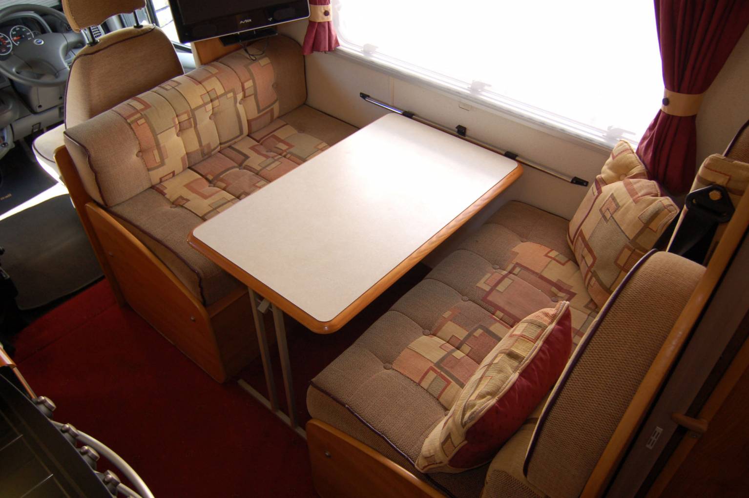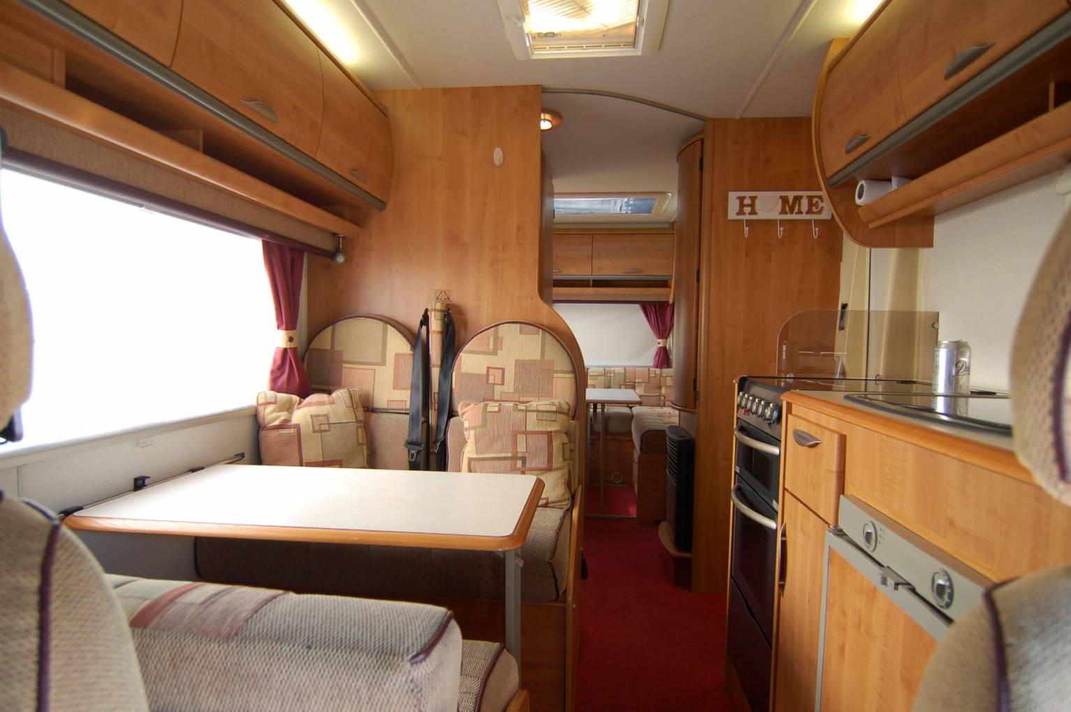 Onboard facilities include a very well equipped kitchen, reversible roof fan, washroom with separate shower cubicle in addition to a toilet and vanity sink, dual fuel heating and hot water systems. For entertainment there is a fitted Avtex TV DVD combo with roof mounted aerial, plus there is an untested fitted Megasat satellite system with roof mounted enclosed dome. Sleeping arrangements are straightforward with a generous overcab bed, central bed made from the dinette and another double at the rear. Outside goodies include the roll out sun canopy, external bbq point and a gas bbq, external shower, 2 bike rack and access to the rear underbed store.