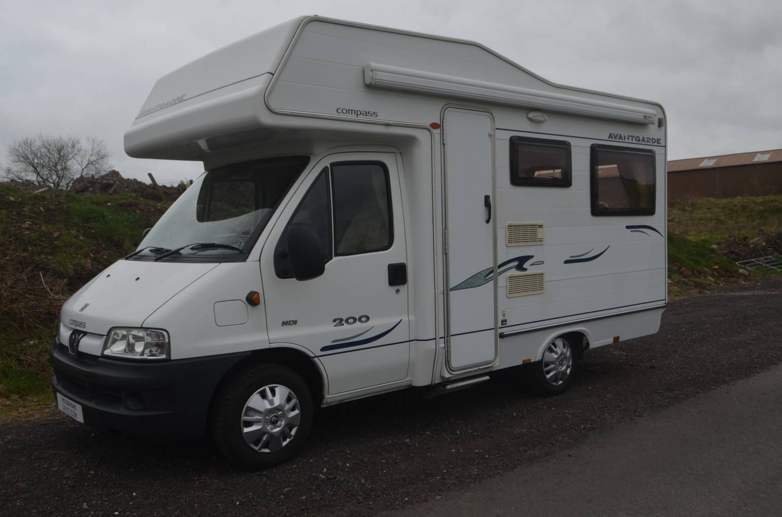 2005 COMPASS AVANTGARDE 200 COACH BUILT MOTORHOME FOR SALE. 35,414 miles travelled. This well presented model makes great use of space and has sleeping places for 4 people and 2 travelling seat belts. Based on a Peugeot chassis with a 1997cc engine and 5 speed manual transmission. This motorhome can be driven on a standard driving licence. The rear lounge area can be made up into a double bed and there is another double above the cab area. The compact kitchen has a full sized cooker, sink and 3 way fridge freezer. Bathroom has a cassette toilet, sink and a shower. Extras fitted to the motorhome include a wind out awning and a bike rack.