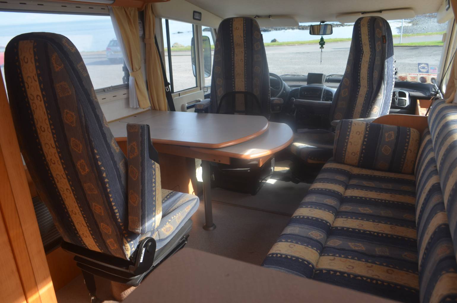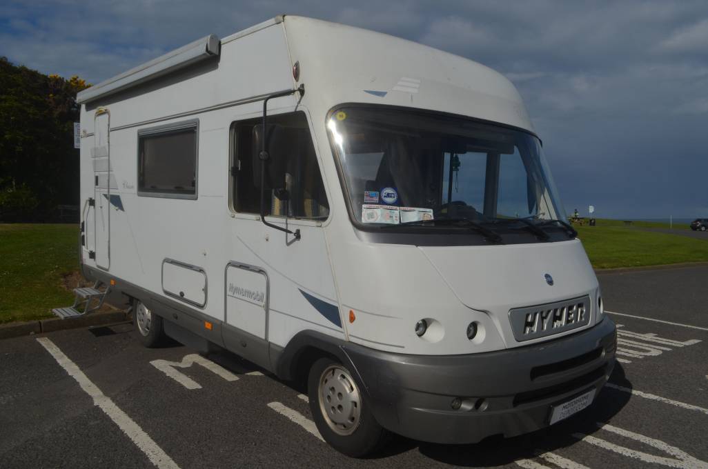 2005 LEFT HAND DRIVE HYMER B584 A CLASS MOTORHOME FOR SALE. This A class motorhome is presented in great condition. 78,000 miles/123,000 km travelled. MOT April 2022 . Based on a Fiat 2.8Td chassis with a 5 speed manual transmission. Approximately 6 metres in length and 2.2 metres in width. The spacious layout has sleeping places for 3 people and 3 travelling seat belts. Cab area has a panoramic windscreen, remi blinds, cab air con, radio. reverse camera, dash cam, and 2 swivelling captains chairs. The large drop down bed above the cab will sleep 2 people and the other bed makes up from the bench seat in the dinning area. End kitchen has a 3 burner gas hob, 3 way fridge freezer and a sink. End bathroom has a shower, cassette toilet, wash hand basin and a vanity mirror. The forward facing lounge has an extendable table and accommodates 5/6 people for dinning. Extras fitted to the motorhome include a Wind out awning, 170 watt solar panel. Tv, 2 leisure batteries, bike rack and Gas low refillable bottles.