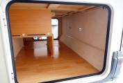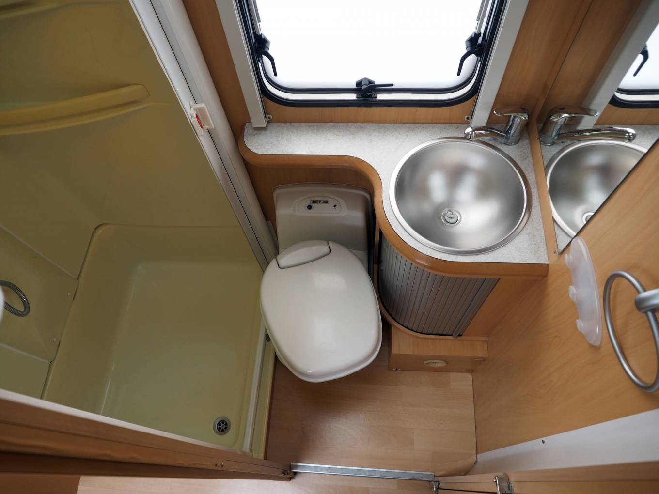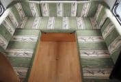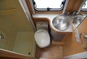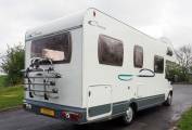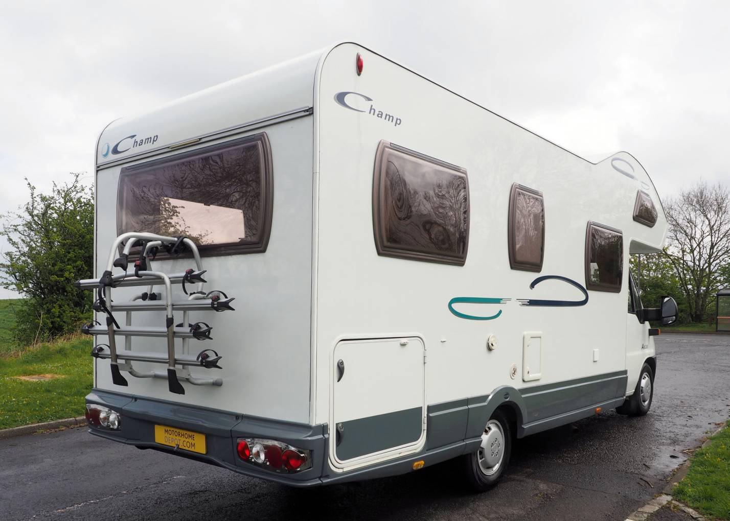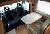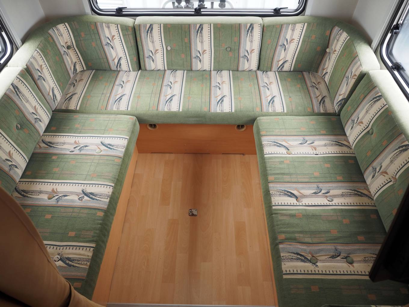Essentally the layout comprises of a forward dinette with swivel cab seats, centre washroom and kitchen, rear U shaped lounge over a low garage store. The rear dinette converts into a double bed and there is an overcab bed at the front. Outside, there is a wind out awning sunshade and four bike rack.