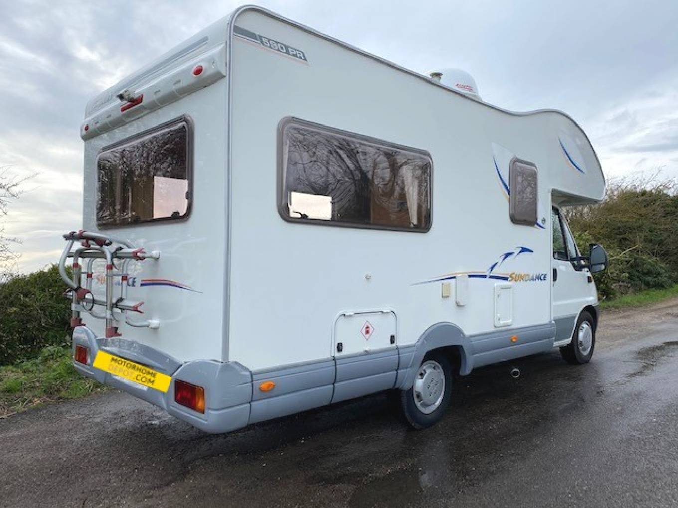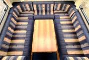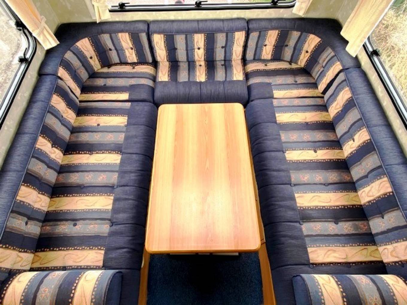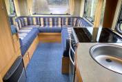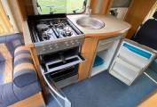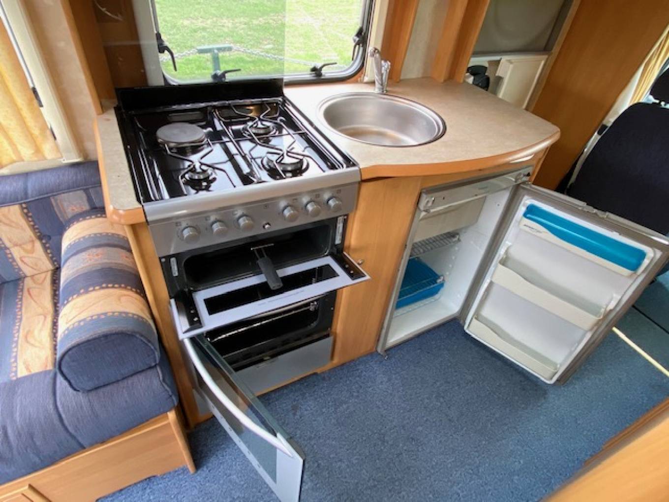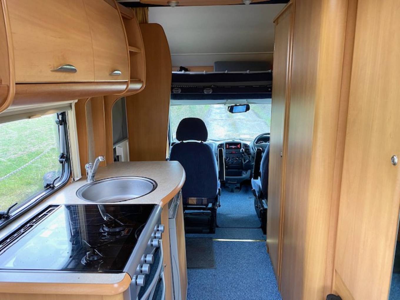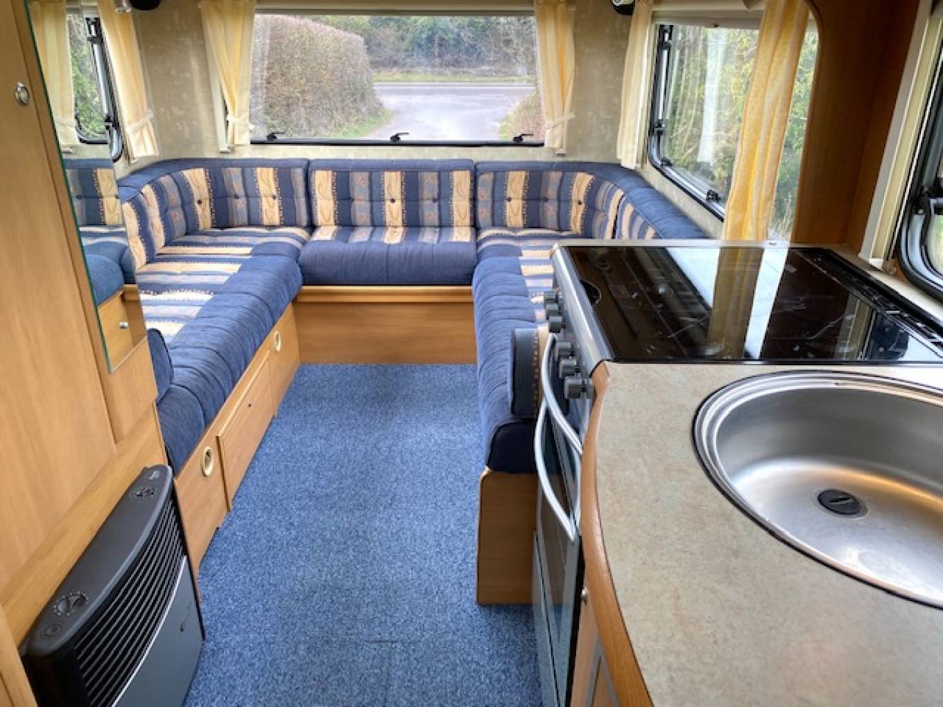 This 4-berth Swift 590PR has the popular U-Shaped rear lounge that is spacious and comfortable. It can readily be used for dining by utilising the collapsible table and easily converts in to a large double bed or two single beds. The kitchen has a full cooker/grill and dual gas and electric hob; refrigerator with freezer compartment, sink and several storage cupboards. There is a large overhead cab bed that lifts to enable easier access to the cab, a washroom with toilet, shower and sink with vanity unit below. There are plenty of eye level cupboards, under seat storage space and a second radio/cd player has been installed at the rear connected to speakers in each corner. Based on the Fiat Ducato chassis with 2.3L Diesel engine and 5-speed manual gearbox the engine pulls nicely with under 40000 miles on the clock. Non standard additional features include: