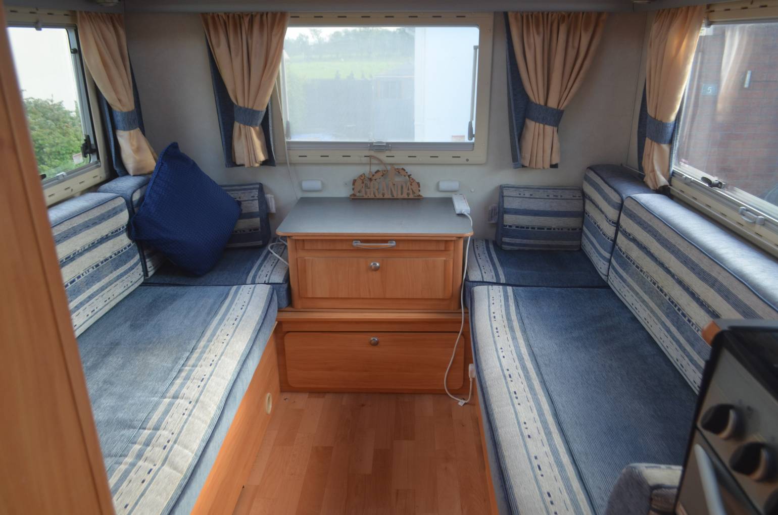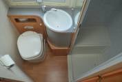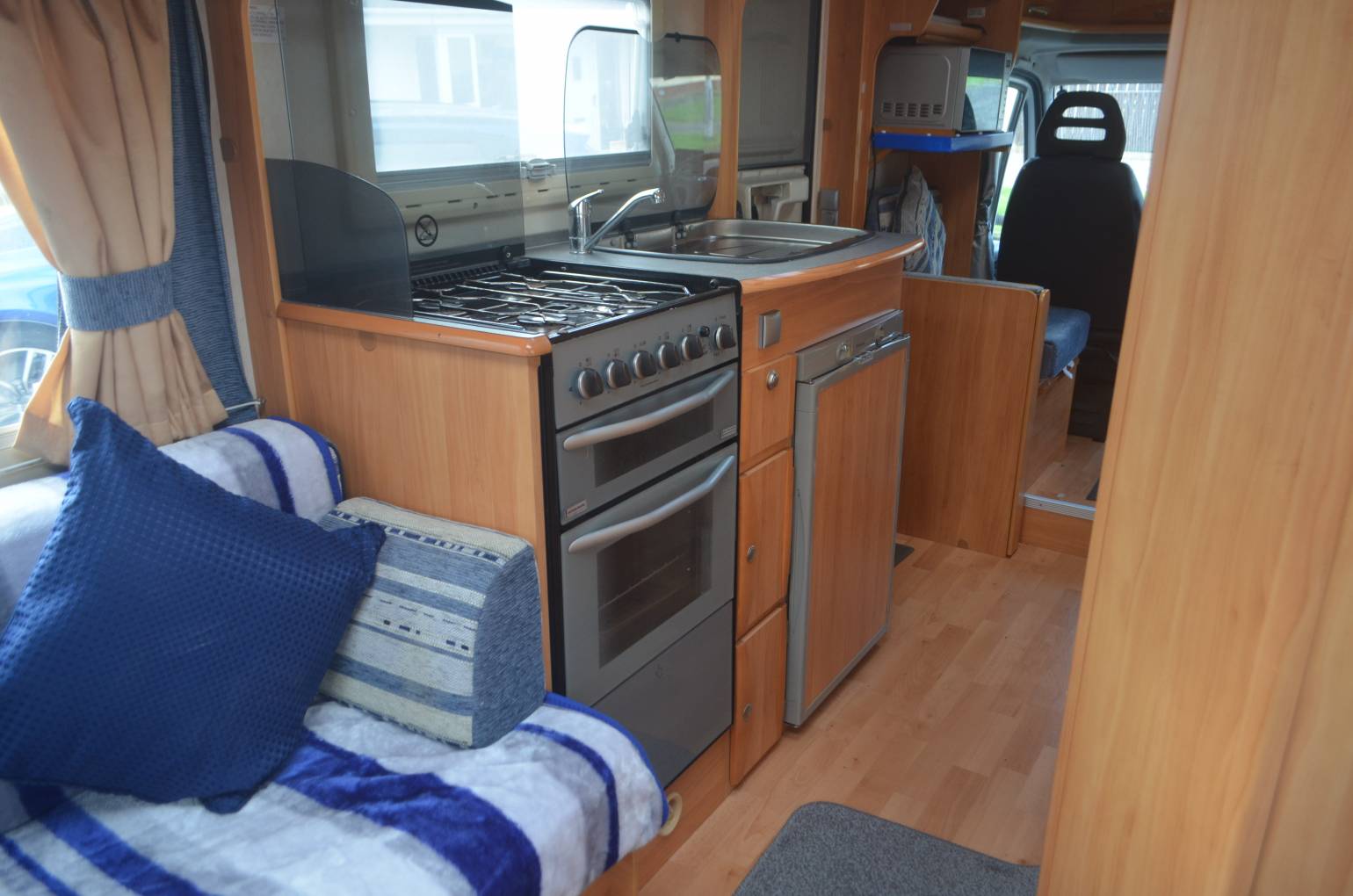 At the rear the U shaped lounge can be used for dining and can also convert into a large double bed or 2 singles. Midship kitchen is fully equipped with an oven, grill, gas hob, sink, microwave and a 3 way fridge freezer. At the front you have 2 bench seats and this area will also make up into a bed. Washroom is spacious and has a separate shower cubicle, wash hand basin and a cassette toilet.