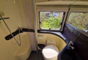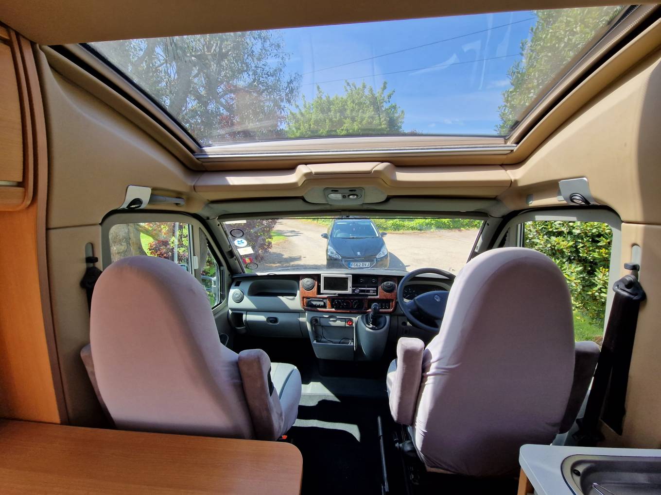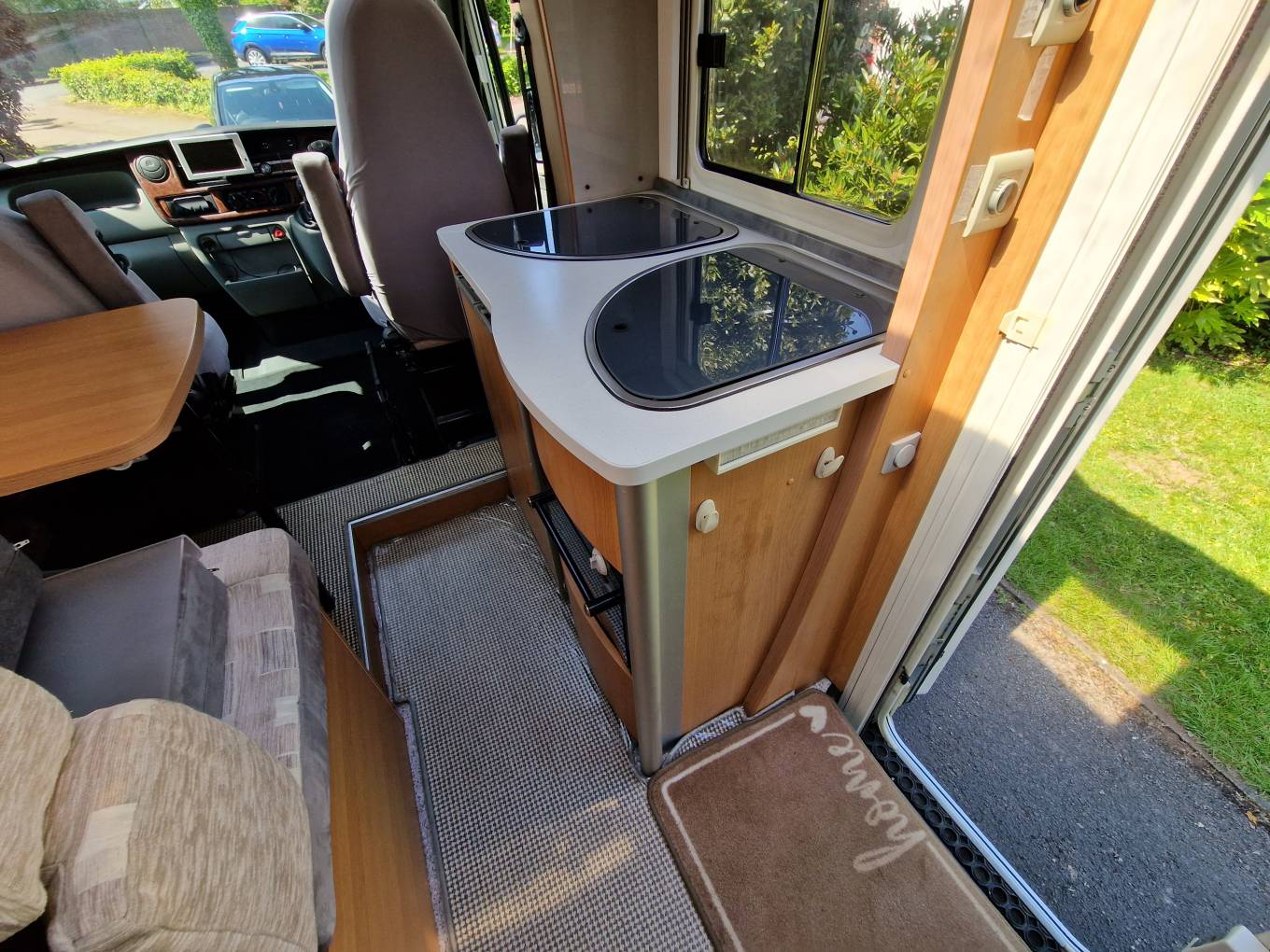 It's a high quality German-built motorhome and, from the front, consists of 2 Captain Chairs which swivel to form a dining area with the seats behind. This is a very sociable area with drop down TV, dining table and two travelling seat belts. To the right of the habitation door is the kitchen with hob, oven, sink, large refrigerator and plenty of storage cupboards. There is a washroom with sink, wc and separate shower cubicle and at the rear are the fixed single beds over the garage which is great for storage. There are lights throughout the motorhome as well as black-out blinds and fly screens. The front and mid-section are light and airy having a panoramic sunroof.