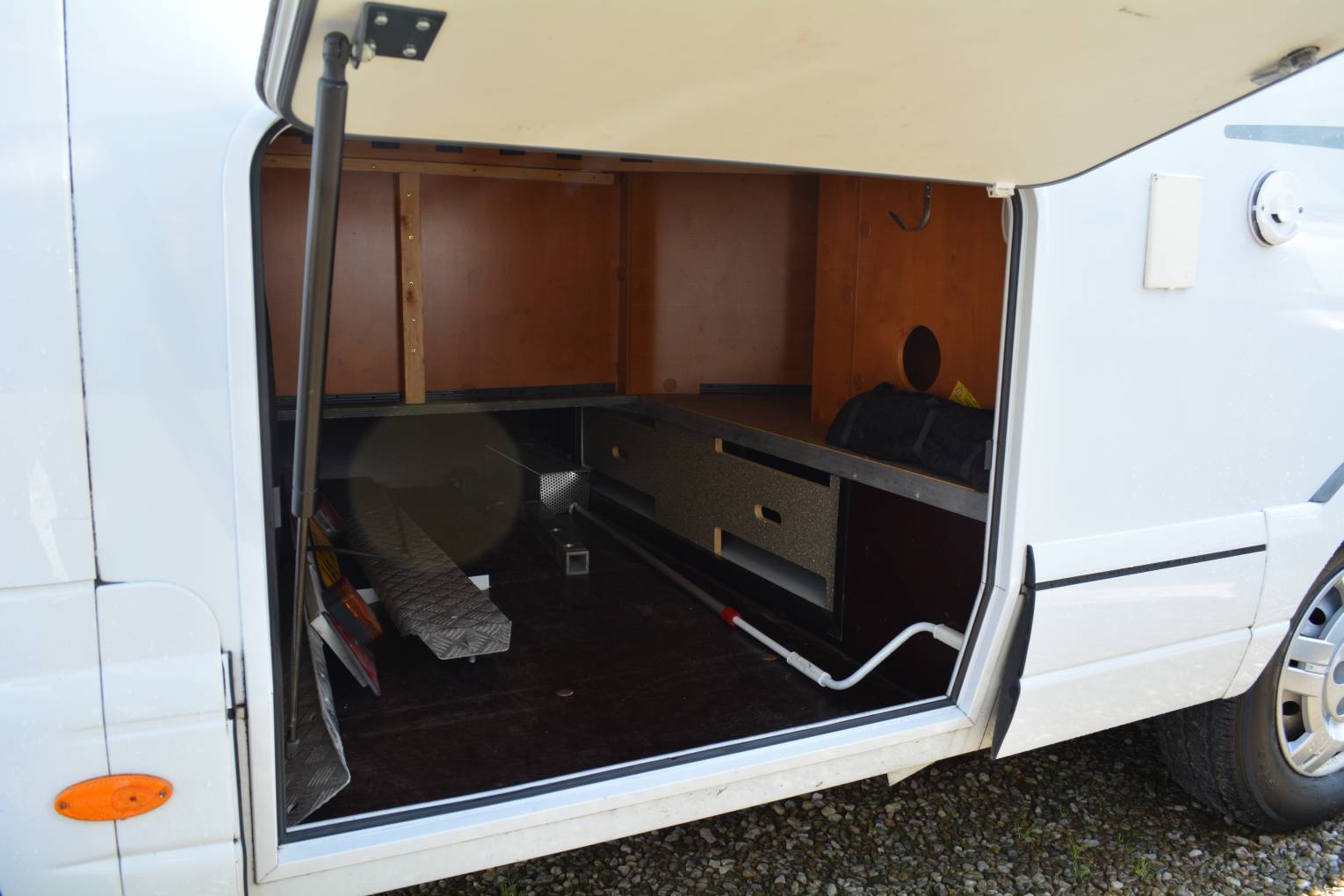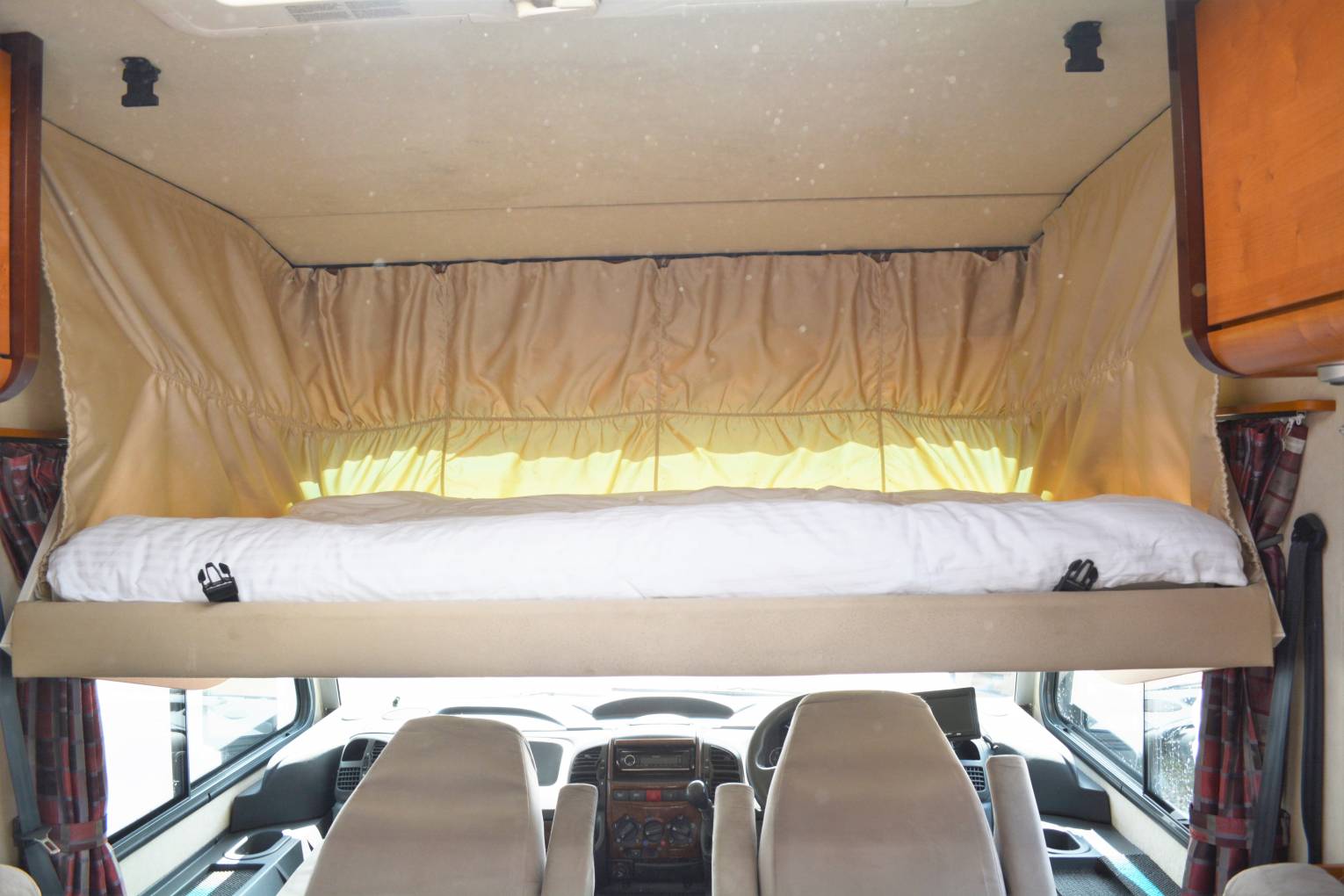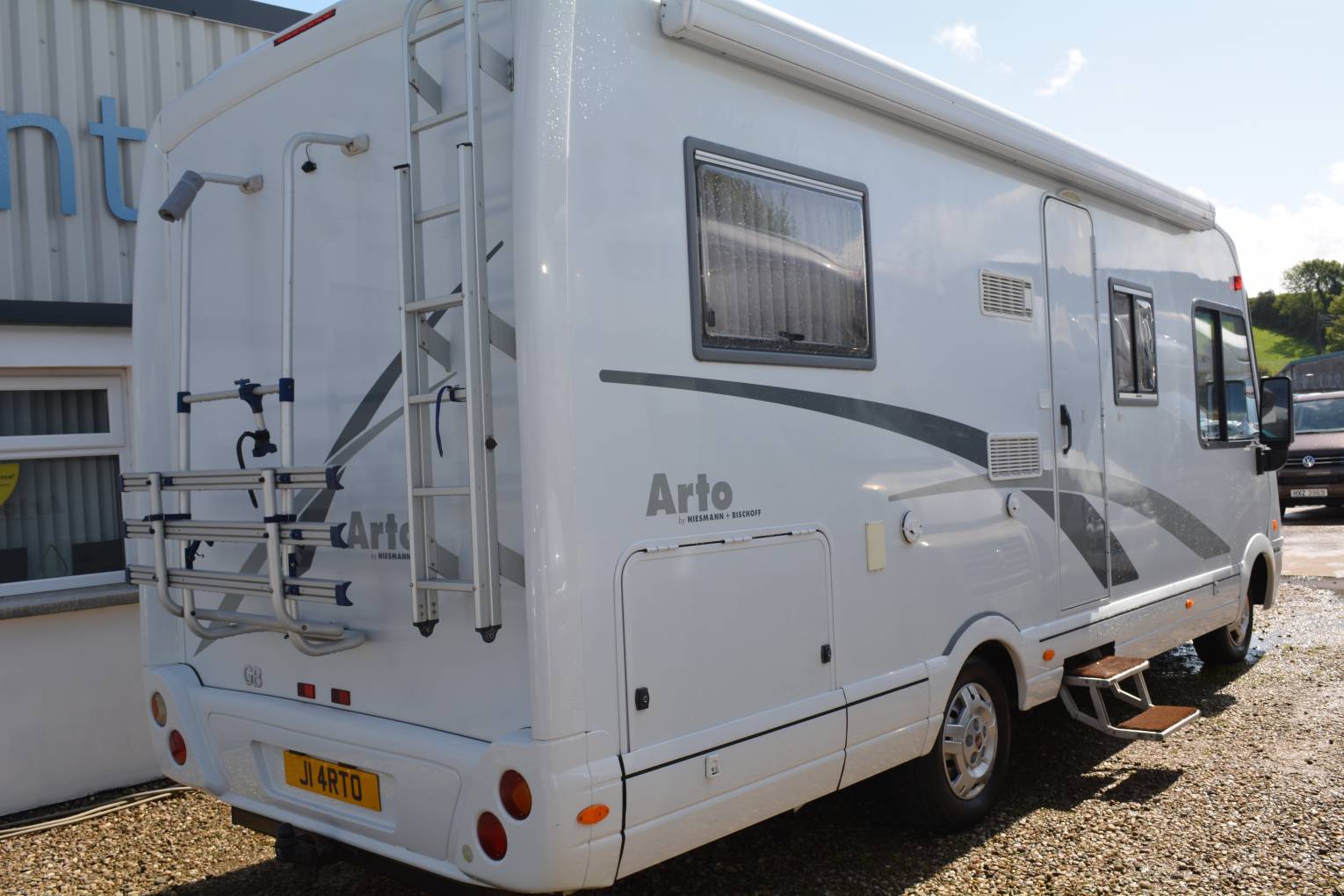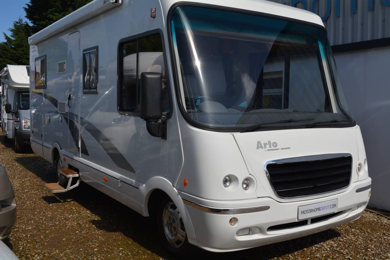 The Niesmann & Bischoff luxury brand is renowned for quality and refinement and this example does not disappoint. A traditional and well proven layout offers sleeping places for 4 persons with a rear corner double bed and a drop down double over the cabin. The lounge area is spacious and practical with twin swivel Isri chairs and travel seats for 4 persons. A large hold area to the rear provides ample space for cargo which can also be accessed from inside. Other features include separate shower, full cooking facilities, awning, satellite TV, bike rack and scooter rack. Sale includes full MOT, habitation inspection with gas certificate, full engine service and one years warranty. Max weight of 4000kg with an overall length of 6.89 metres. FINANCE AND PART EXCHANGE WELCOME. PLEASE CALL FOR FURTHER DETAILS.