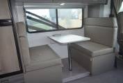 In the lounge area you have sleeping areas for 4 people. The first double can be made up from the dining area and the long bench seat also converts easily into a double bed. The 2 captains chairs swivel round to face the lounge and kitchen. There is a slide out in the lounge to give you more space while parked and an air con unit on the roof.