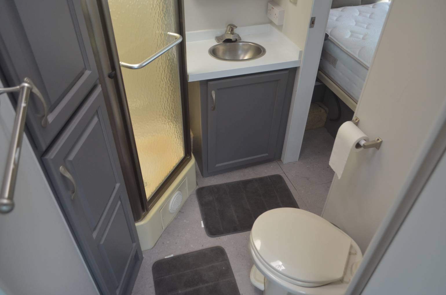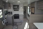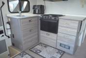 At the rear your bedroom has an island bed and built in furniture for all your travel essentials. This area has a slide out to add extra space and an air con unit fitted to keep you cool.