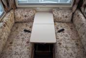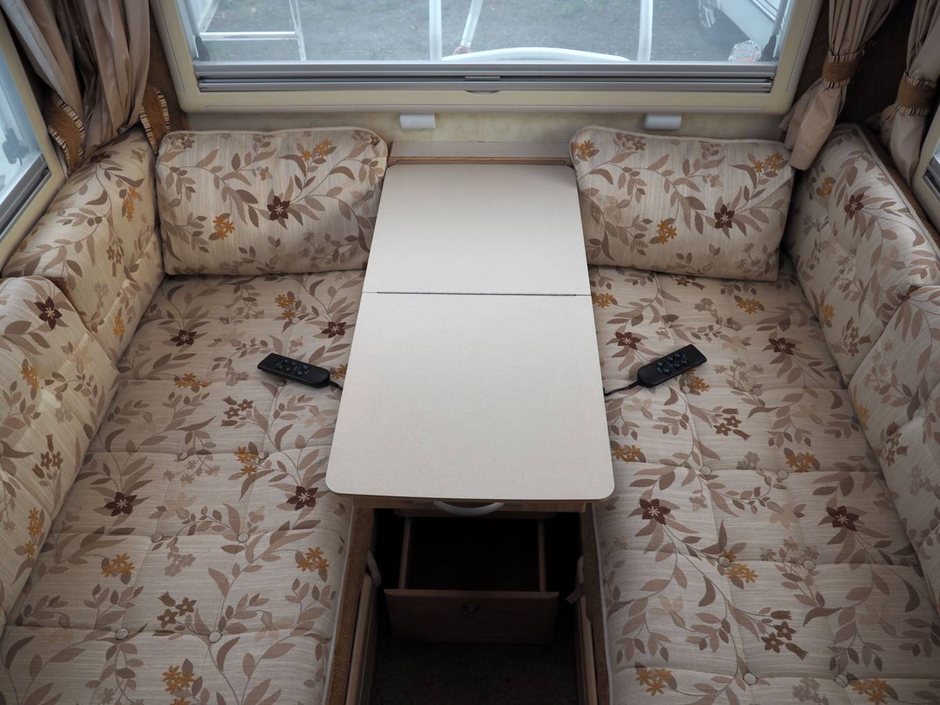 Midships you will find a full kitchen with gas hob, grill and oven, worktop extension. Opposite the kitchen is the washroom with vanity sink, shower and toilet. Adjacent is a dresser unit including drinks cabinet, upper storage and plentiful top locker and underbed space, including external access to the passenger side. Removeable carpets fitted.