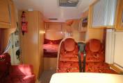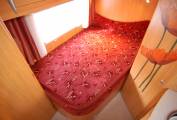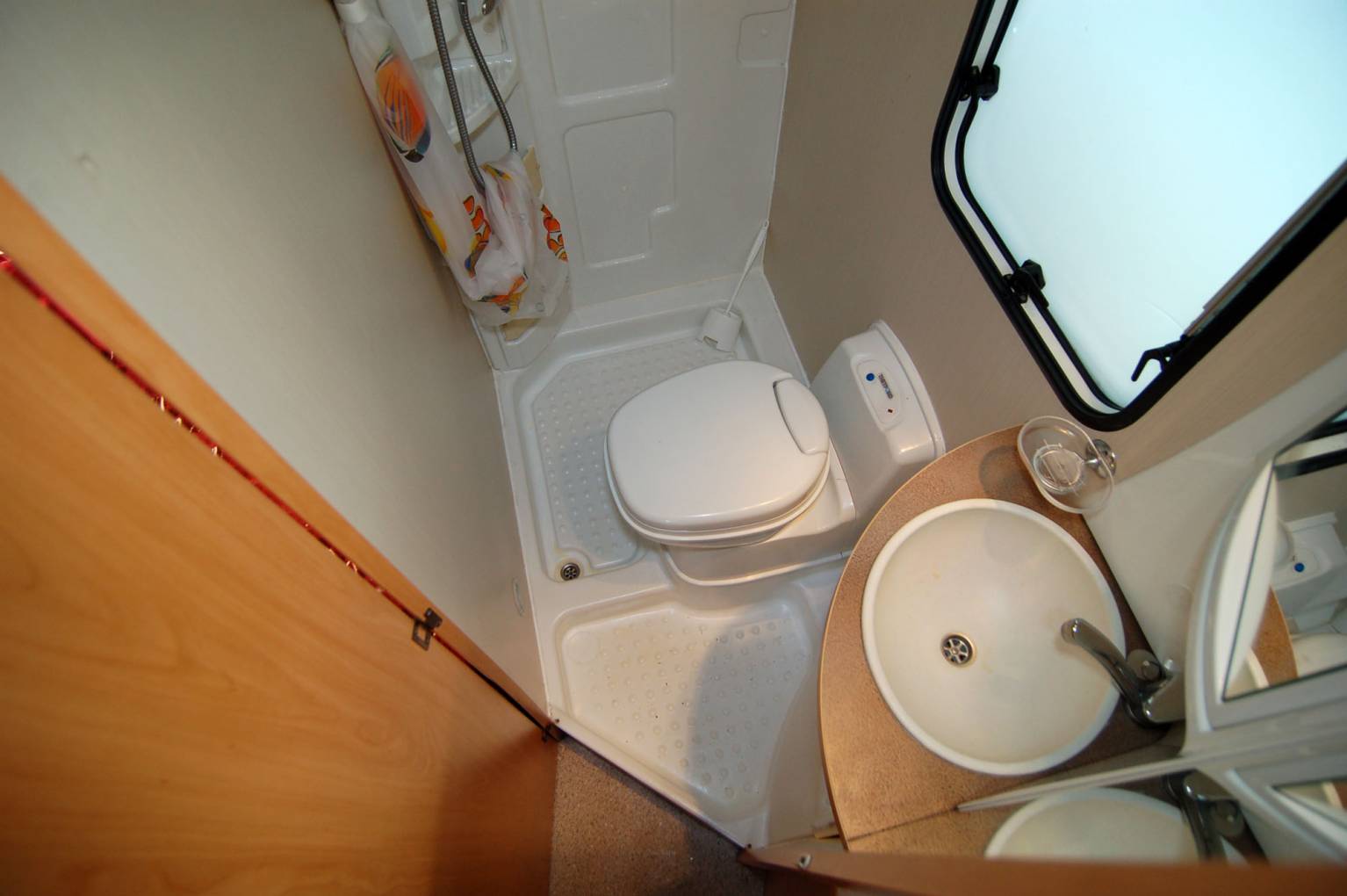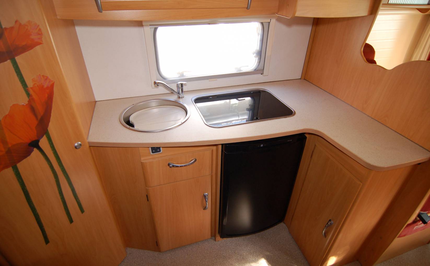 The kitchen has good worktop and storage space, a 3 burner hob, grill and fridge. Opposite this is a deep wardrobe and behind, the rear fixed bed with excellent storage space underneath, also accessible from outside. The washroom has the essential elements of shower, toilet and vanity sink. Domestic facilities include fresh and waste water tanks and gas powered heating and hot water systems.