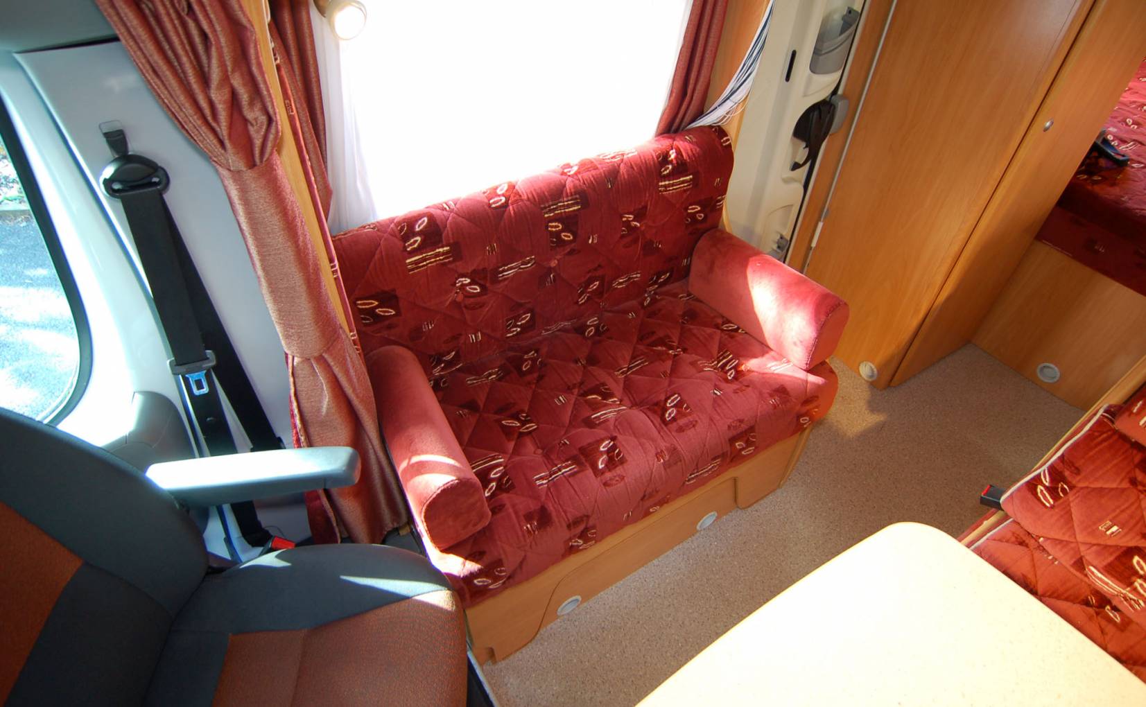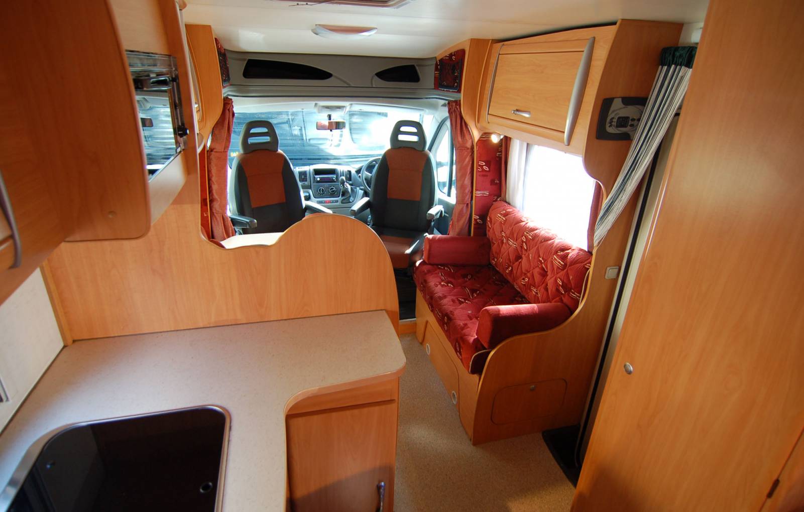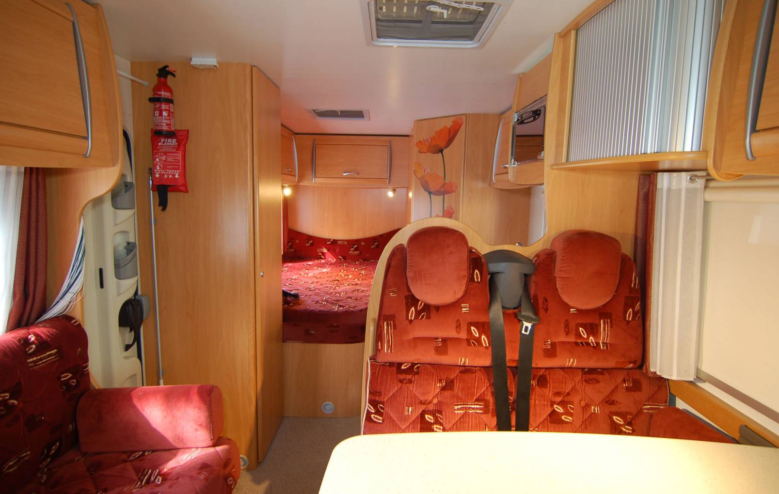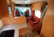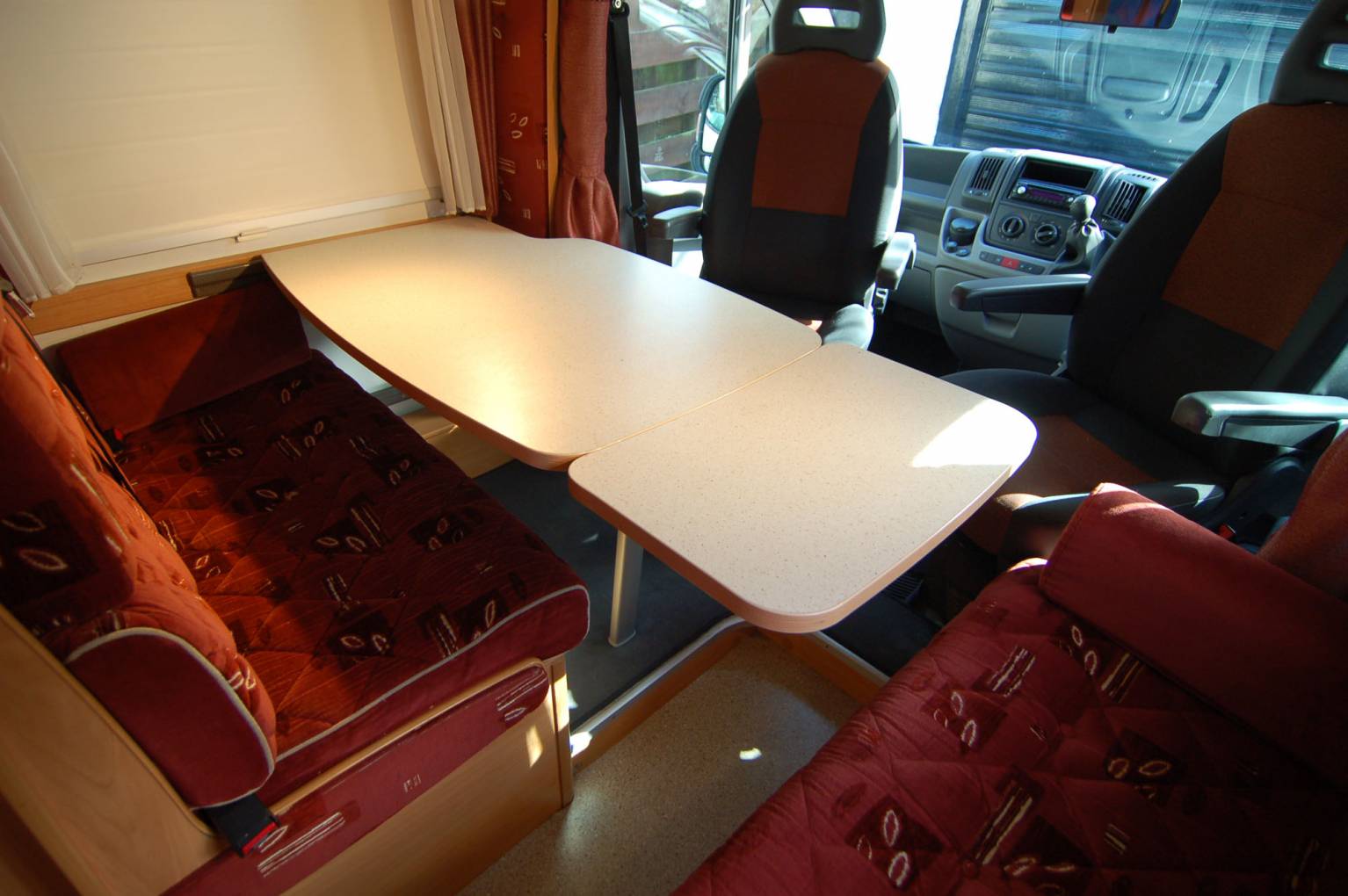The forward dinette can seat up to 6 for a social with the cab seats swivelled and has a table extension for mealtimes etc. There are two forward facing dinette seatbelts plus two in the cab, so this motorhome can carry 4 and can also sleep 4 with the second bed made up from the dinette, best considered as occasional use.
