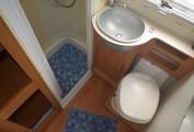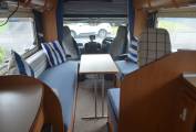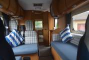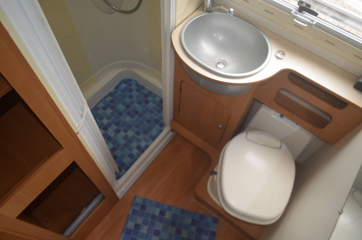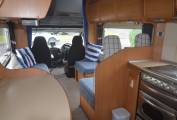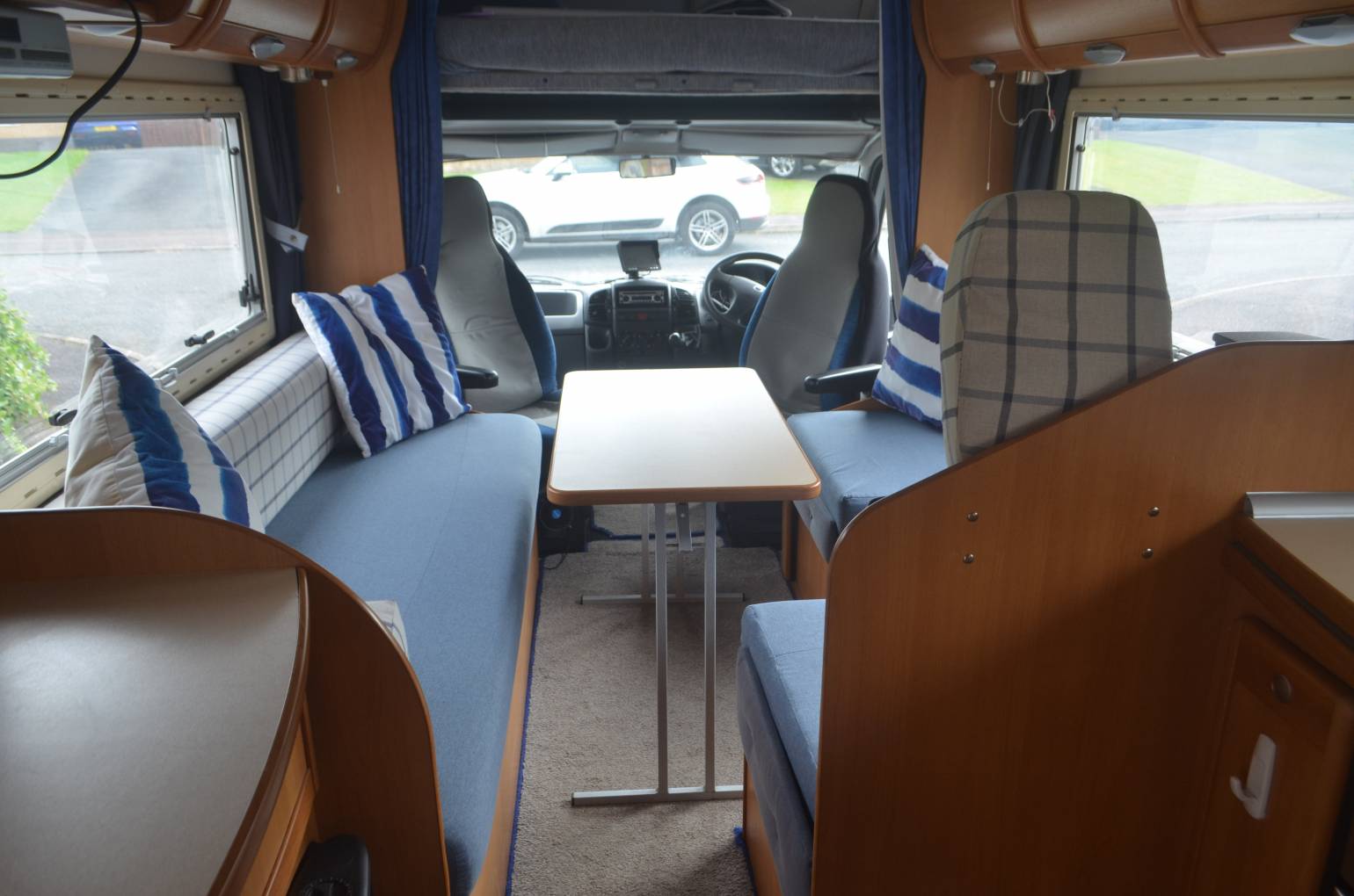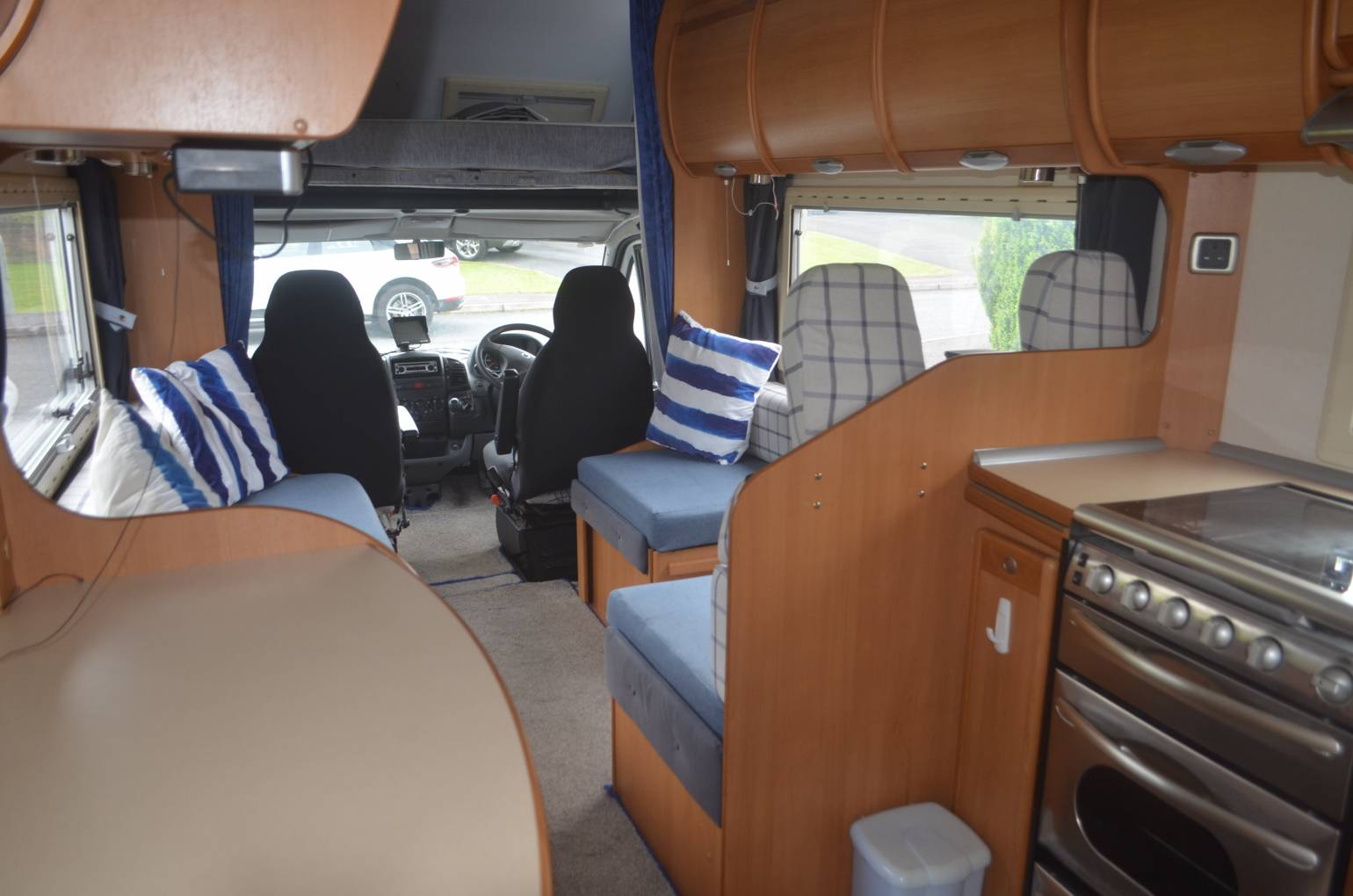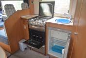 There is 4/5 spaces available for sleeping and and 4 travelling seat belts, The washroom at the rear has a separate shower cubicle, wash hand basin and a cassette toilet. Midship kitchen is fully equipped with a 3 way fridge freezer, sink, oven, 3 burner gas hob and plenty of storage lockers.