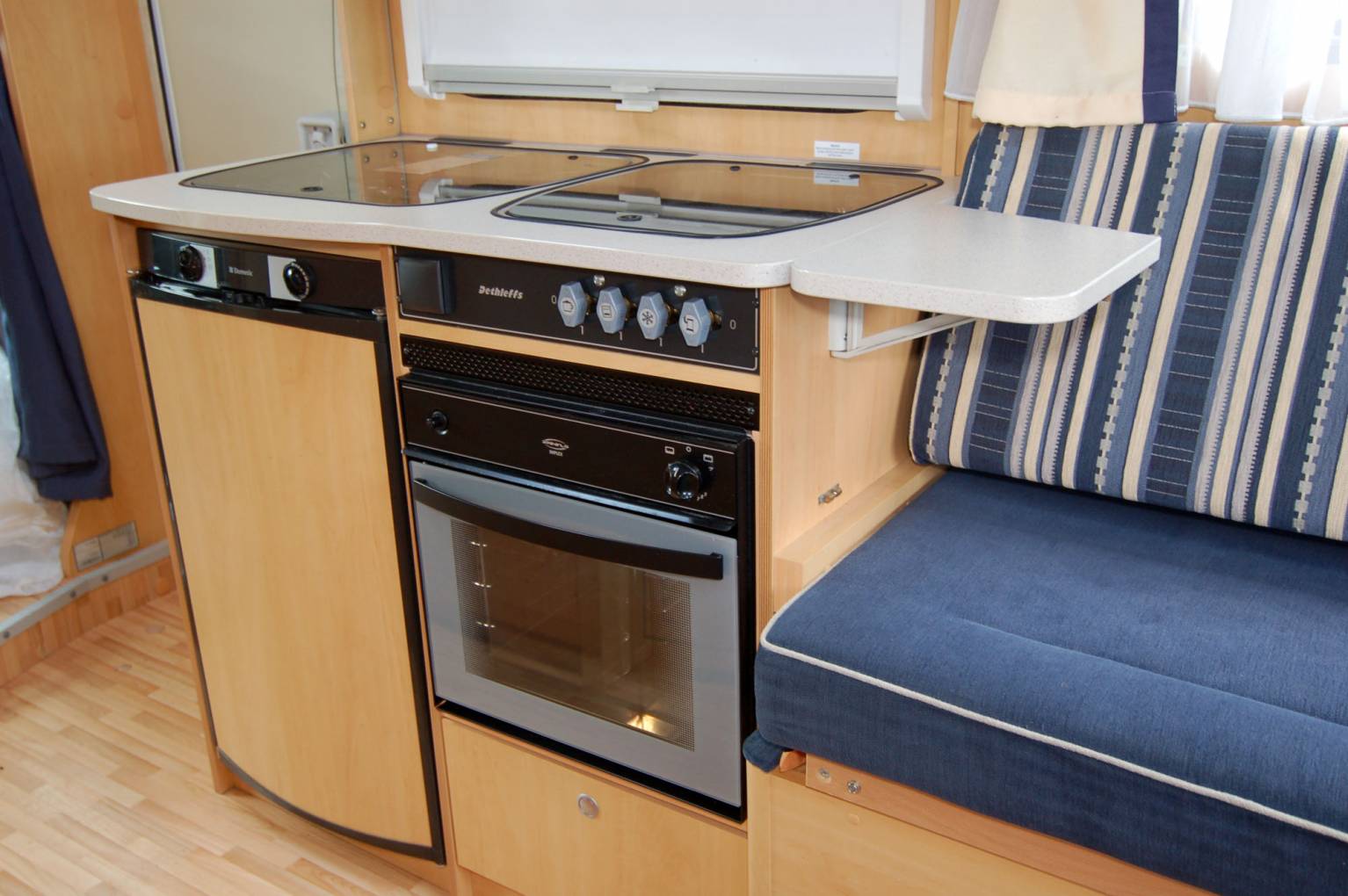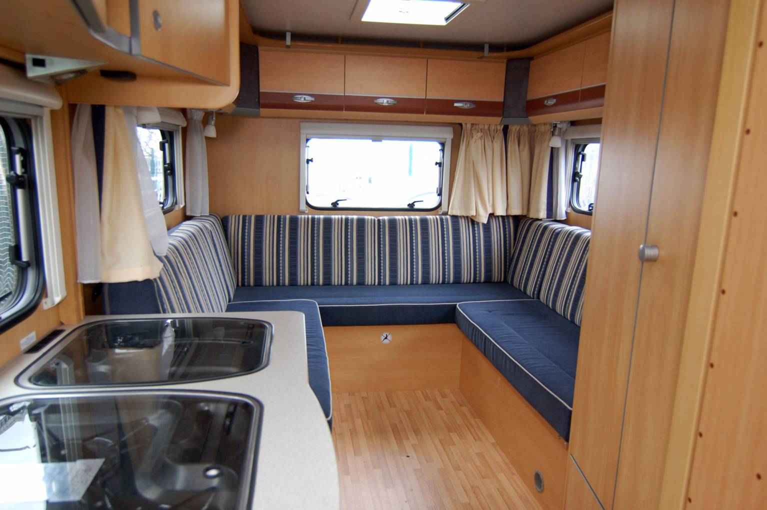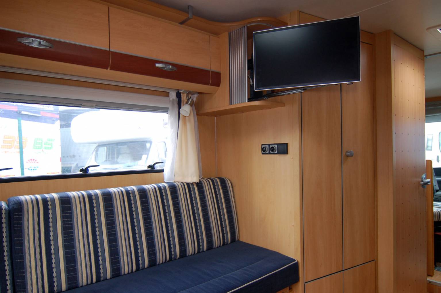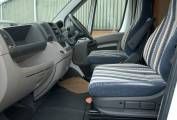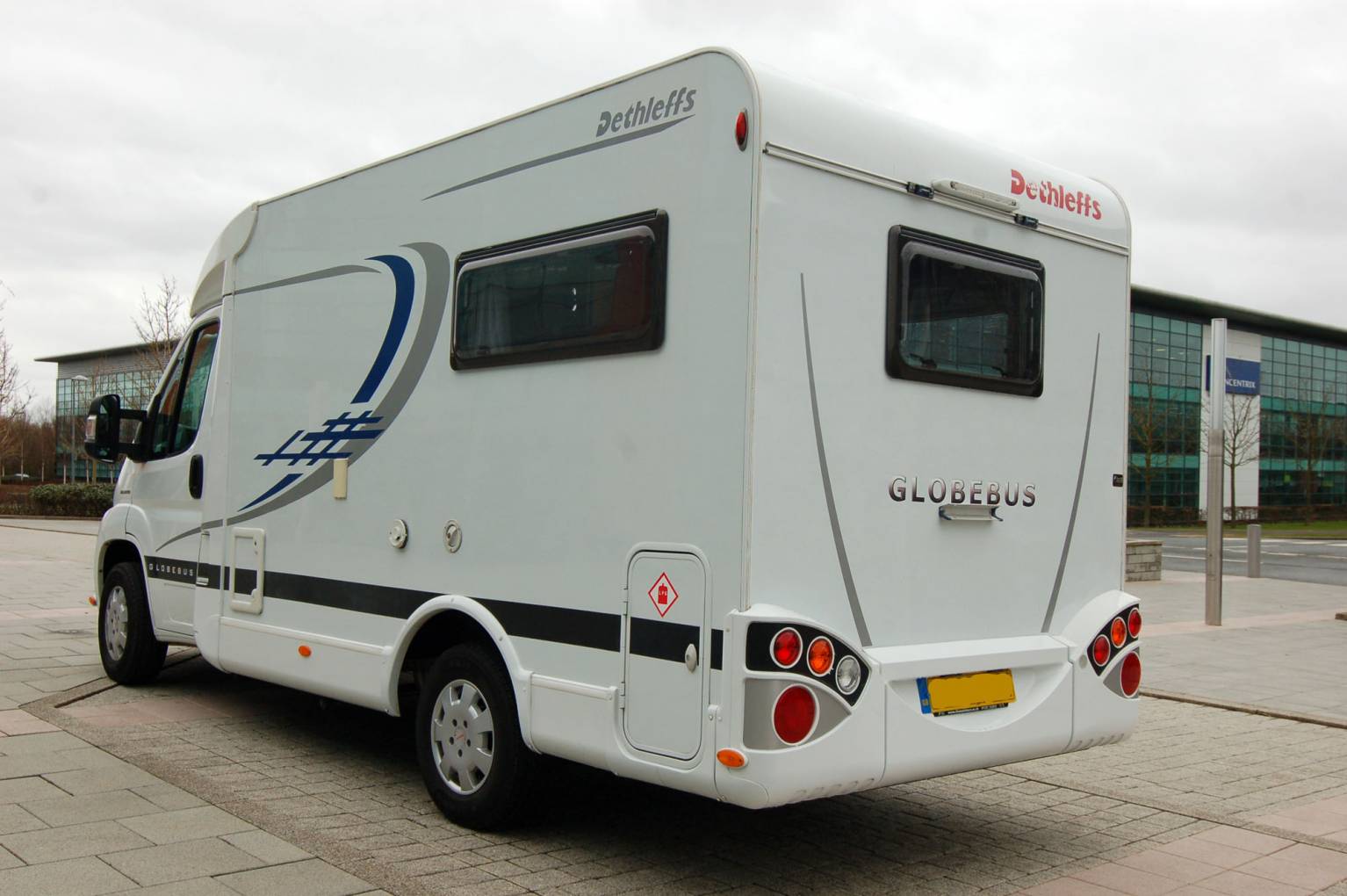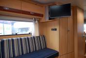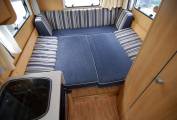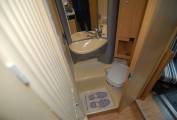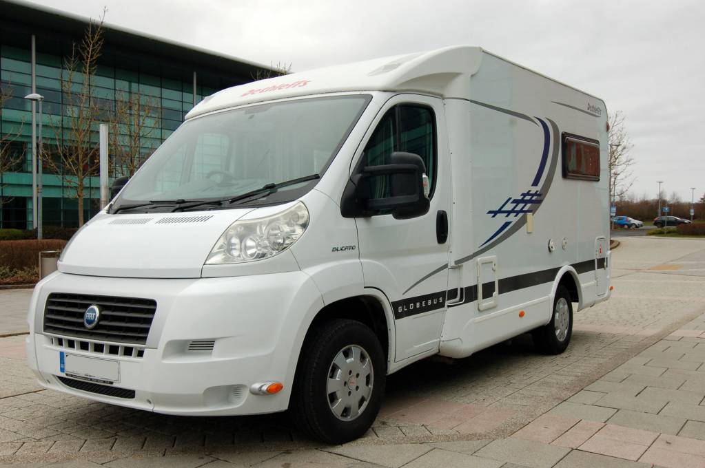 Here's a very neat and compact package, ideal for an active couple or individual. At just 6 metres long, the German built Globebus offers a raised rea lounge over an external store, centre kitchen and washroom. It has a low body style and will fit neatly into small spaces. It drives very nimbly too. Fully equipped with fresh and waste water tanks, hot water and heating, oven, grill etc. The washroom has an ingenious solid screen to create an enclosed shower cubicle if required. Outside, the low store under the lounge can accomodate walking, climbing or other sports gear.