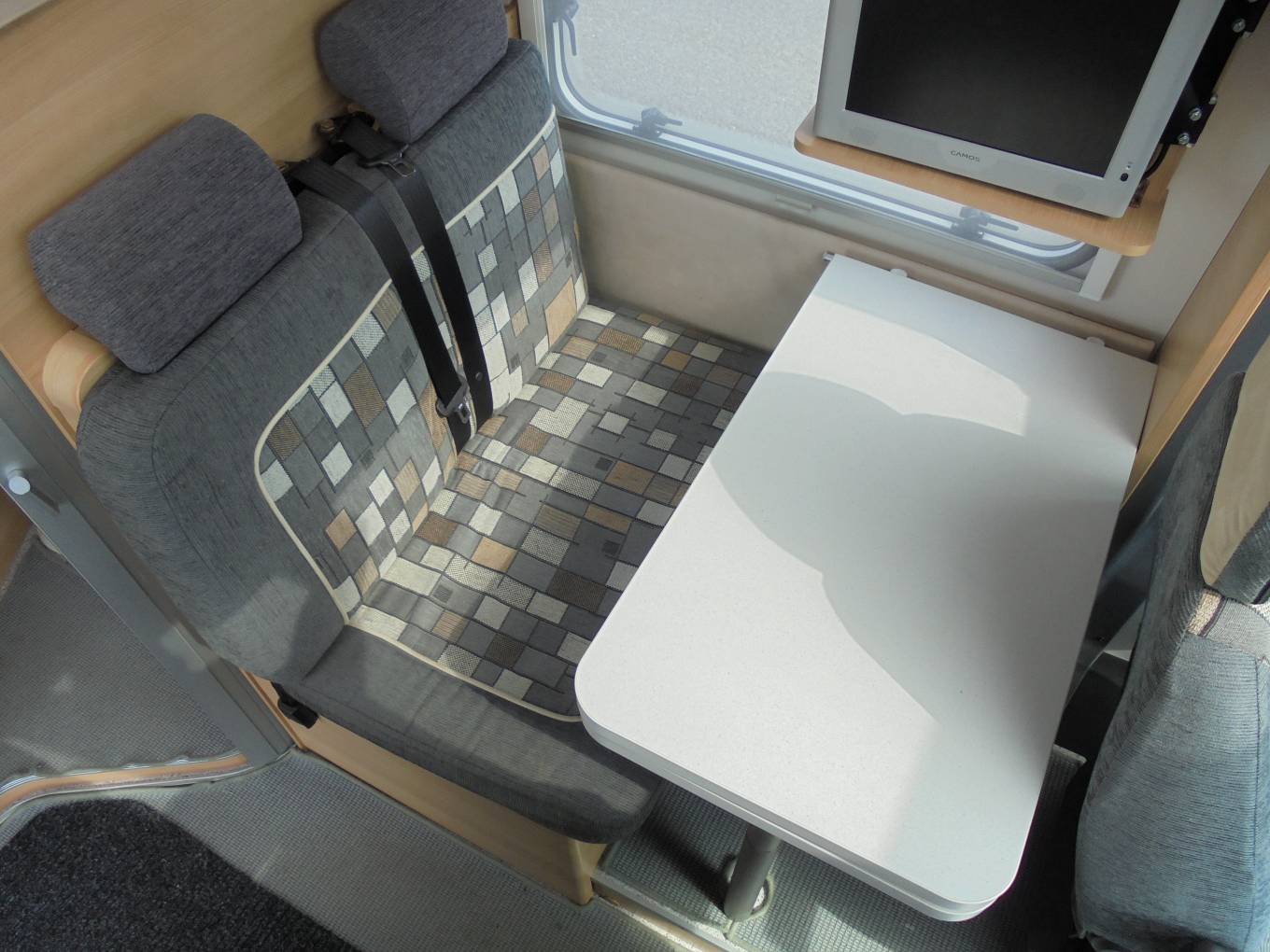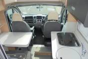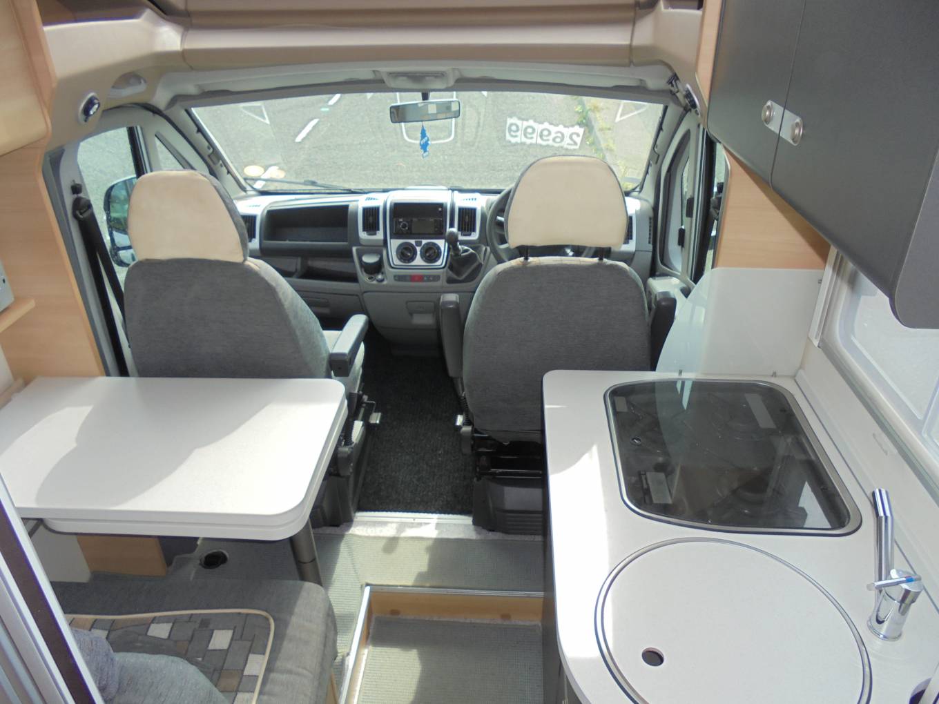 Both front seats swivel to give extra space and the large roof window gives this motorhome loads of natural light.